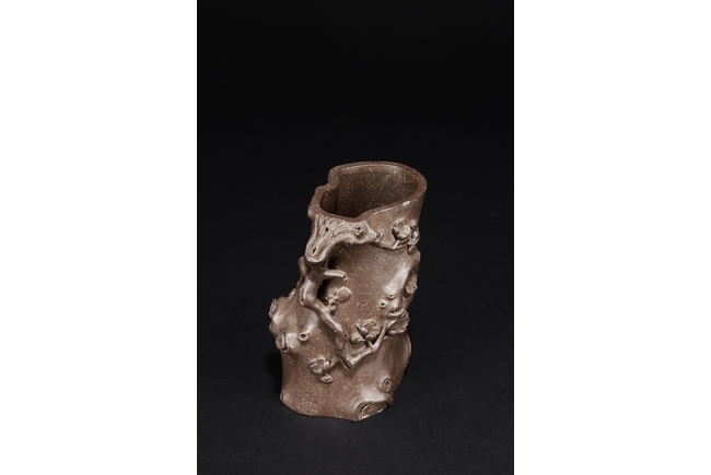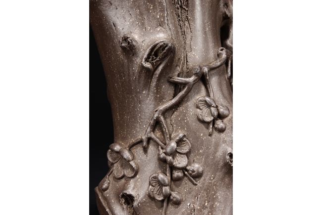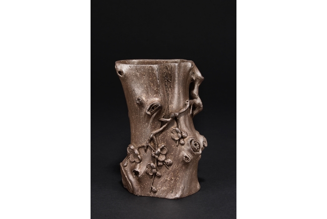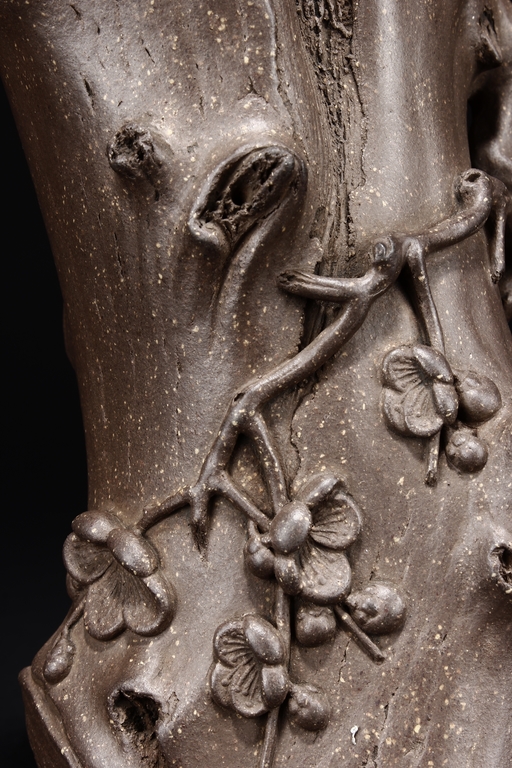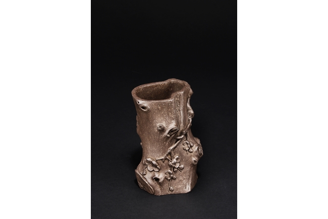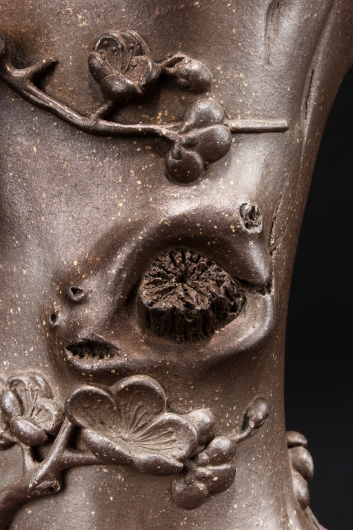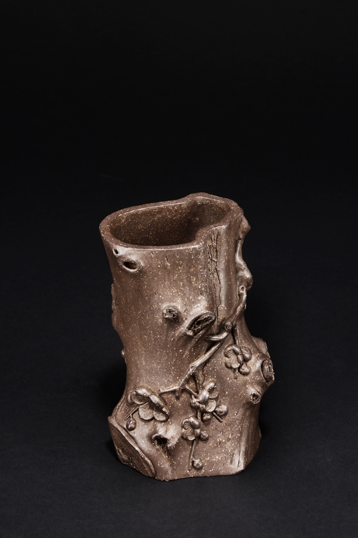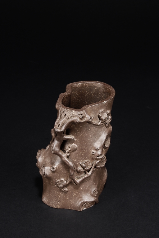 The brush pot in naturalistic form, depicting a plum tree trunk, decorated with plum flowers, branches, and leaves, with fine details on the body. The clay color is of dark brown, finely grained and good patina. Bottom bears artist signature “Ming Yuan”, and three character mark “Chen Ming Yuan”.