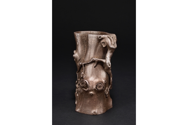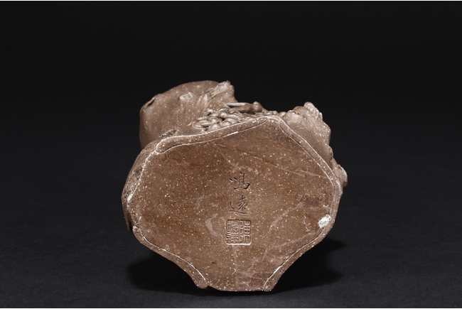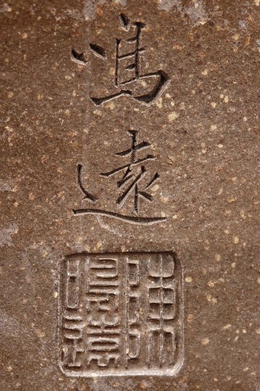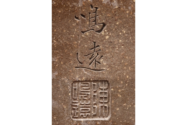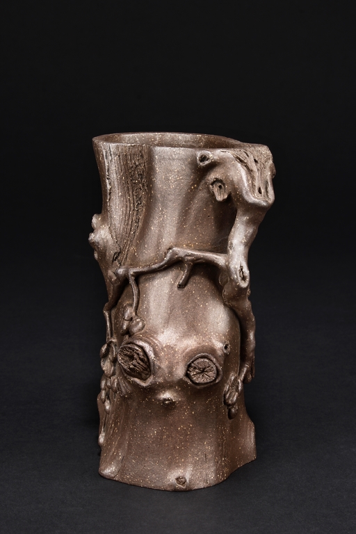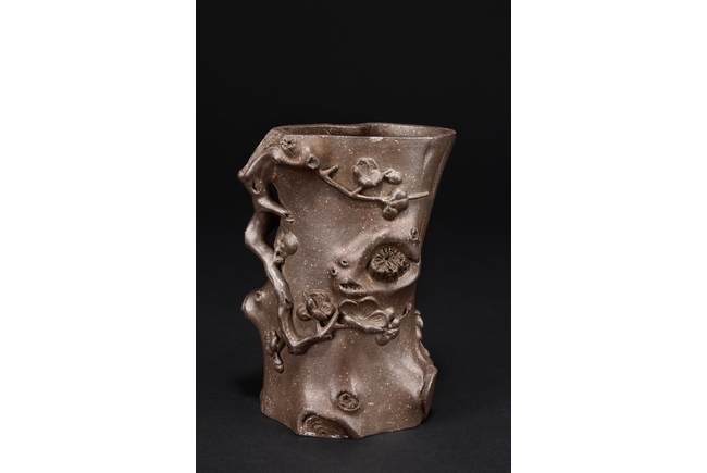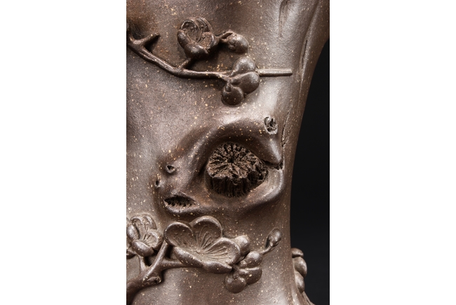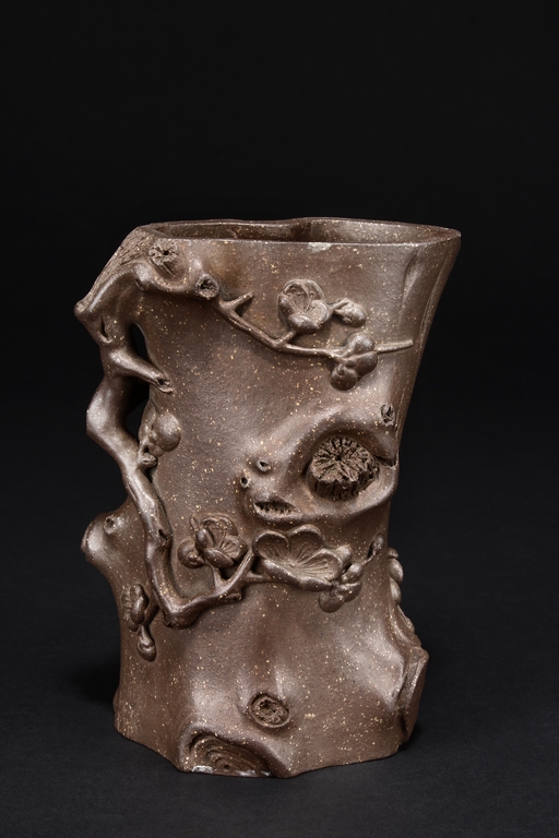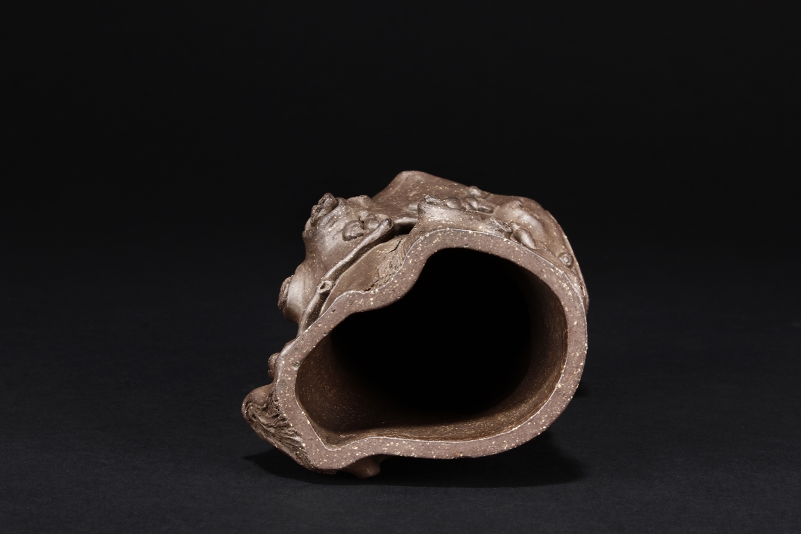 The brush pot in naturalistic form, depicting a plum tree trunk, decorated with plum flowers, branches, and leaves, with fine details on the body. The clay color is of dark brown, finely grained and good patina. Bottom bears artist signature “Ming Yuan”, and three character mark “Chen Ming Yuan”.