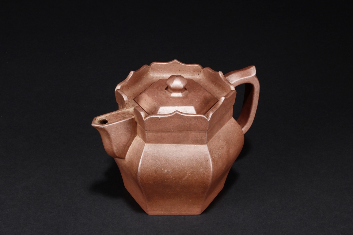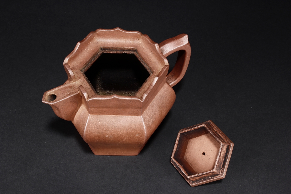 此壺狀似僧帽,口沿上翹,鴨嘴型流口,內嵌式蓋,束頸,鼓腹,六方身筒,此器應為清初時作品。