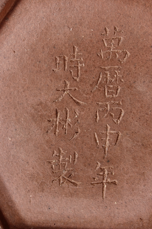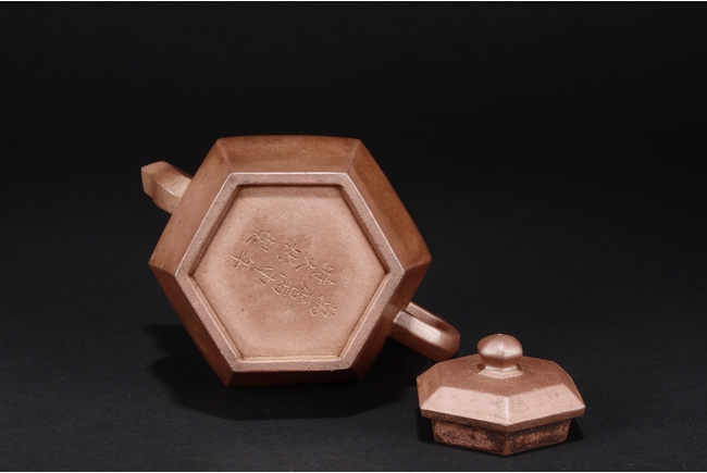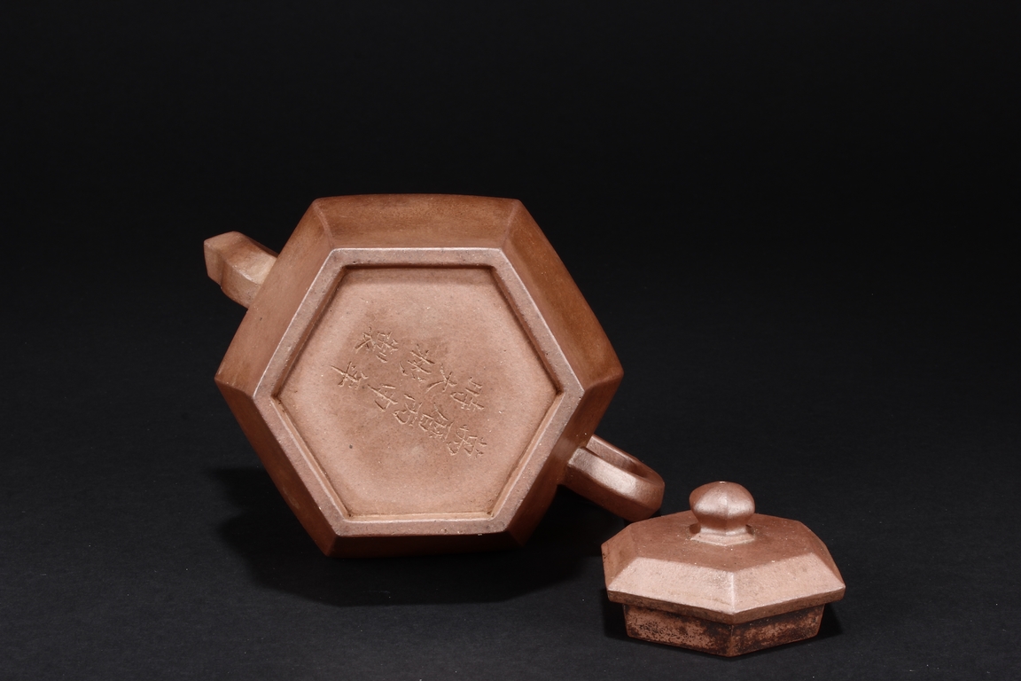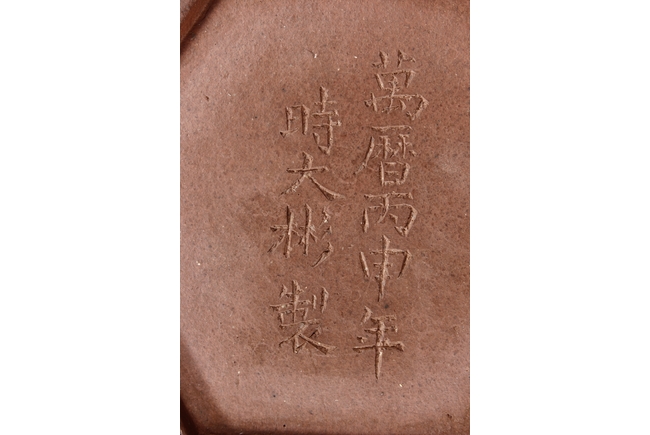 The teapot shaped similar to a monk’s hat, body divided evenly into six sections, the shoulder rim raised upwards, the spout wide and attached to waisted neck, the insertion style lid mounted with a bead finial, bottom bears four character artist signature “Shi Dabin Zhi”, but its style and design more similar to teapots from early Qing Dynasty period.