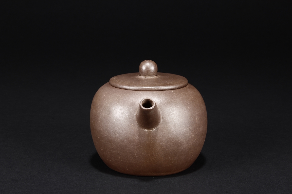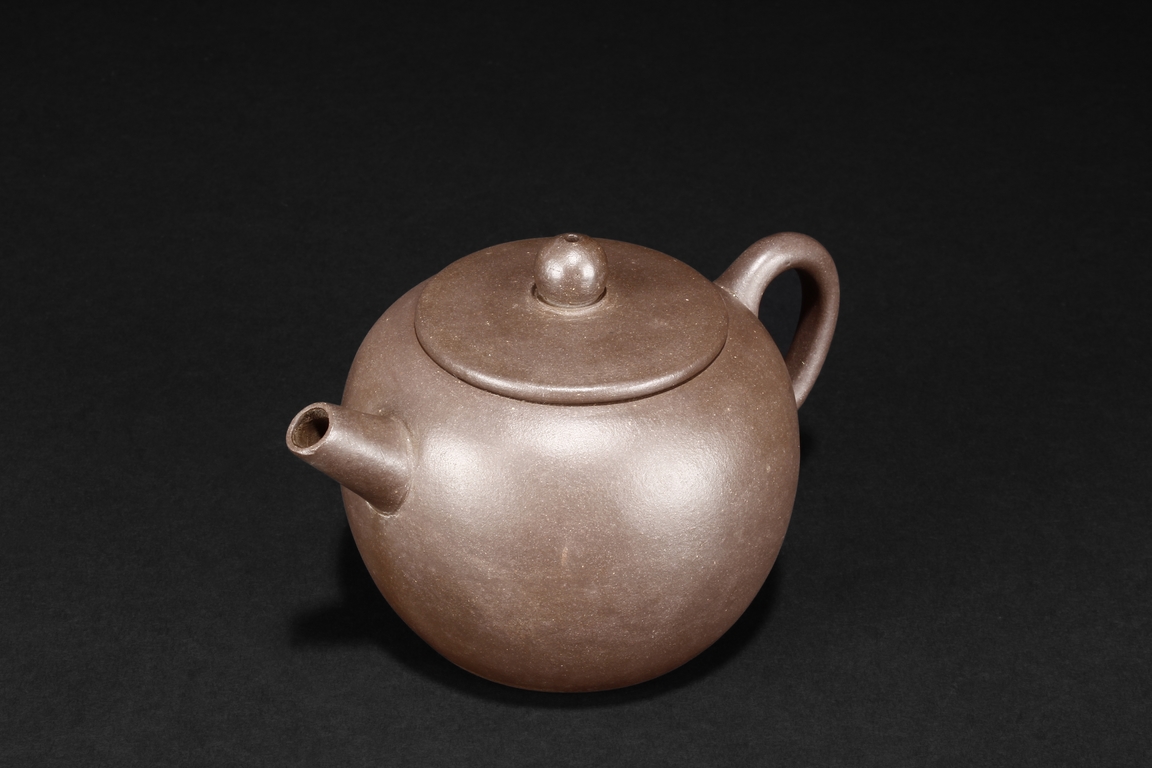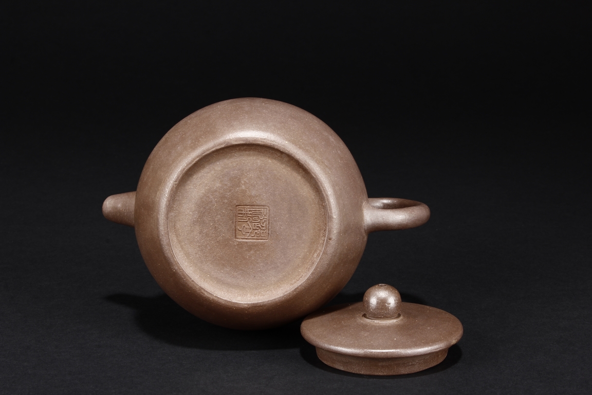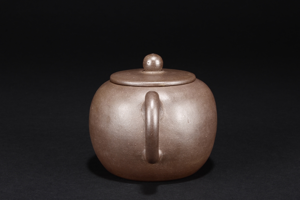 The teapot of globular form, with short straight spout, ear shaped handle, flat lid, and beaded finial, the body’s surface smooth and without decoration. Bottom bears four character mark “SHAOHENGYUZHI”. Signs of repair on the teapot wall.