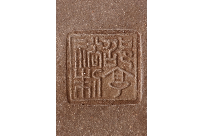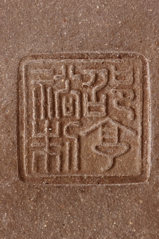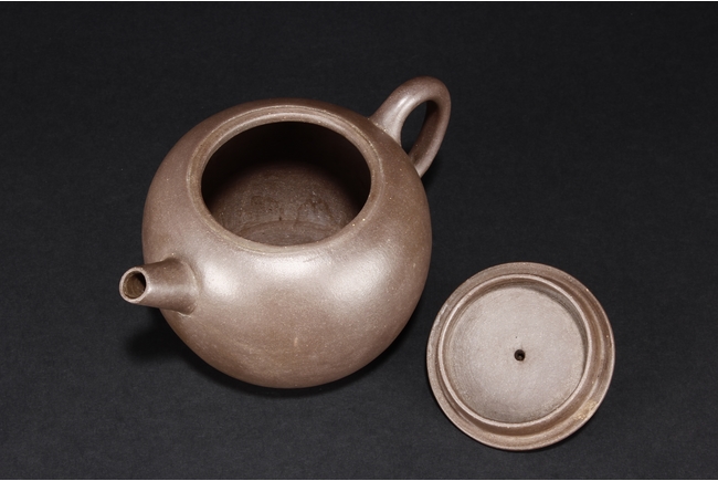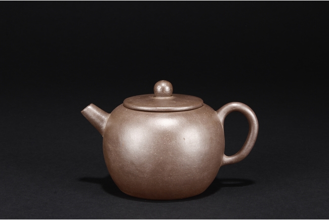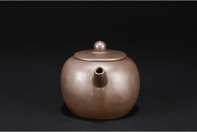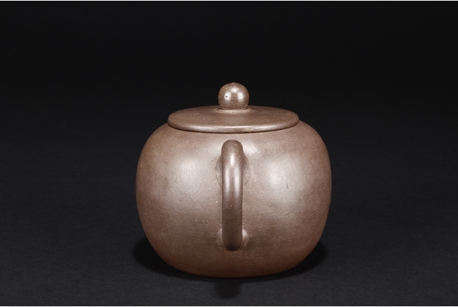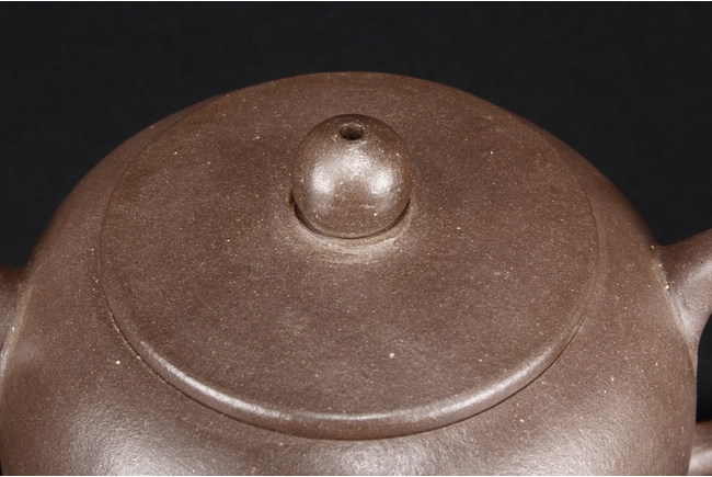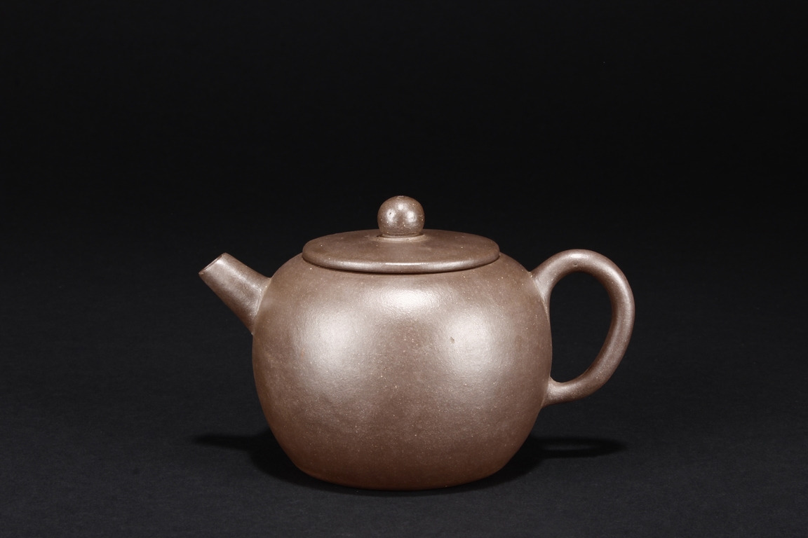 The teapot of globular form, with short straight spout, ear shaped handle, flat lid, and beaded finial, the body’s surface smooth and without decoration. Bottom bears four character mark “SHAOHENGYUZHI”. Signs of repair on the teapot wall.