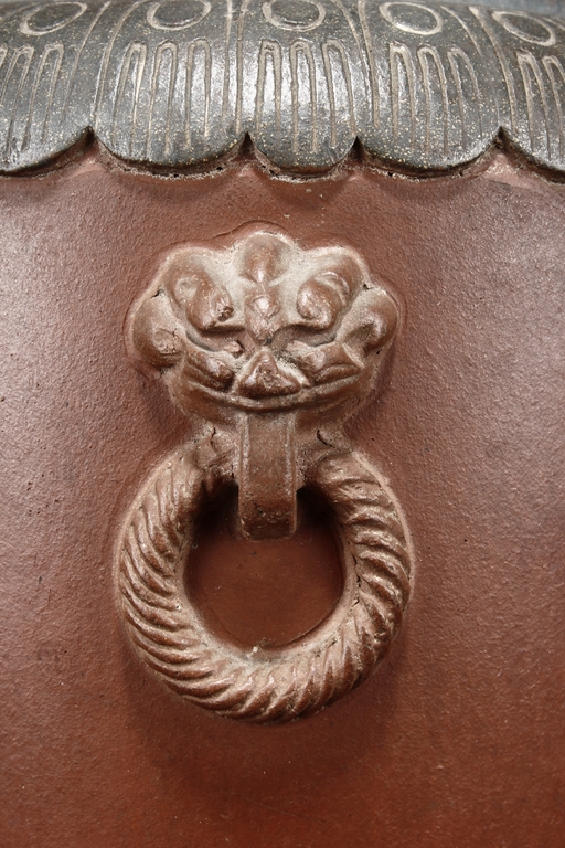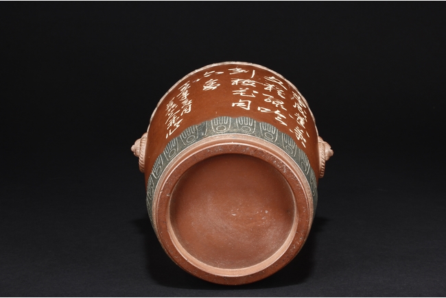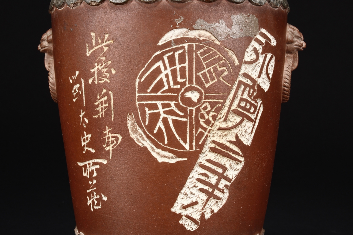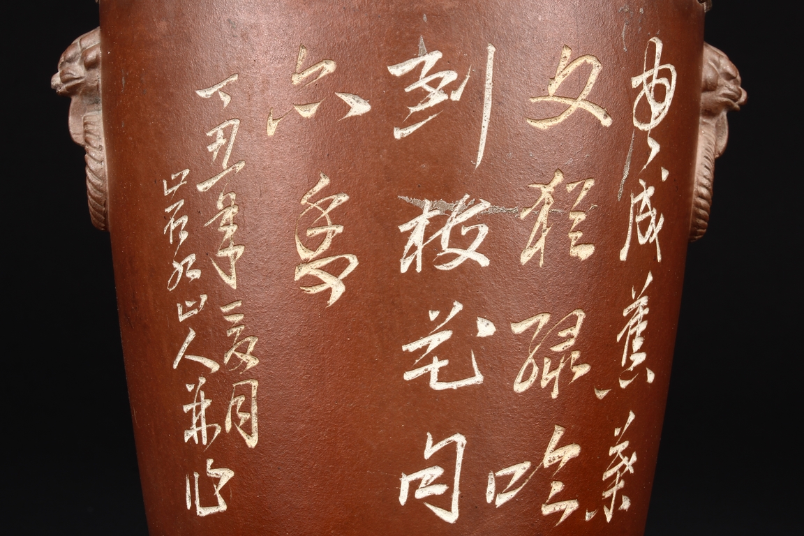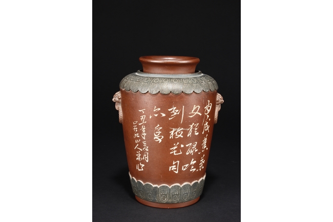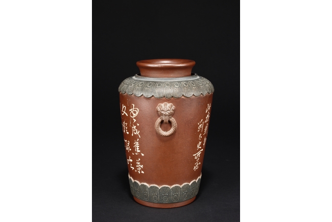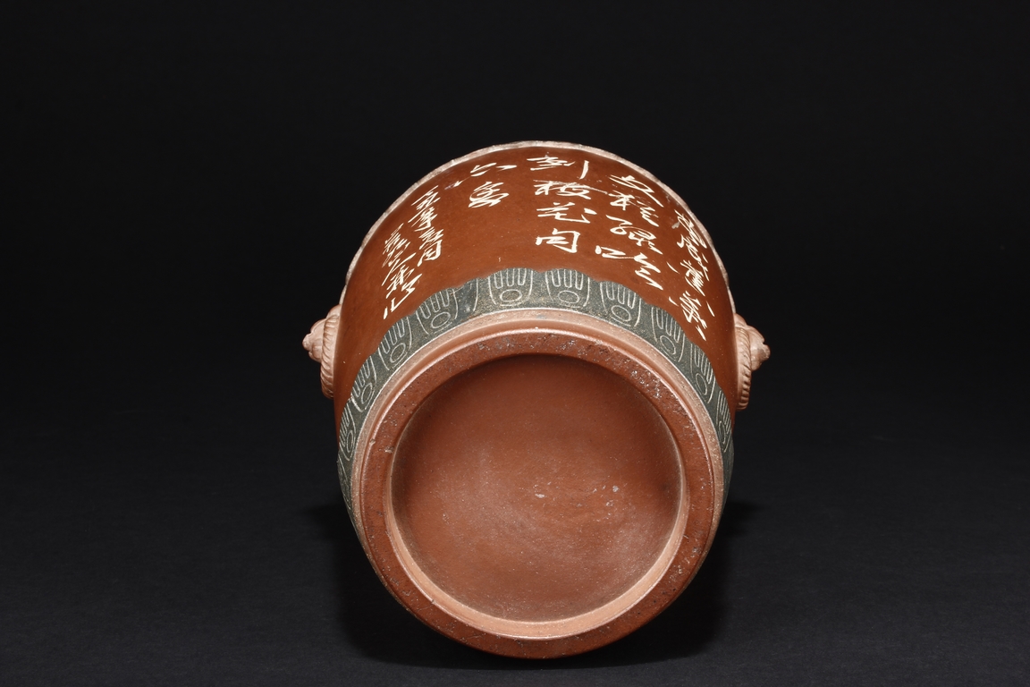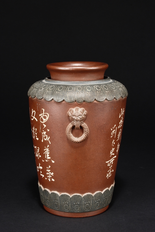 Of tapering cylindrical form with wide shoulders, and flaring rim, the shoulder and bottom decorated with bands of green colored patterns, the body of orange-red color, with colophon and calligraphy, “Yong Ning Er Nian”, and two lion mask handles on the sides, each biting on to a looped ring. The style was very popular during late Qing Dynasty and Republic period.