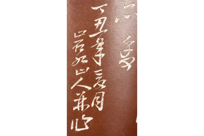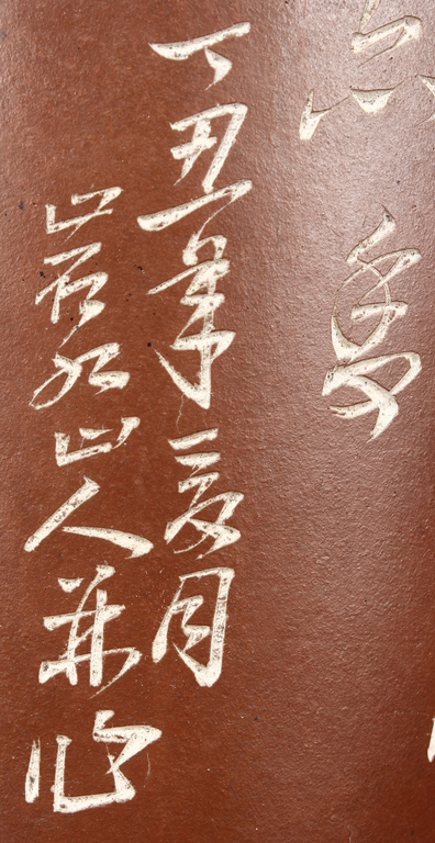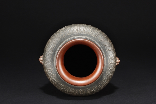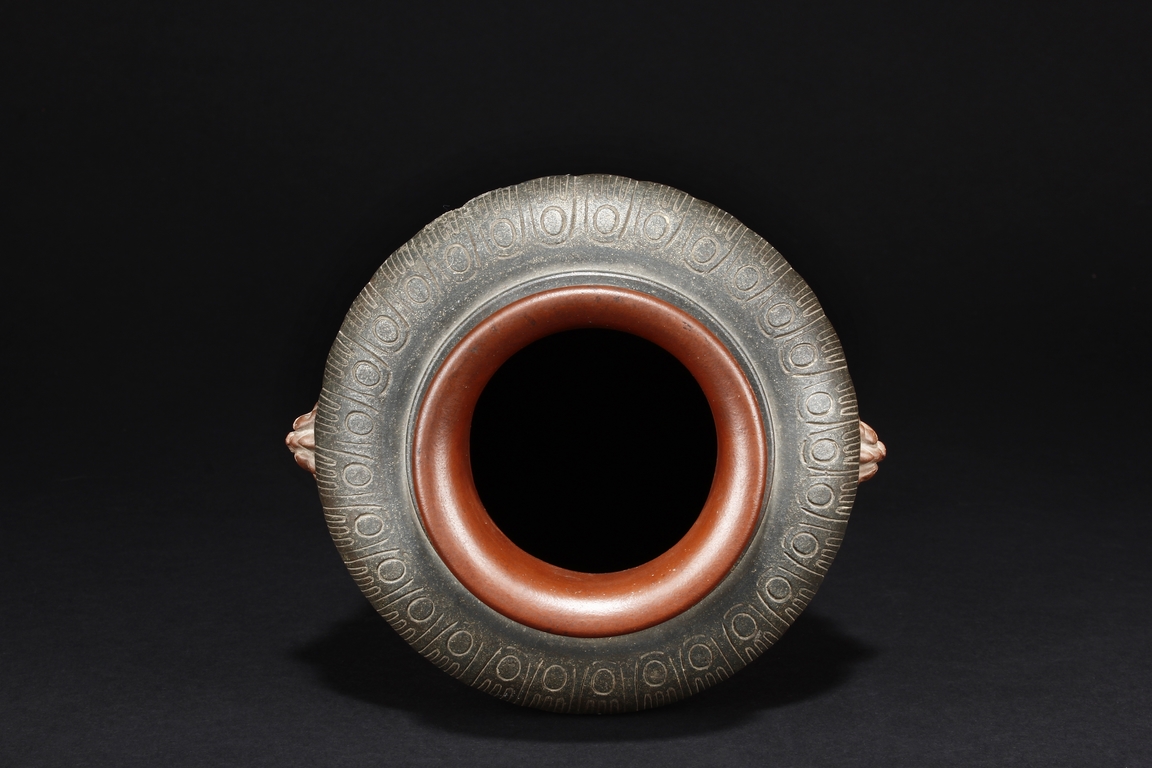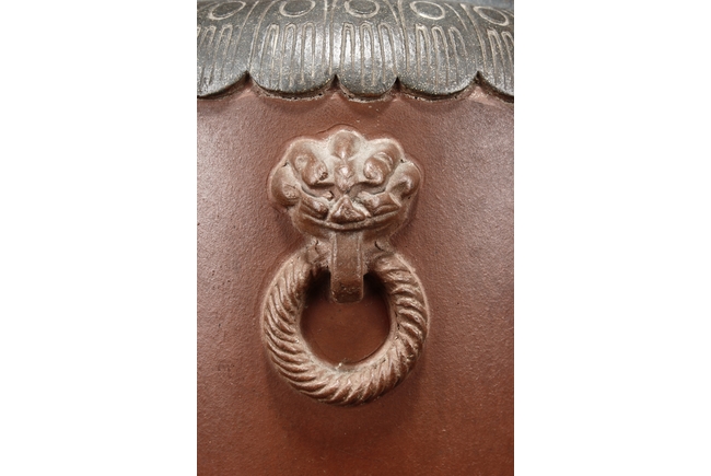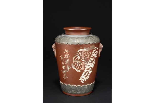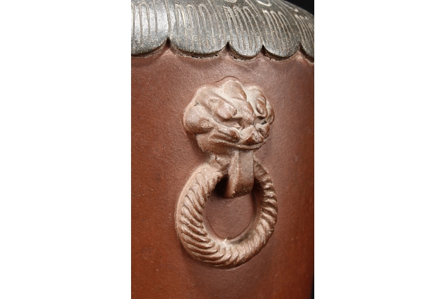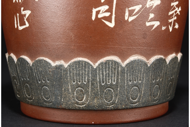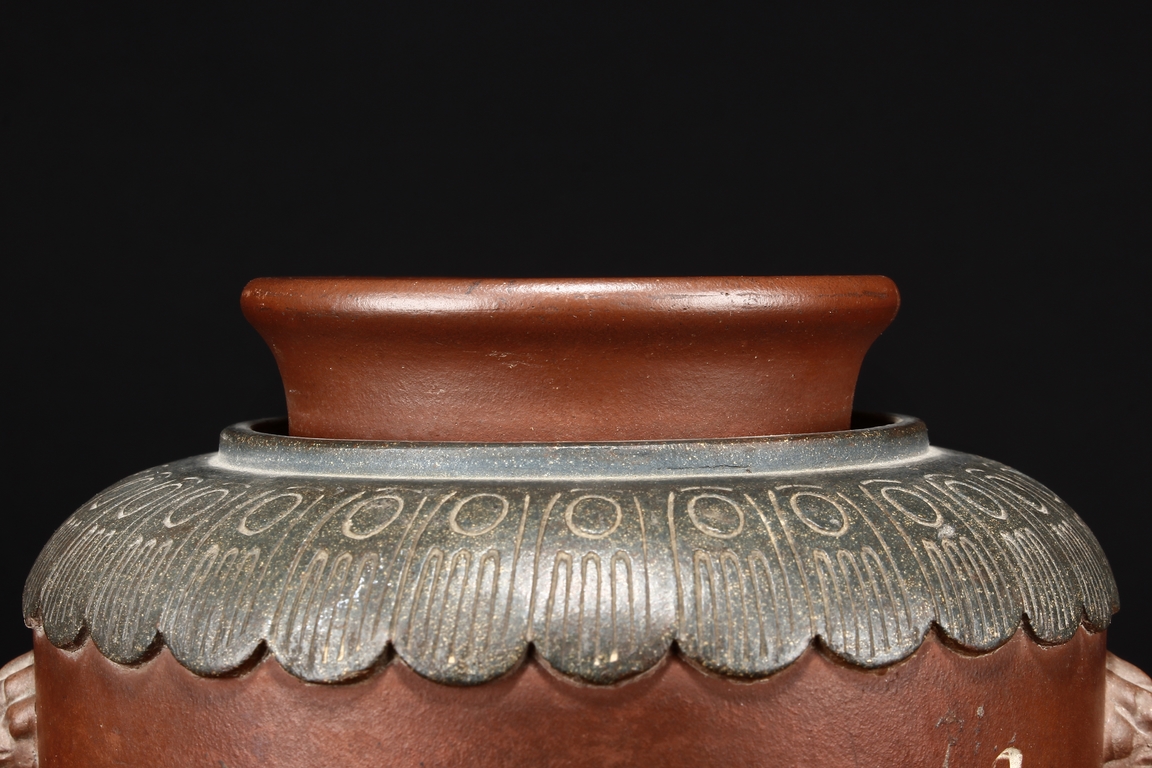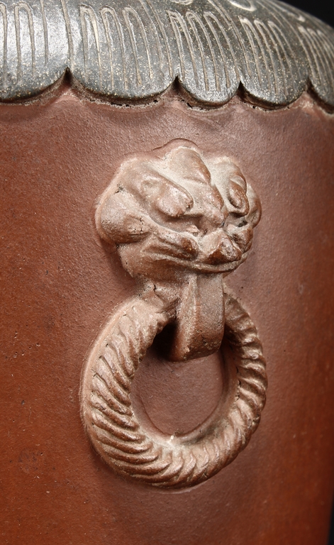 Of tapering cylindrical form with wide shoulders, and flaring rim, the shoulder and bottom decorated with bands of green colored patterns, the body of orange-red color, with colophon and calligraphy, “Yong Ning Er Nian”, and two lion mask handles on the sides, each biting on to a looped ring. The style was very popular during late Qing Dynasty and Republic period.