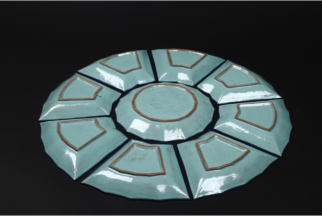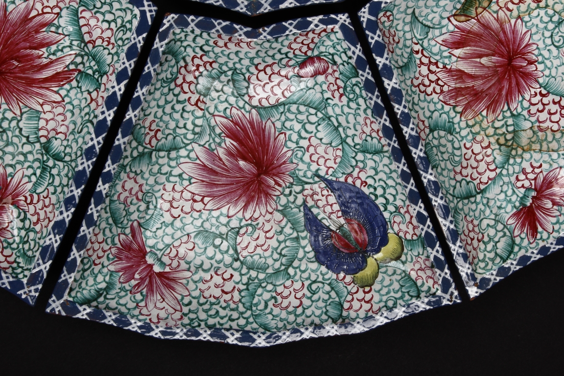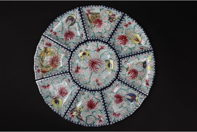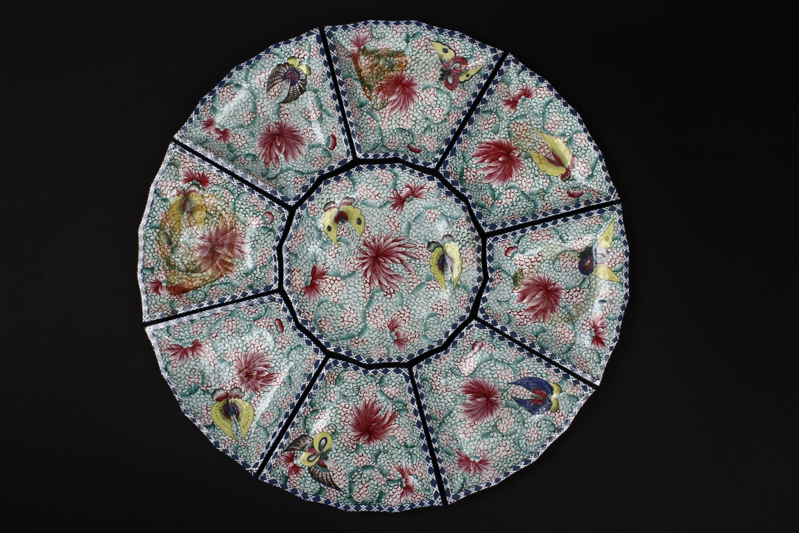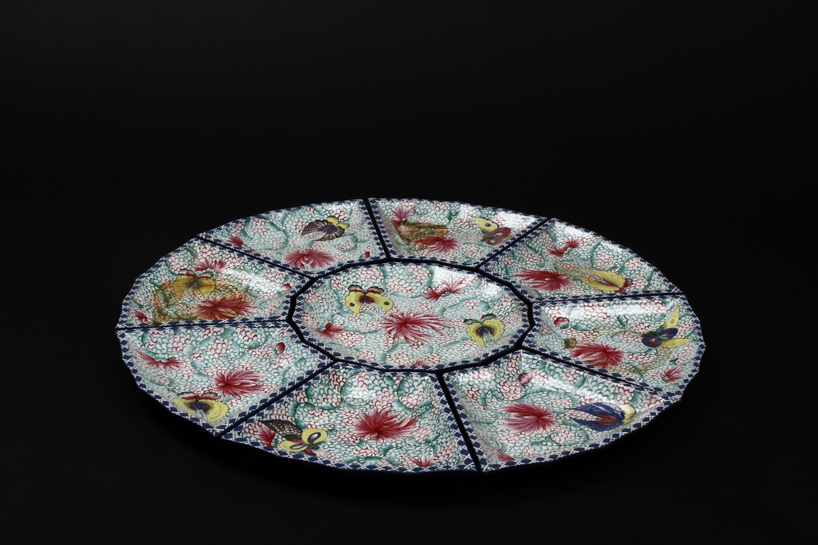 The combination dishes were made from nine separate dishes, with eight trapezoid dishes surrounding center dish, overall with sunflower floriform edges. The dishes each depict butterflies, flowers, and plants, the bottom enameled in teal glaze.