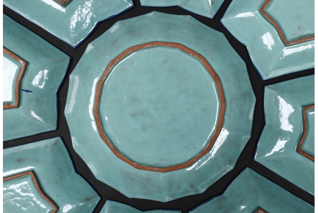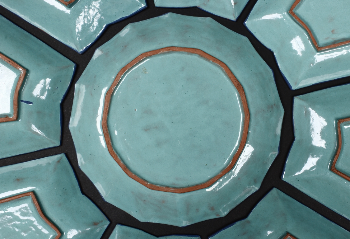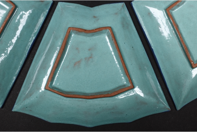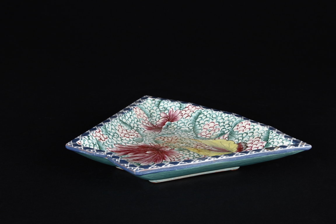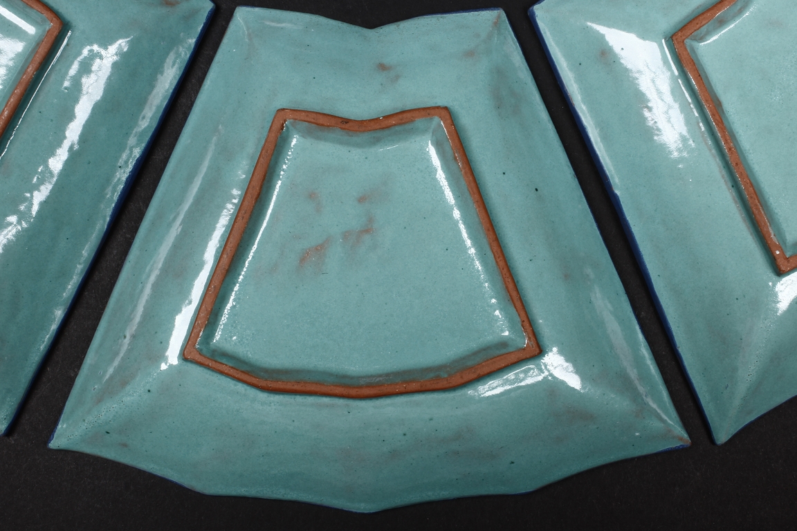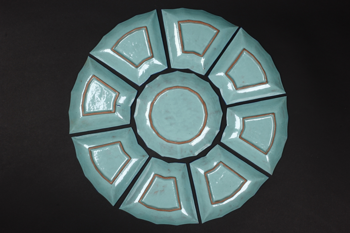 The combination dishes were made from nine separate dishes, with eight trapezoid dishes surrounding center dish, overall with sunflower floriform edges. The dishes each depict butterflies, flowers, and plants, the bottom enameled in teal glaze.