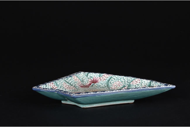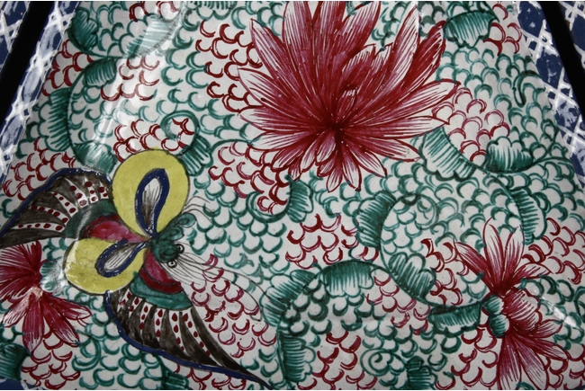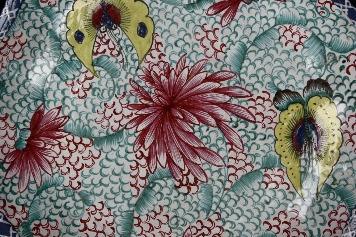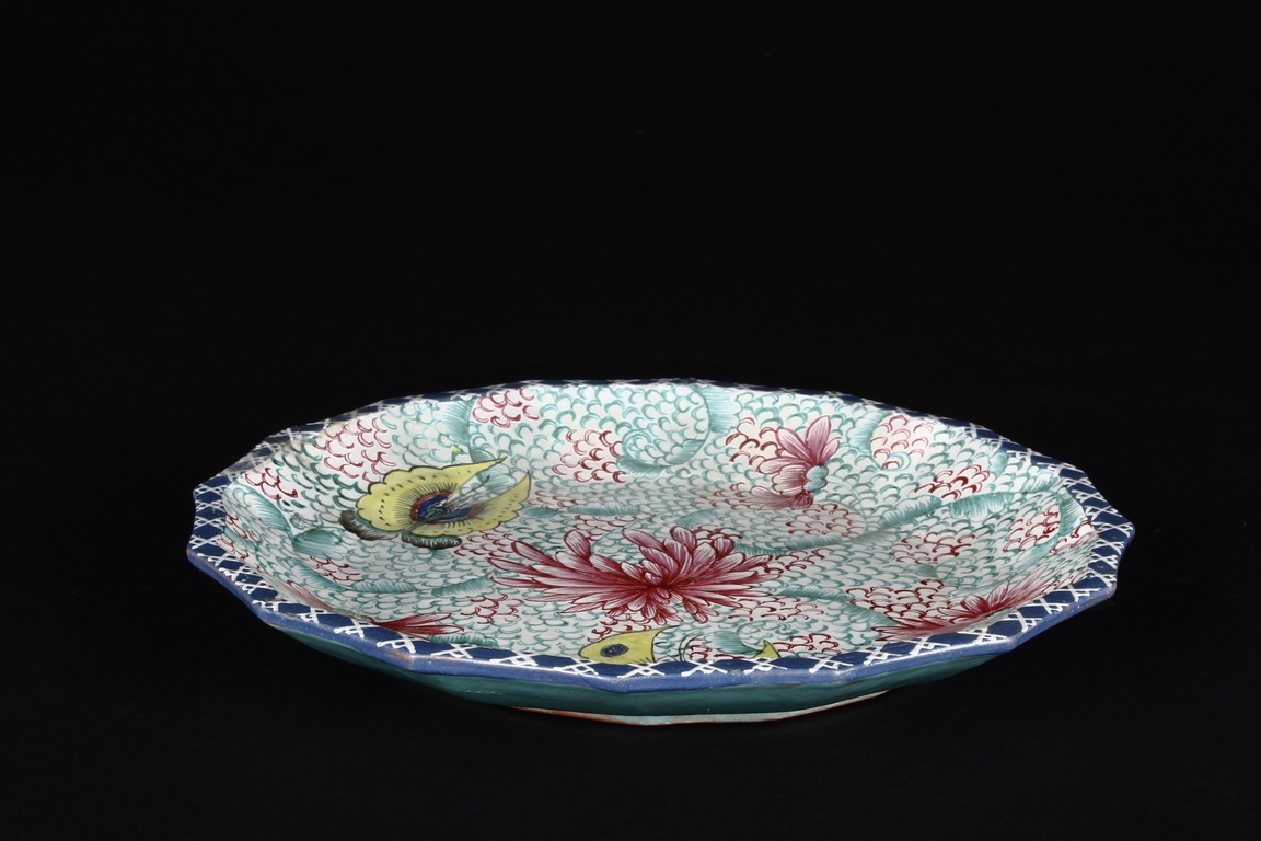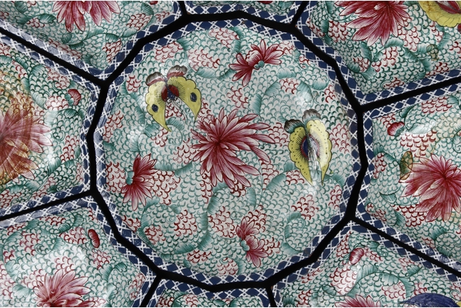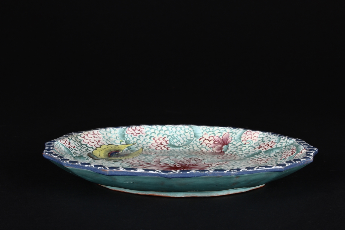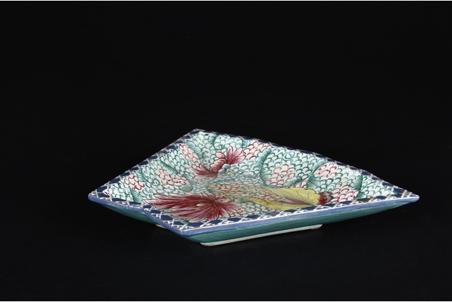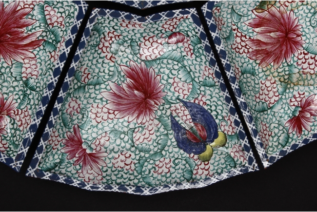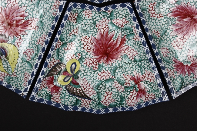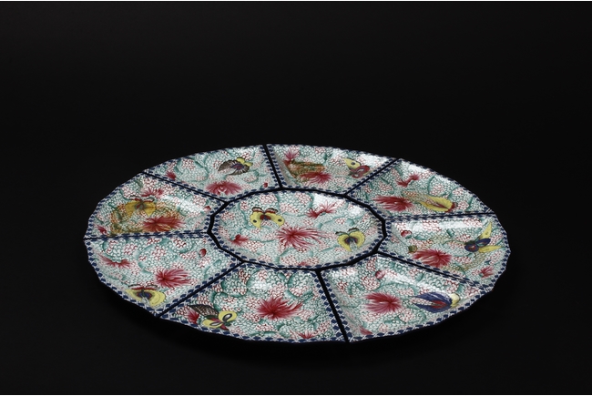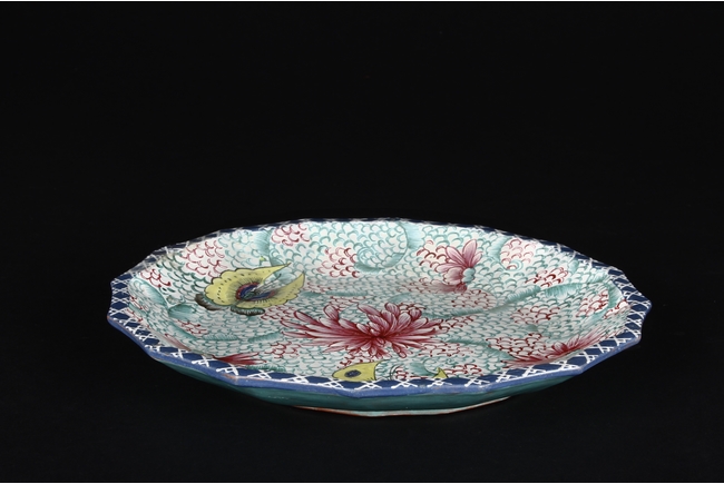 此碟由共九片碟子湊成一葵口大碟,上繪各式蝴蝶,花卉,花團錦簇,喜氣洋洋,底施已藍釉。