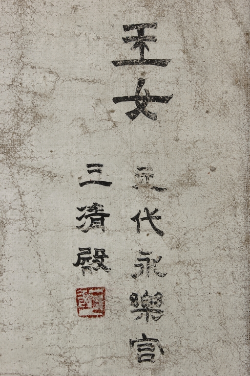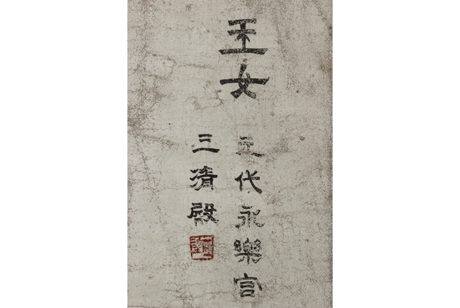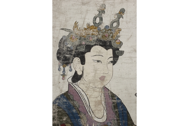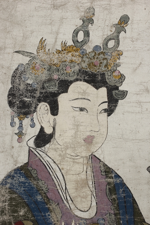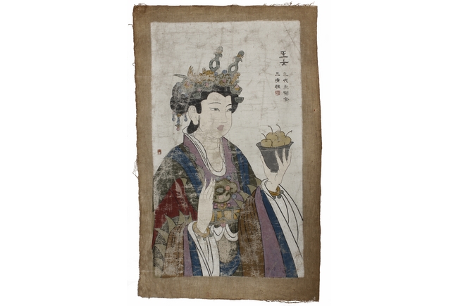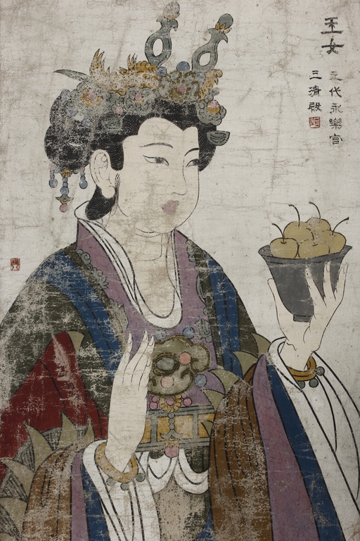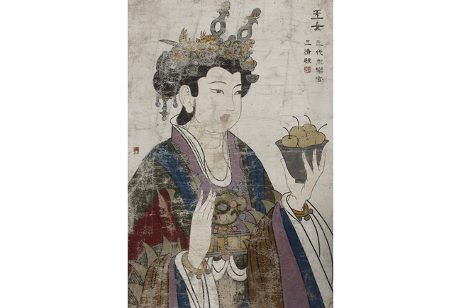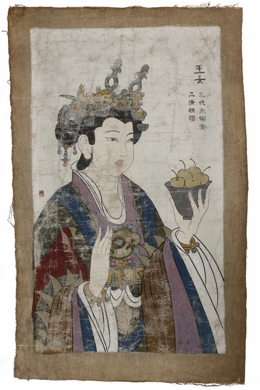 The painting depicts a portrait of female, dressed in elaborate clothing including head garments and jade pendant, while holding a bowl of fruits, Chinese colophon and stamp seal on top right.