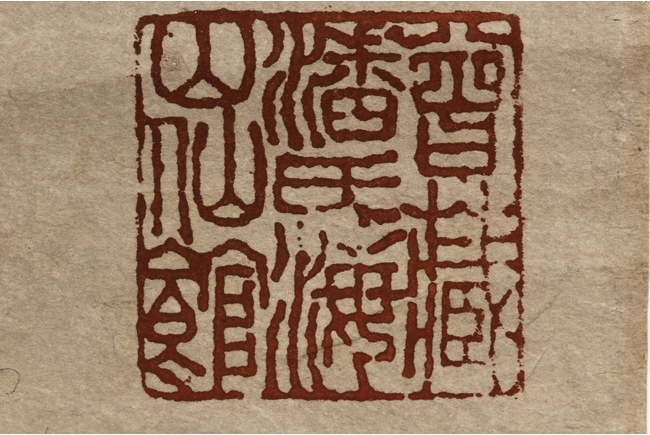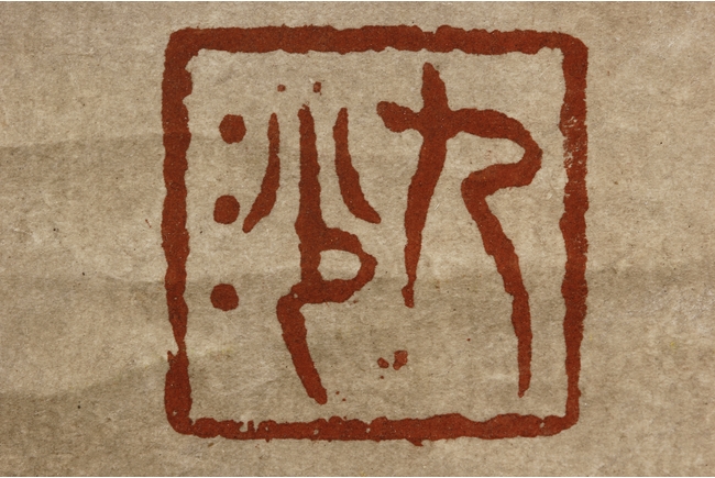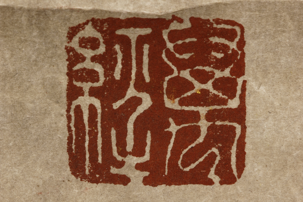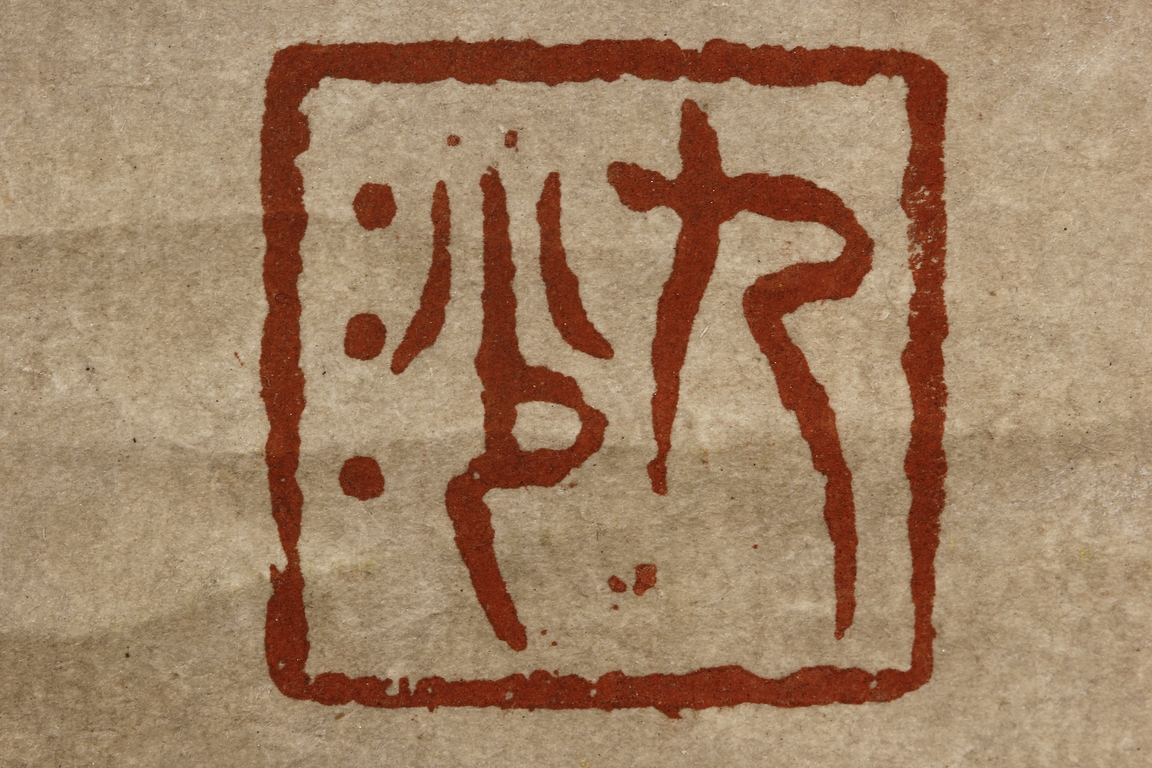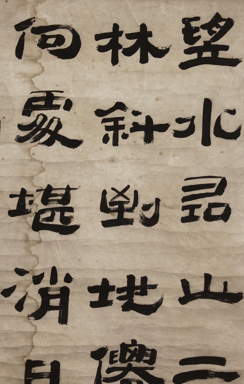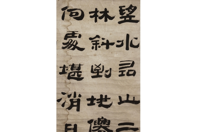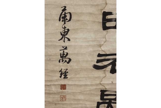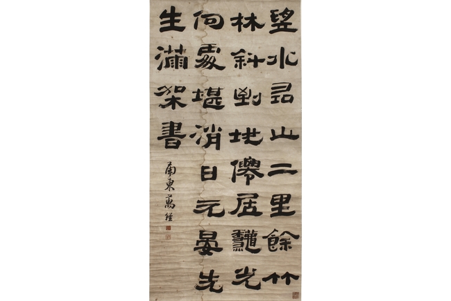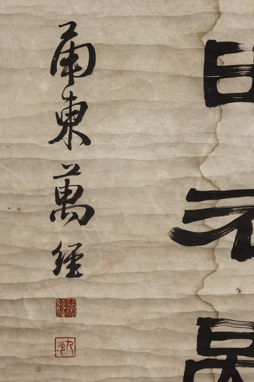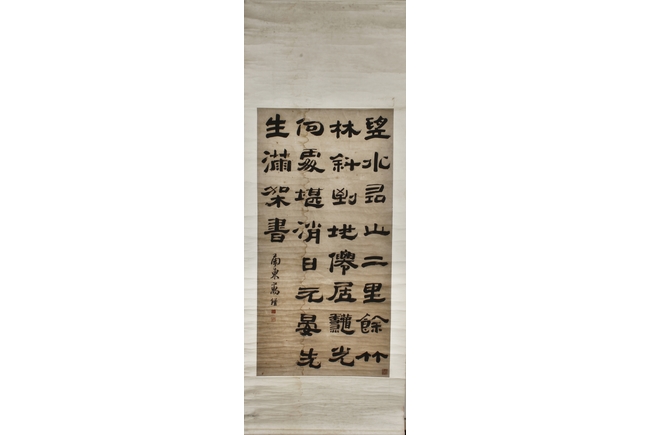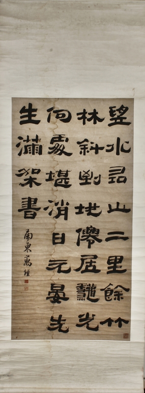 The scroll has Chinese poem written with clerical script, artist signature and mark "WAN JING" on the left side. Visible taint.