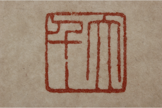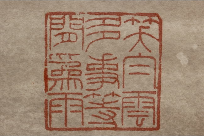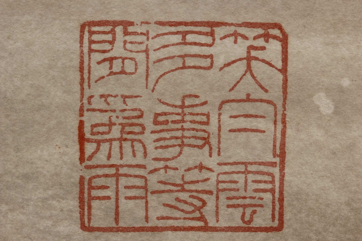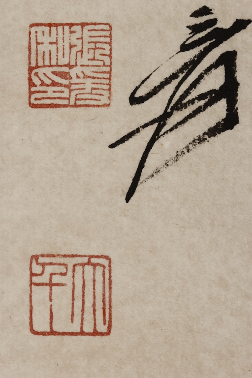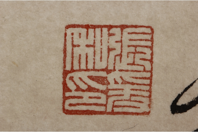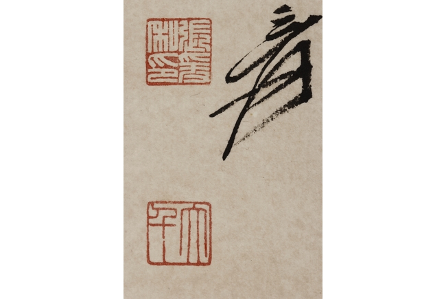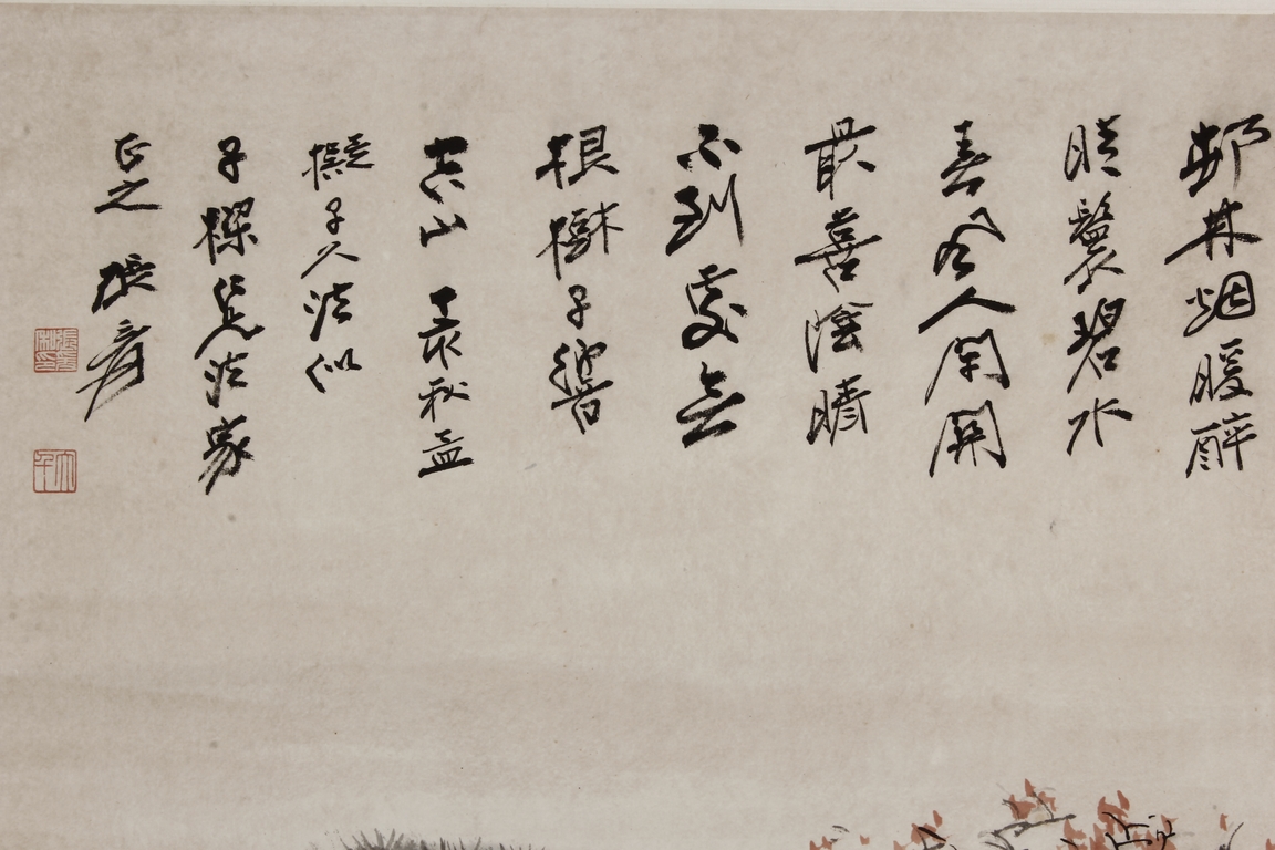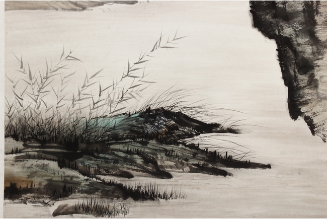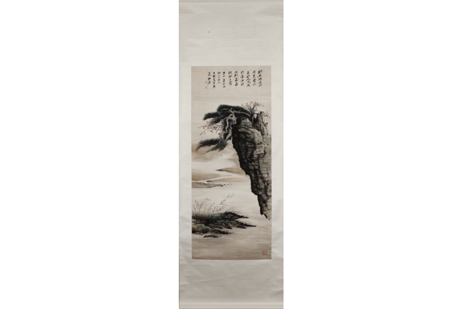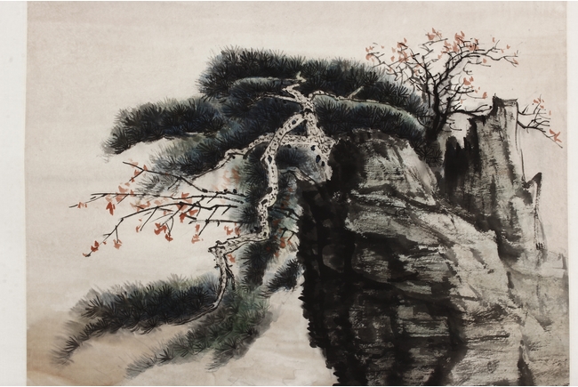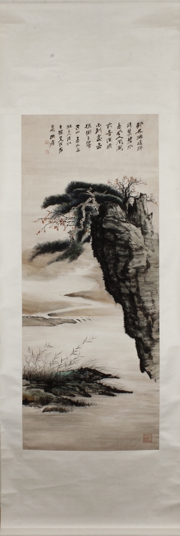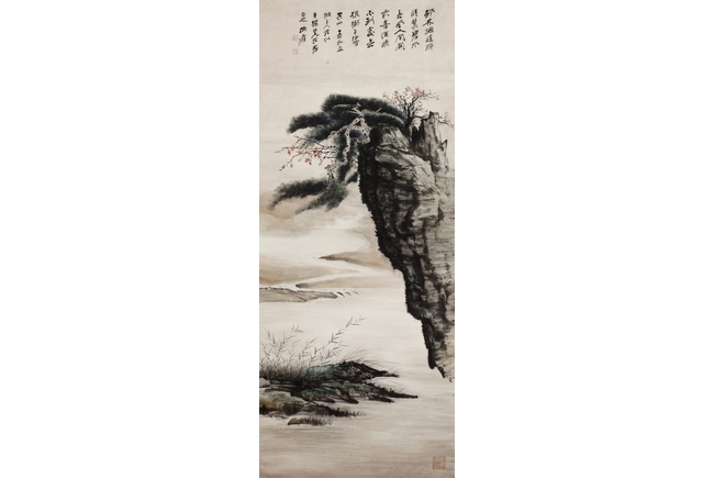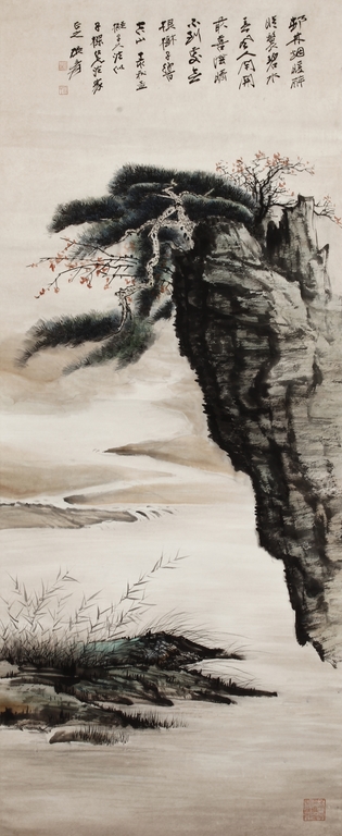 Color and ink on paper, vertical scroll. The painting depicts pine trees thriving on top of a steep cliff overwatching river and shore. Artist colophon, signature, and mark "ZHANG DAQIAN".