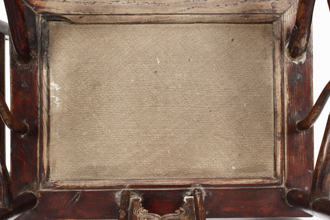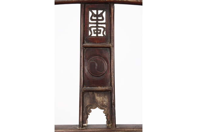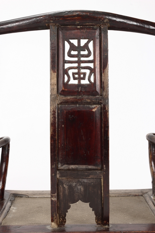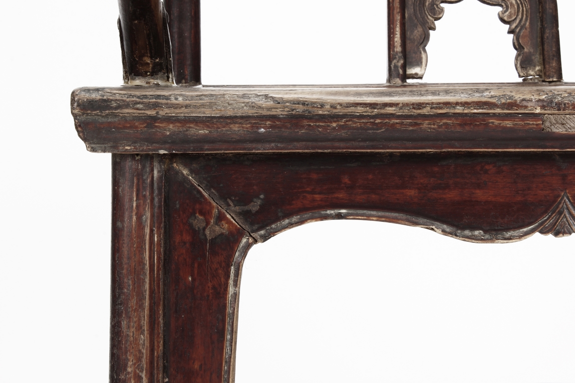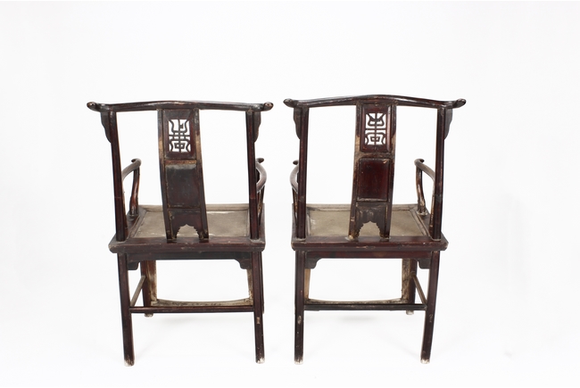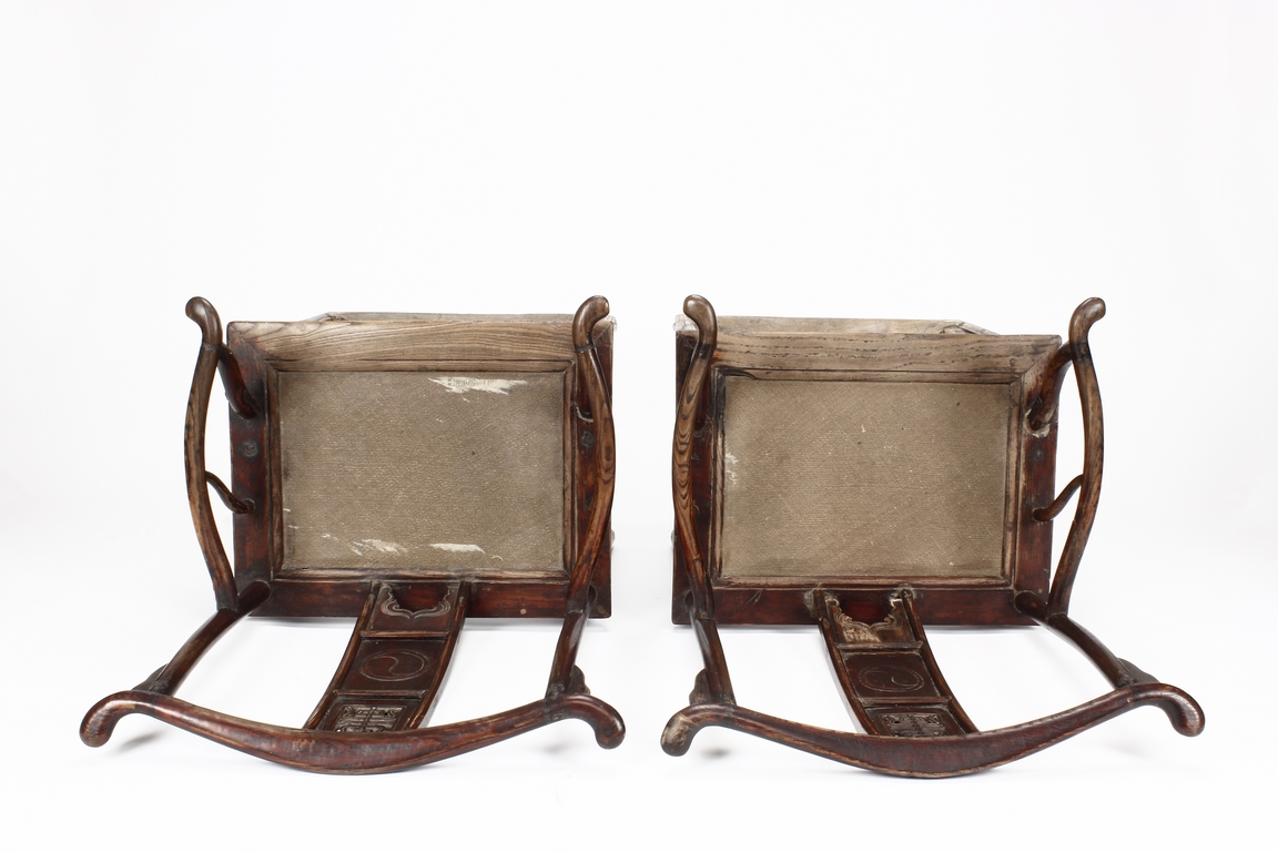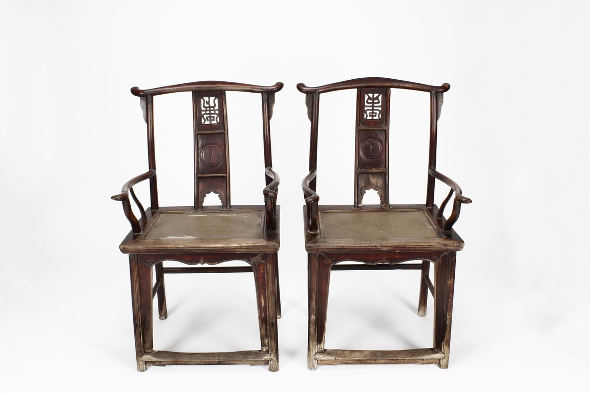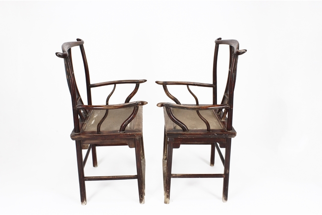 A pair of well proportioned wooden Gaunmaoyi armchairs, each with an arched crest rail joined to a wide C-curved rectangular splat, the stiles similarly curved, on a hard caned seat with elegantly out-scrolled arms above a shaped spandrel and an apron, the legs joined by four typical stretchers from front to back rail. Qing dynasty period.