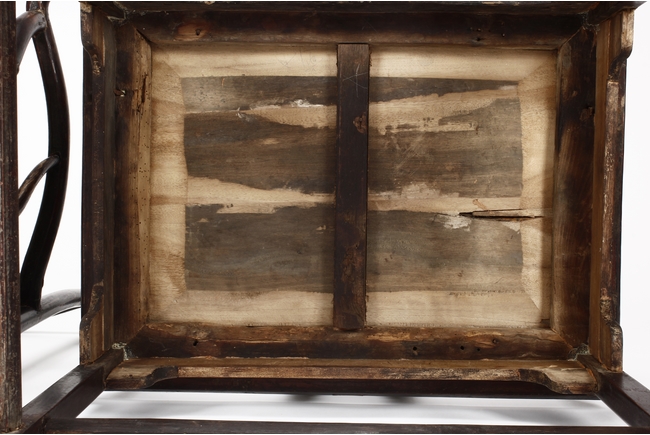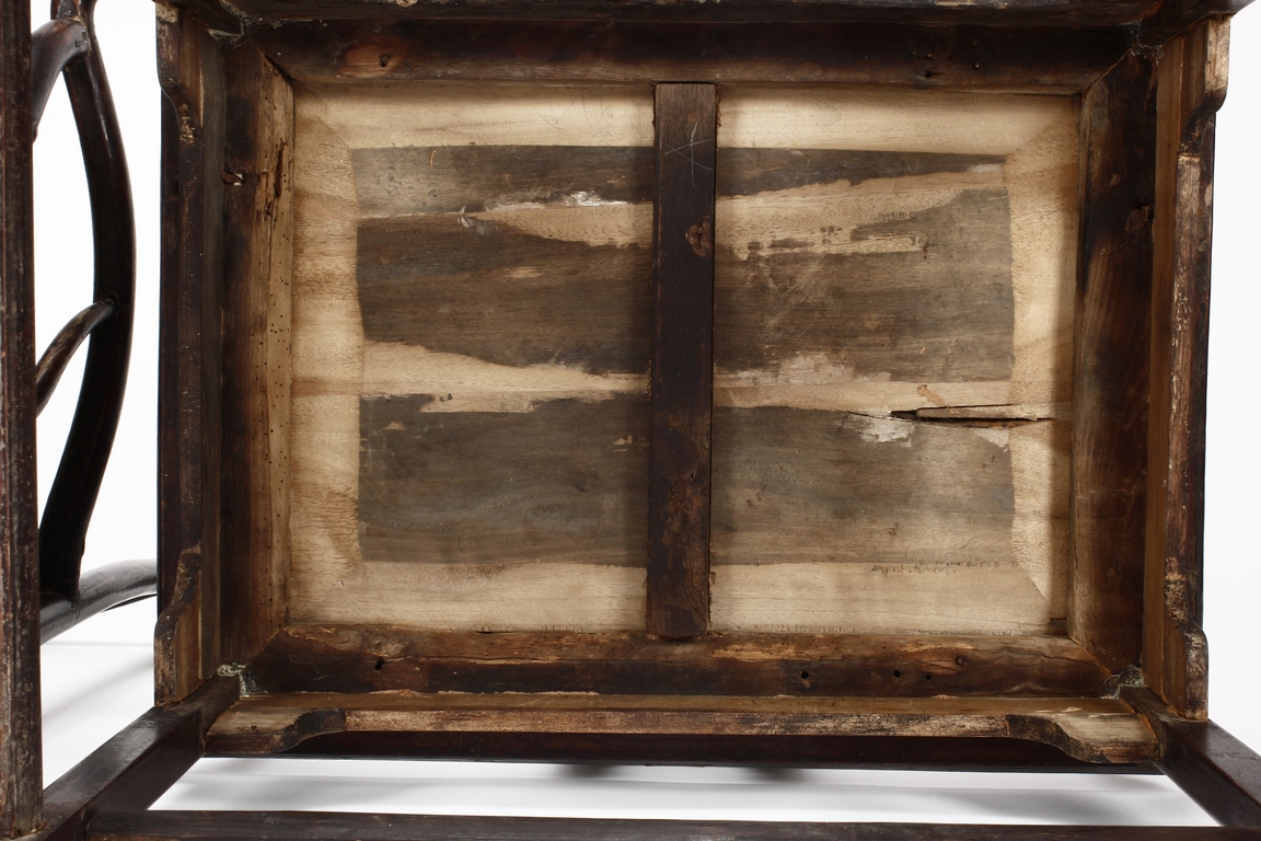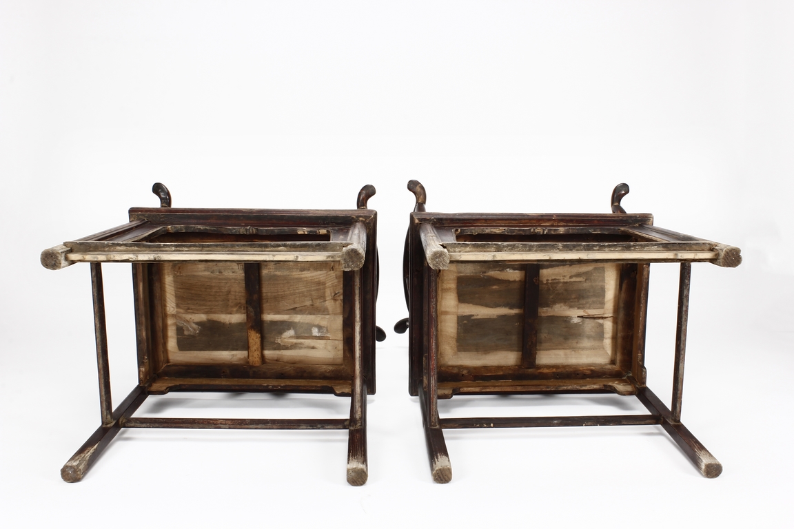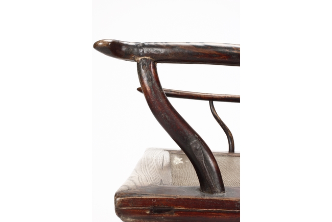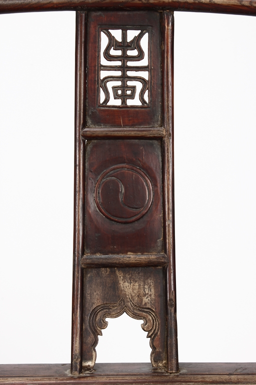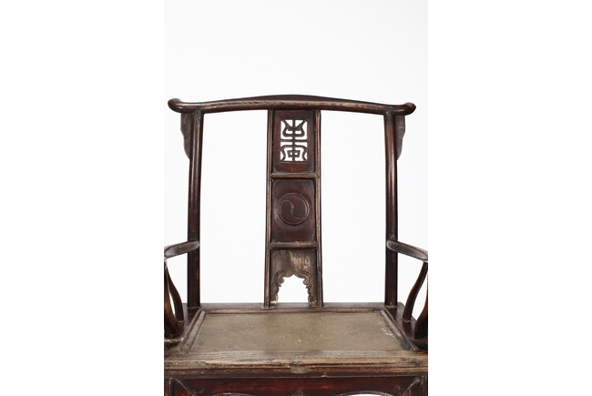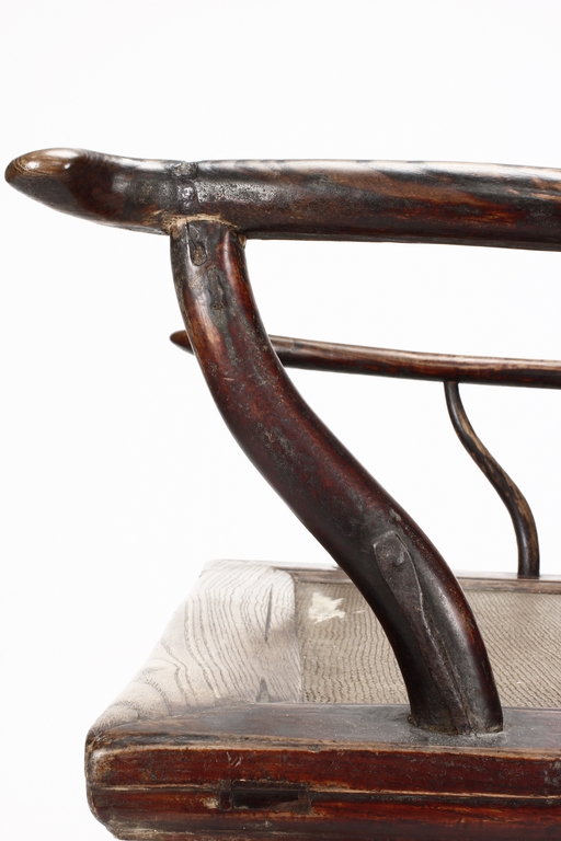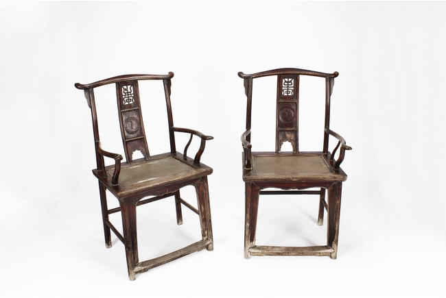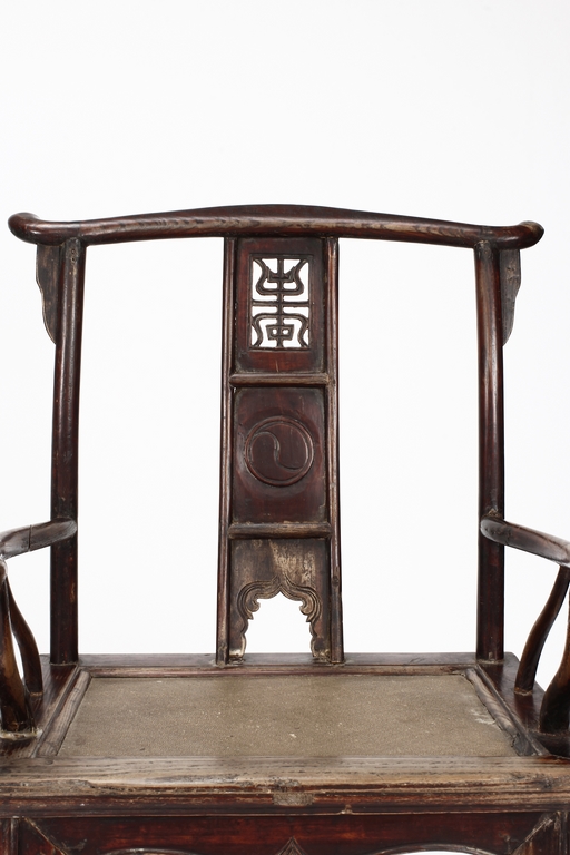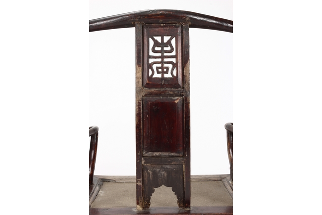 A pair of well proportioned wooden Gaunmaoyi armchairs, each with an arched crest rail joined to a wide C-curved rectangular splat, the stiles similarly curved, on a hard caned seat with elegantly out-scrolled arms above a shaped spandrel and an apron, the legs joined by four typical stretchers from front to back rail. Qing dynasty period.