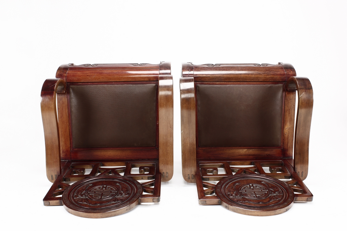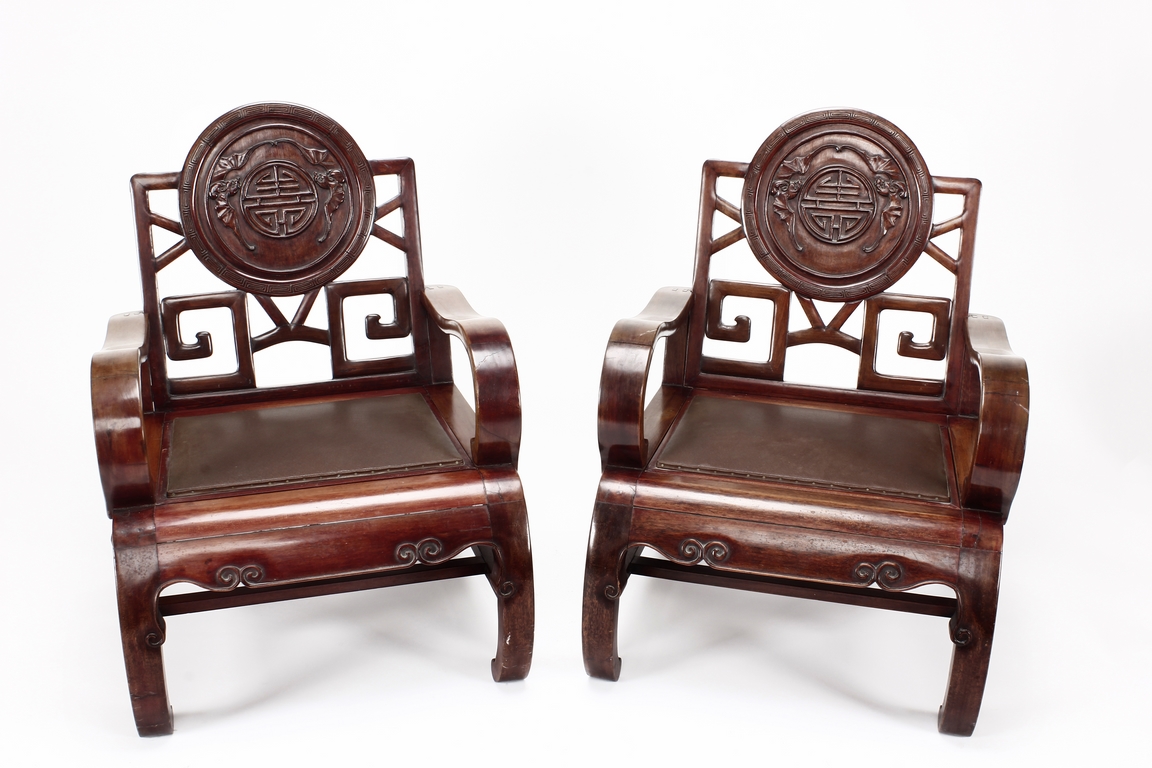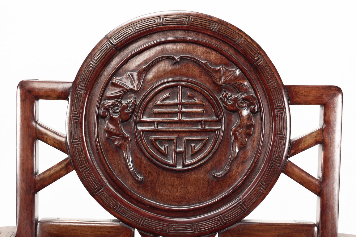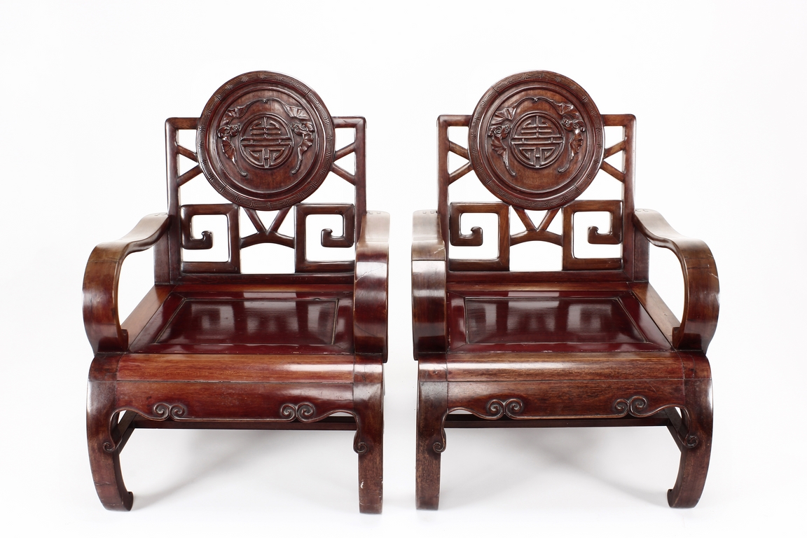 The two chairs made from hongmu wood, with wide armrests connected to the openworks carved back rest depicting two flying bats enclosing 'Shou' character, border carved with scrolling key-fret patterns, the seats padded slightly, the four hoofed legs linked by underside stretchers. Republic period