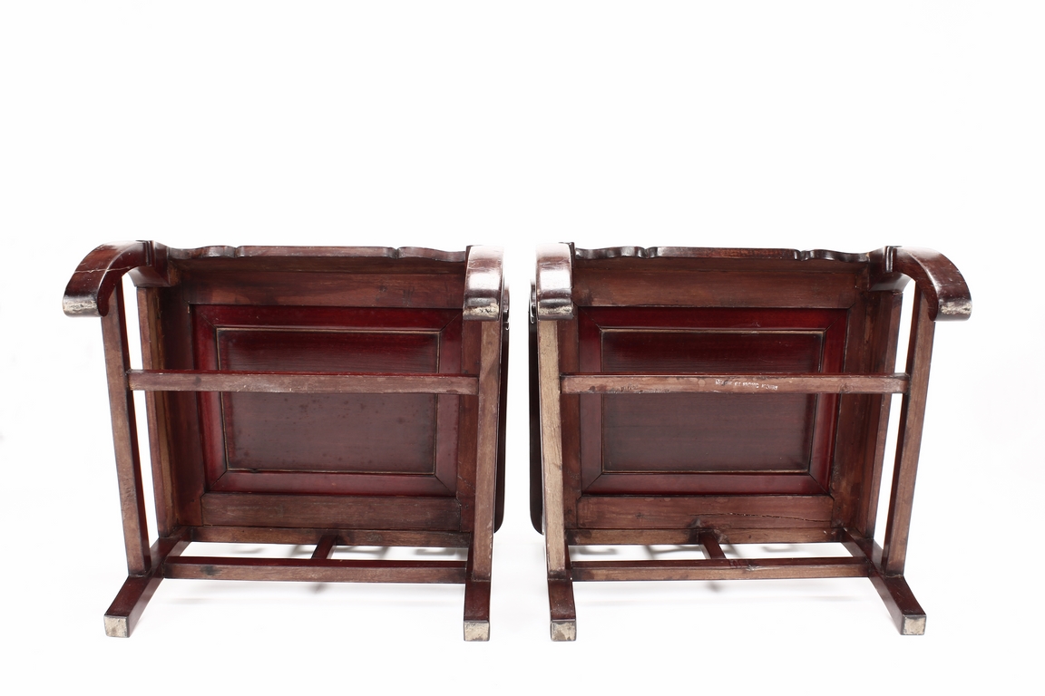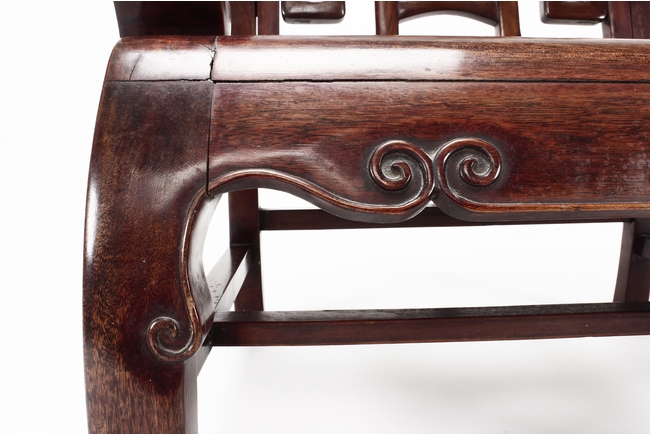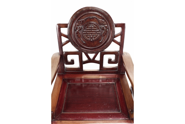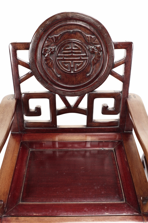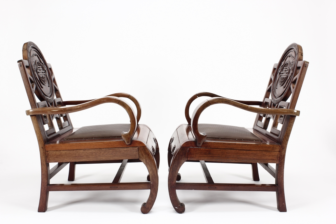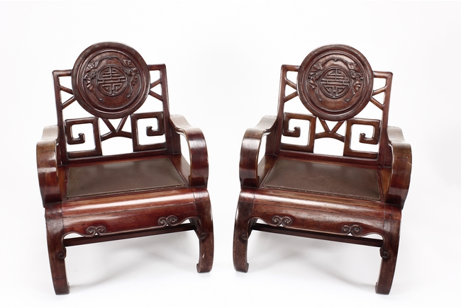 The two chairs made from hongmu wood, with wide armrests connected to the openworks carved back rest depicting two flying bats enclosing 'Shou' character, border carved with scrolling key-fret patterns, the seats padded slightly, the four hoofed legs linked by underside stretchers. Republic period