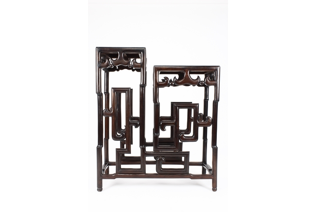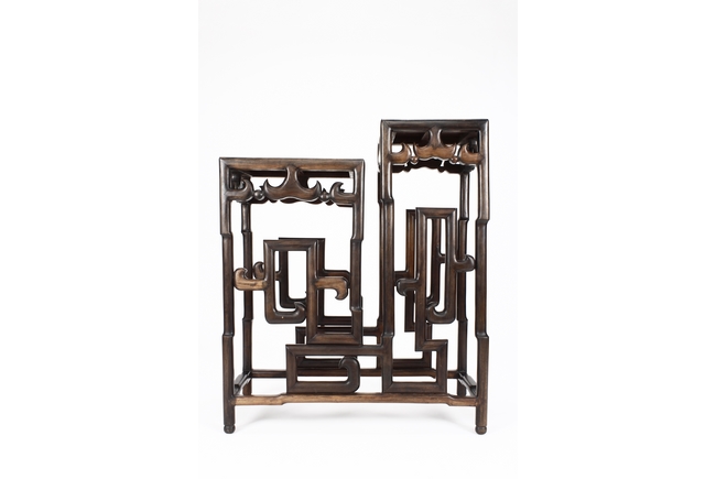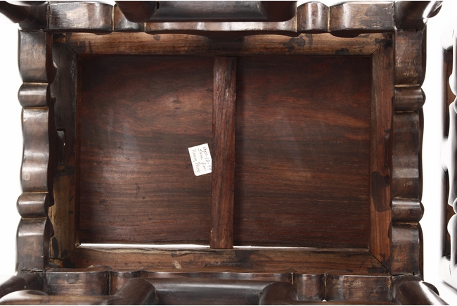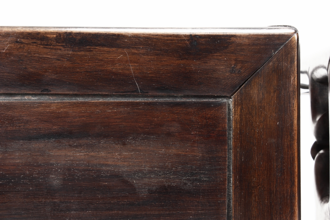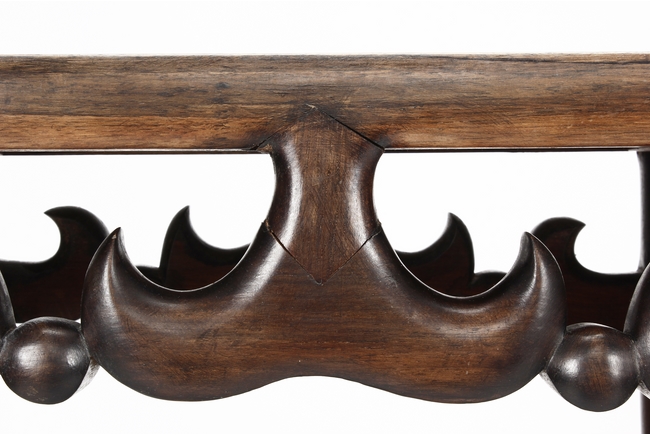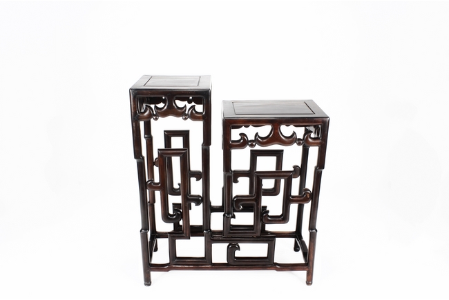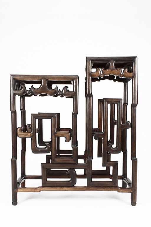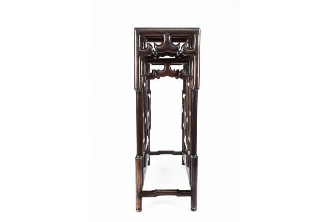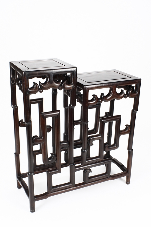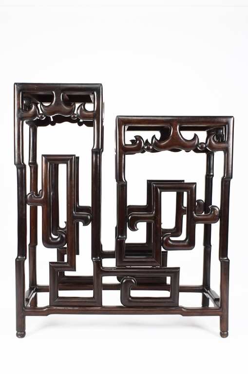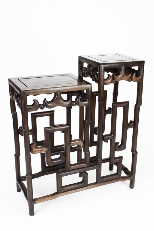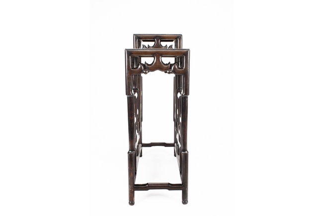 The sidetable made from hongmu wood, consists of two uneven table tops, connected from the bottom with stylized stretchers, hipped legs with stepped openwork squared-scroll brackets, stands on bead-form feet.Qing dynasty period.