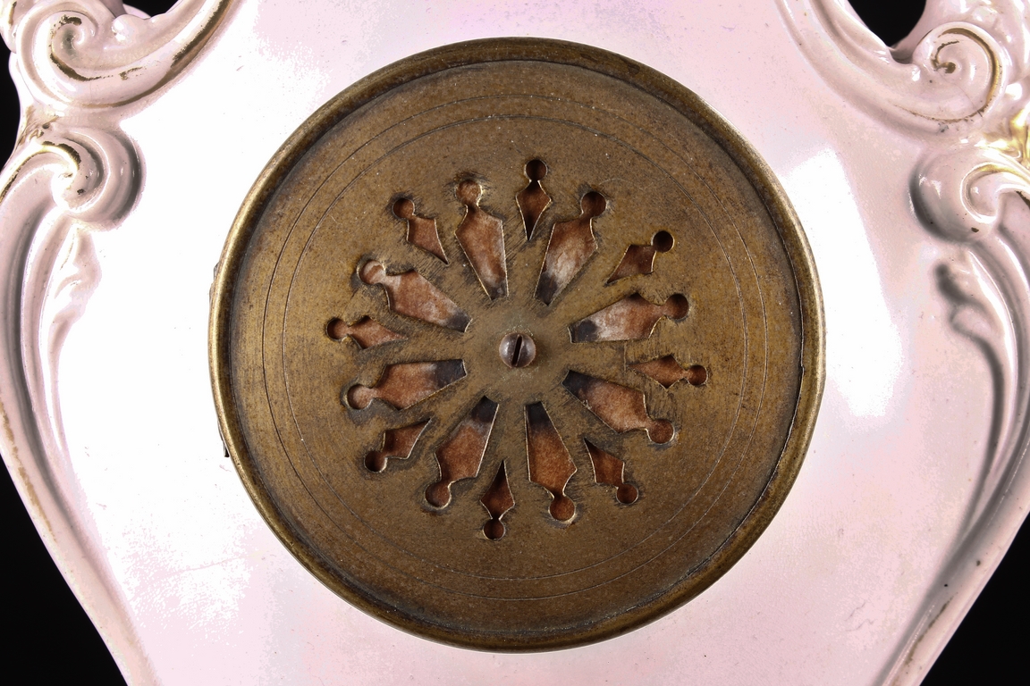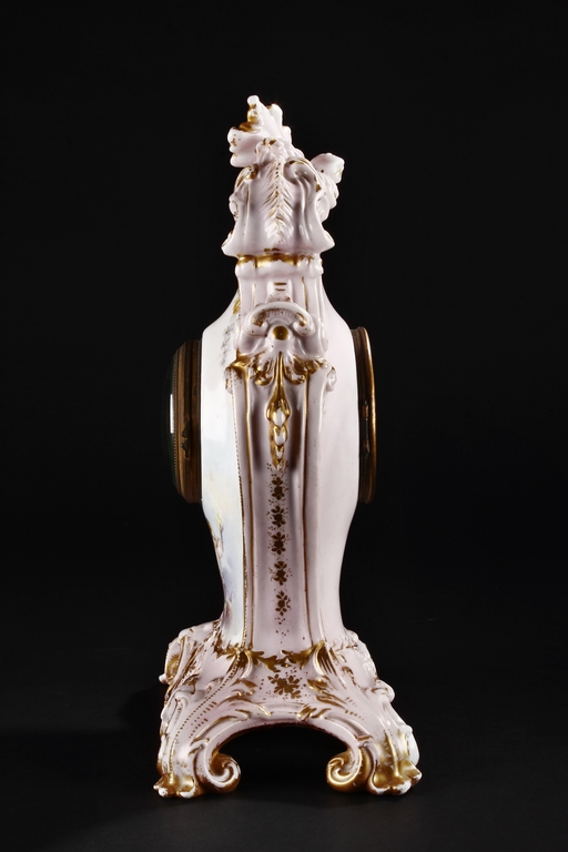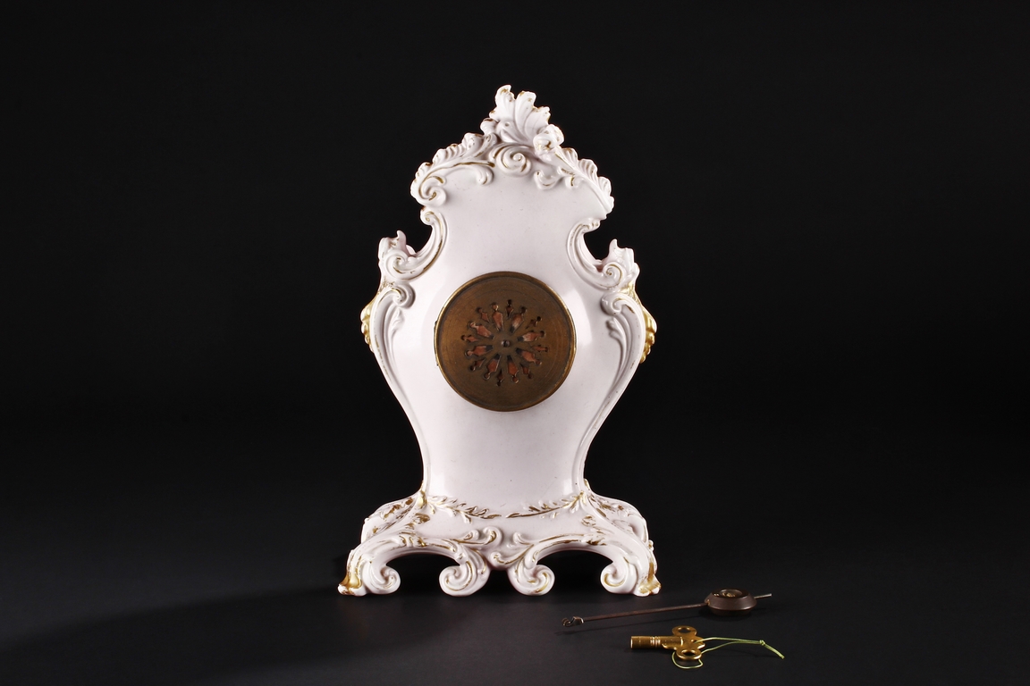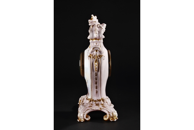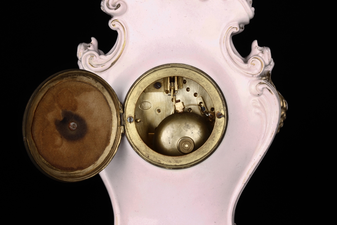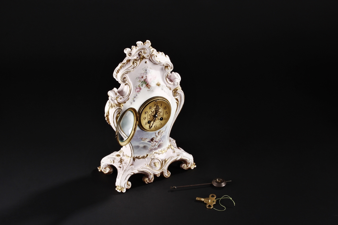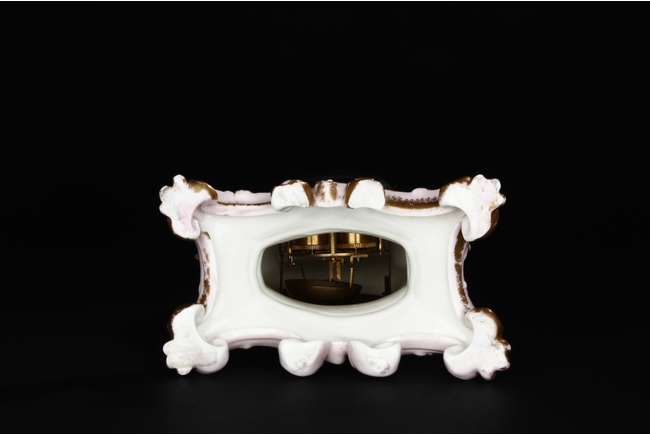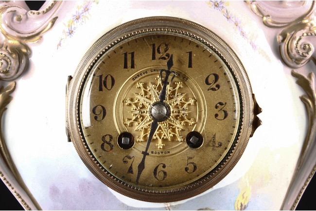 Beautifully crafted, the clock depicts cupids flying amidst clouds, with brooch of flowers on top, the front of clock stamped "Shreve Crump & Low, Boston", indicating it was retailed by the luxury goods importer, and the movement stamped "A. 1". 18th century.