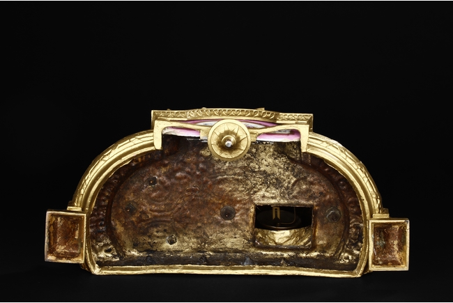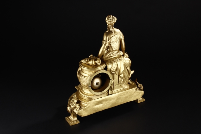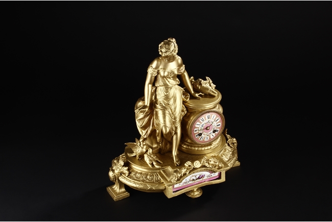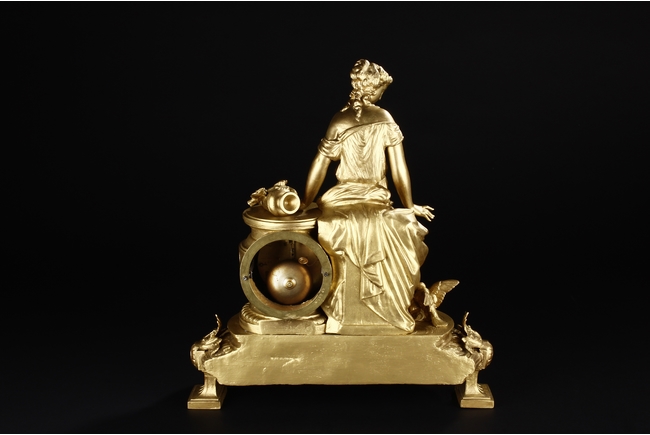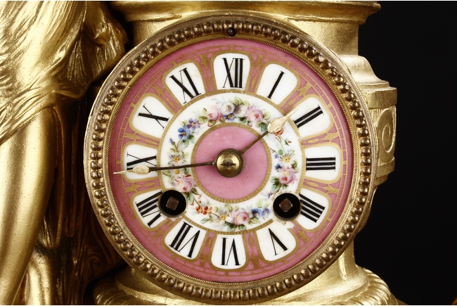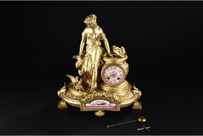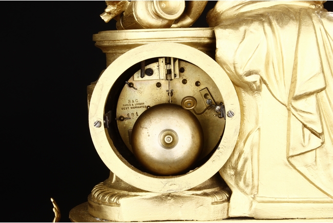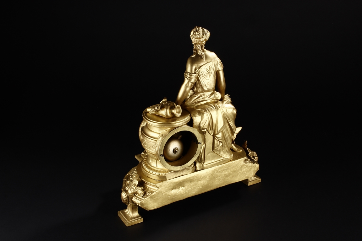 The antique French figural clock depicts a lady leaning near a pedestal with clock movement, watching two birds on the ground, the clock movement made by R&C Paris and London (Richard et Cie.), numbered 681, includes key. 19th century.