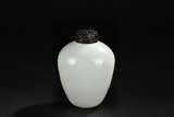 A WHITE GLASS BOTTLE WITH COVER