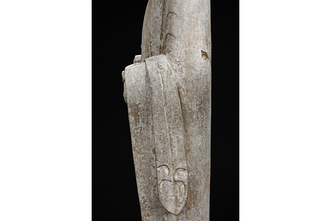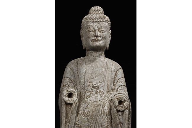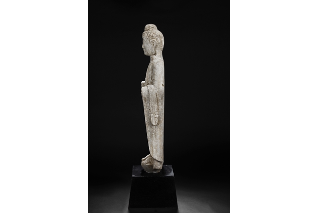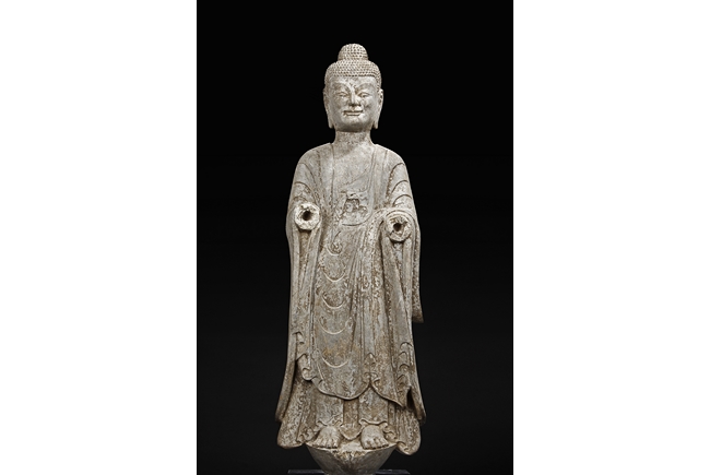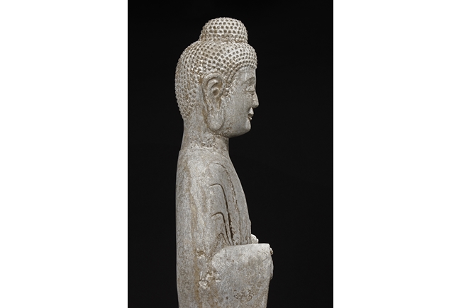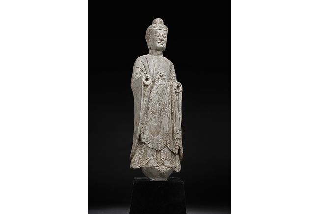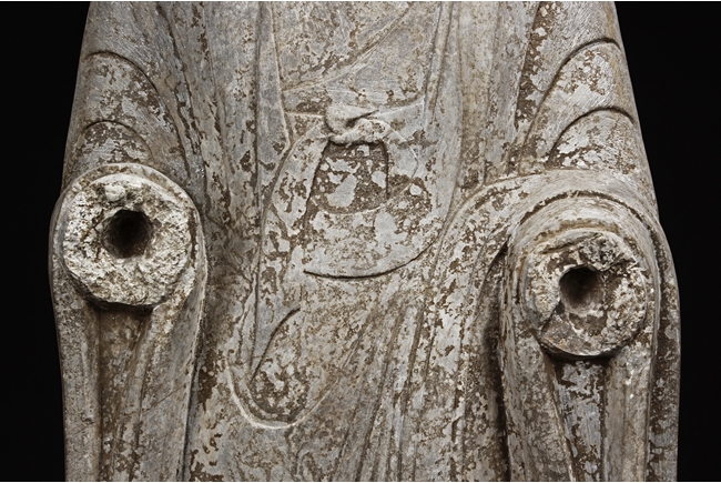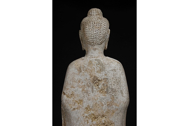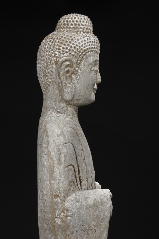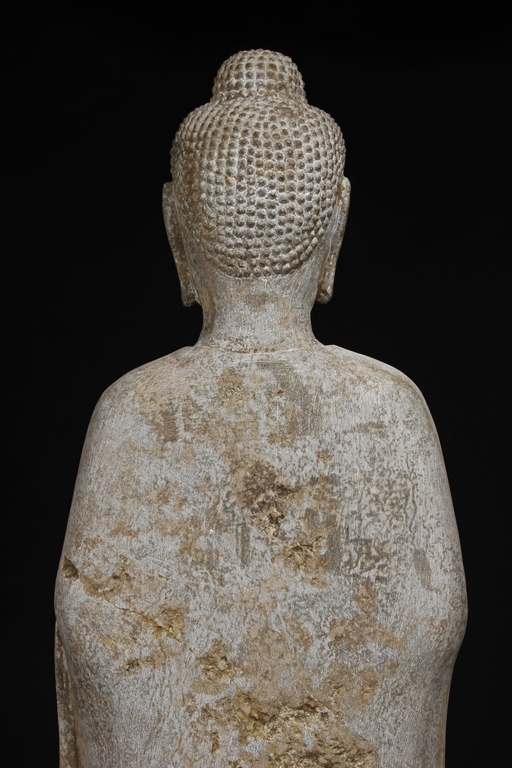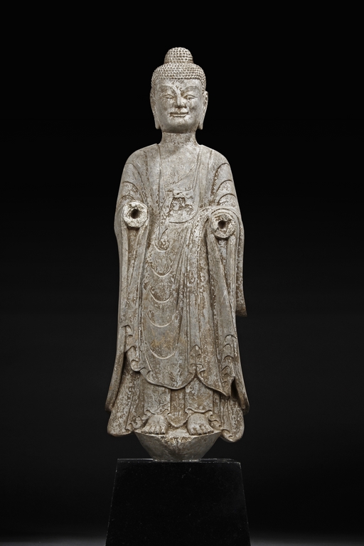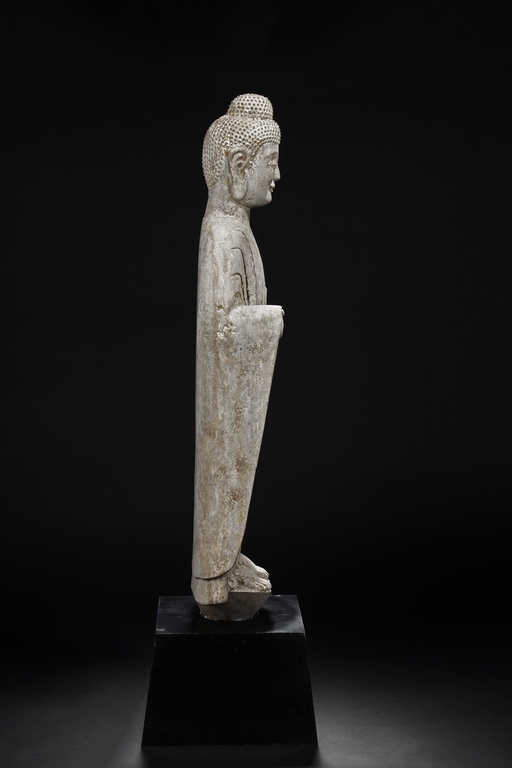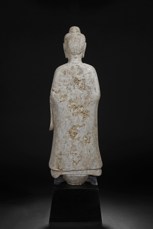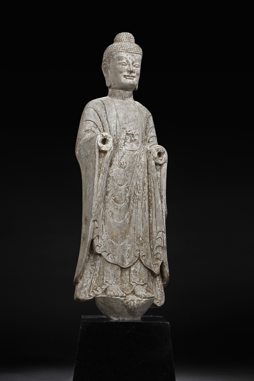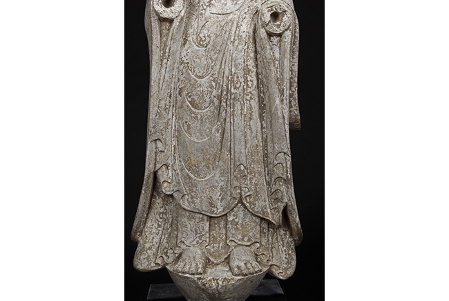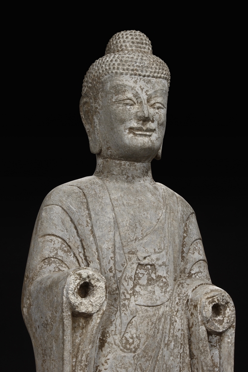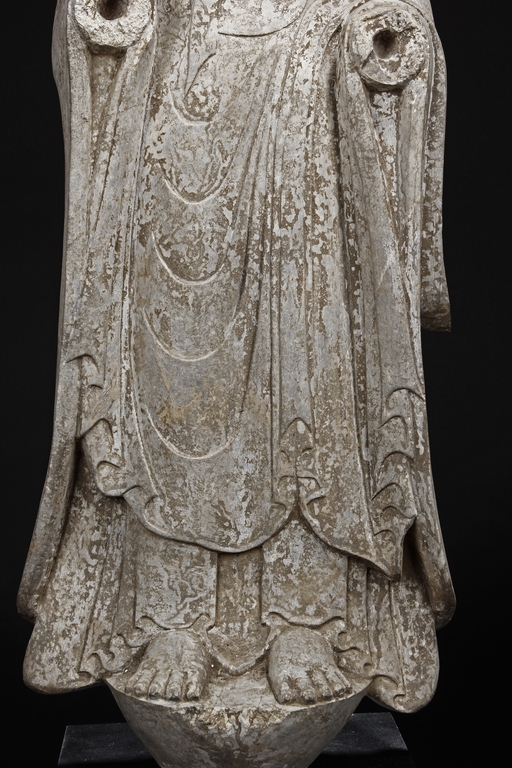 The Bodhisattva is shown standing with missing hands supposedly raised in Abhaya mudra, while wearing a tight fitting calf length mantle and robes draped over the shoulders falling in folds towards the ankle. His face is shown with downcast eyes and serene expression and the hair pulled into a knop. Northern Qi Dynasty period.