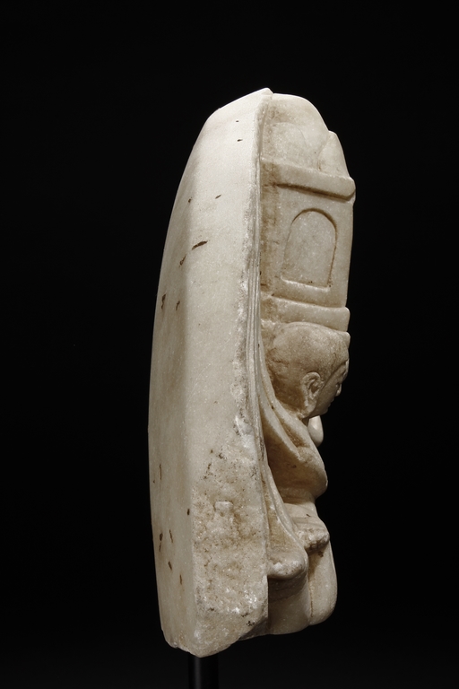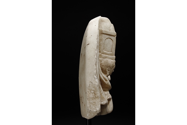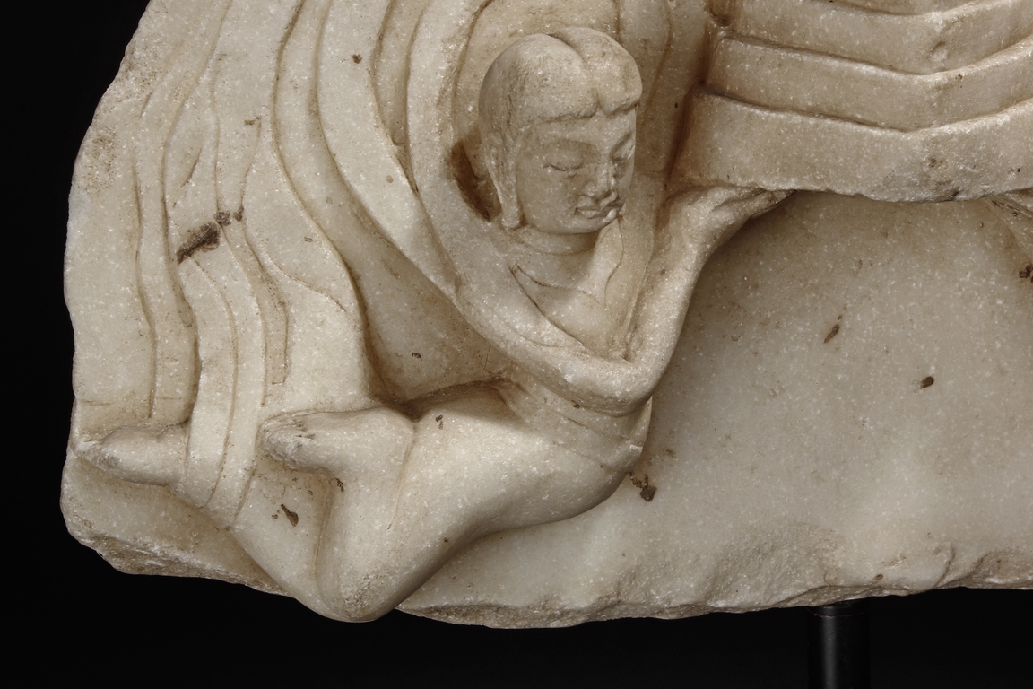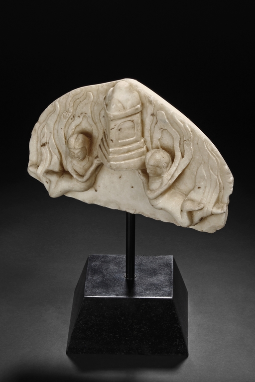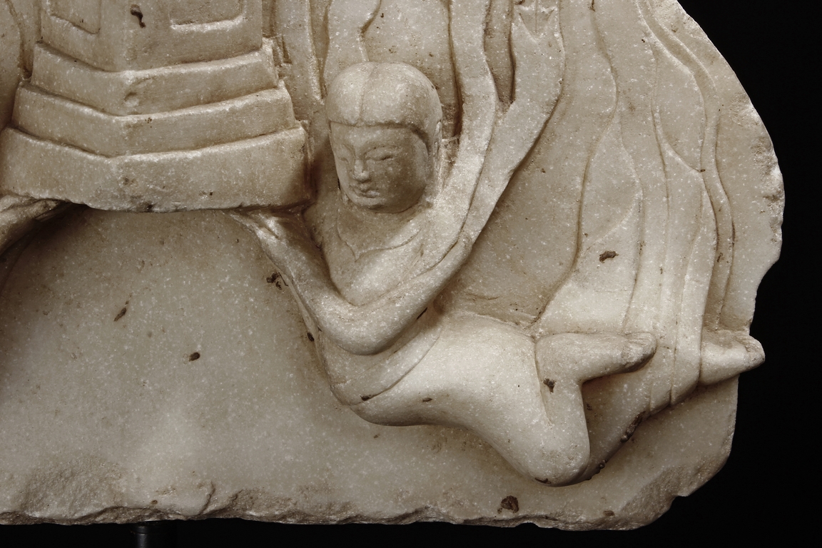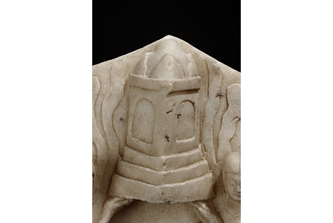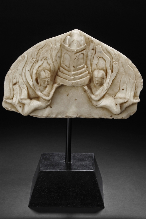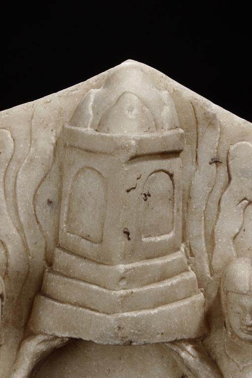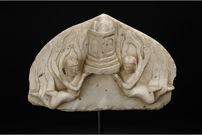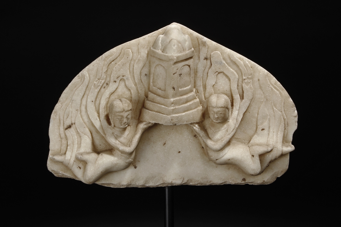 The carving is shown with two Fei'tian, or Apsara, raising a sacred pagoda with a shape of a triangular mountain on the top. The Fei'tian's body is covered with celestial ribbons flying upwards, each face is detailed with downcast eyes, elongated eyes, pendulous earlobes, and hair parted in middle.