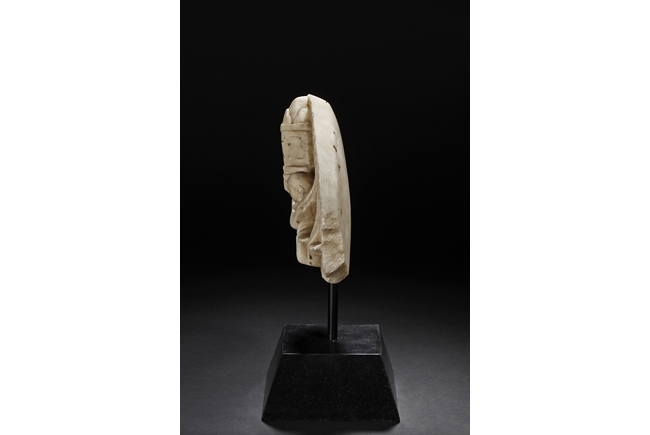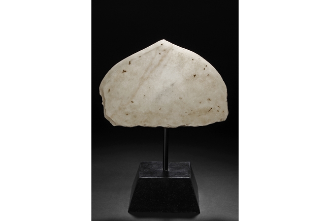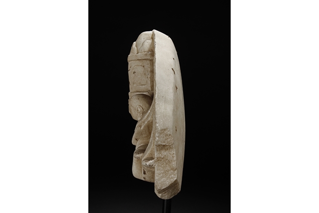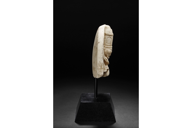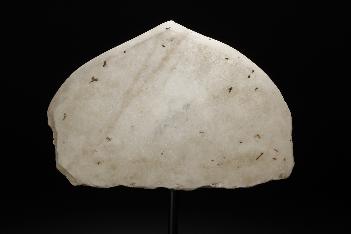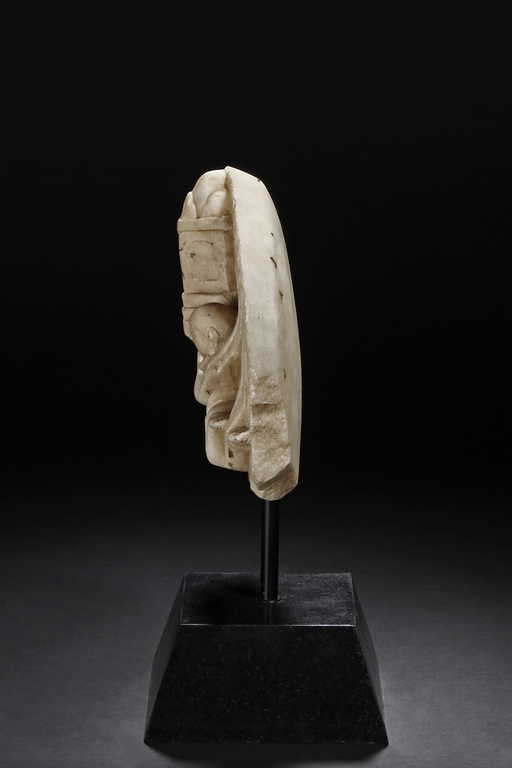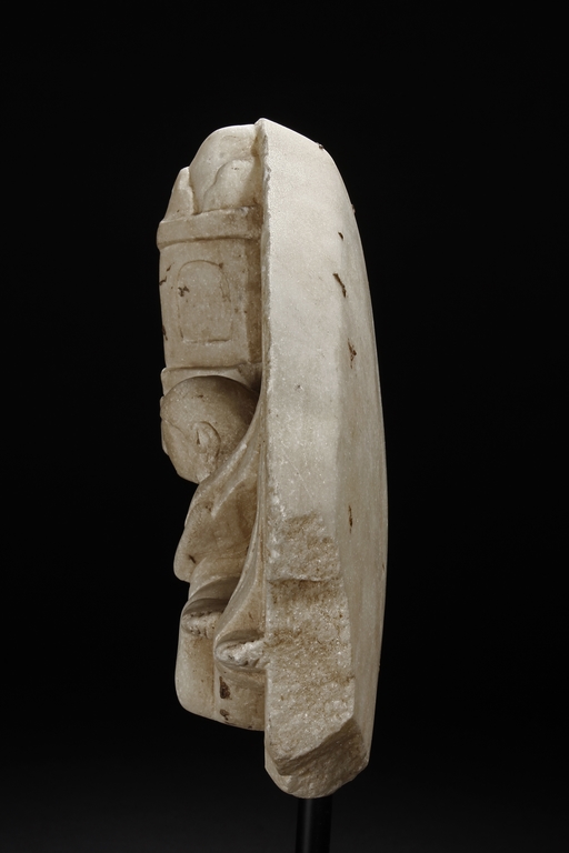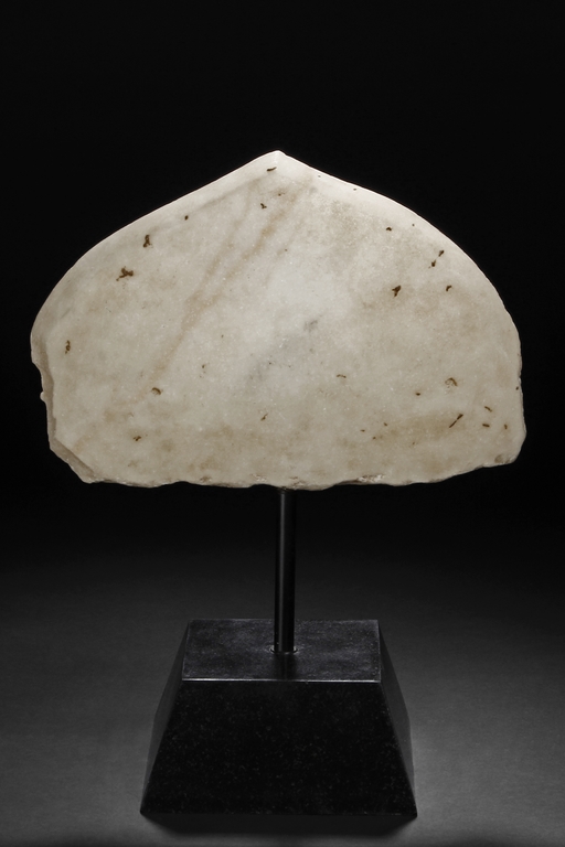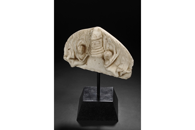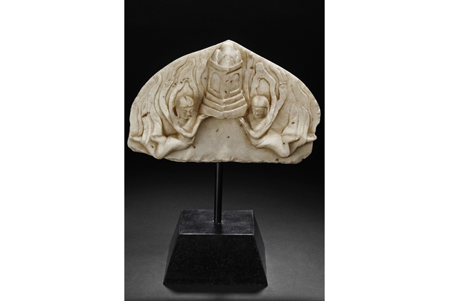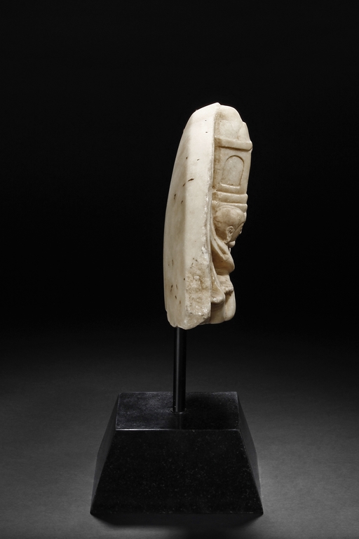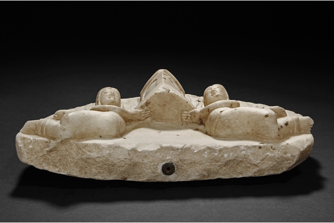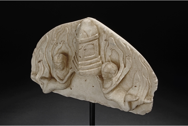 The carving is shown with two Fei'tian, or Apsara, raising a sacred pagoda with a shape of a triangular mountain on the top. The Fei'tian's body is covered with celestial ribbons flying upwards, each face is detailed with downcast eyes, elongated eyes, pendulous earlobes, and hair parted in middle.