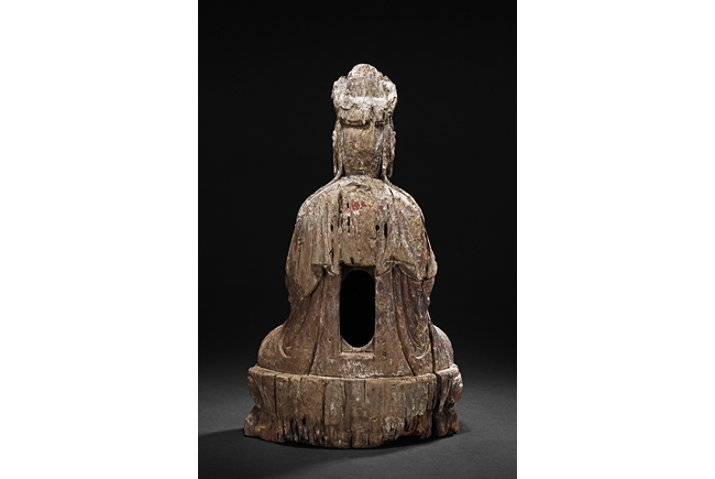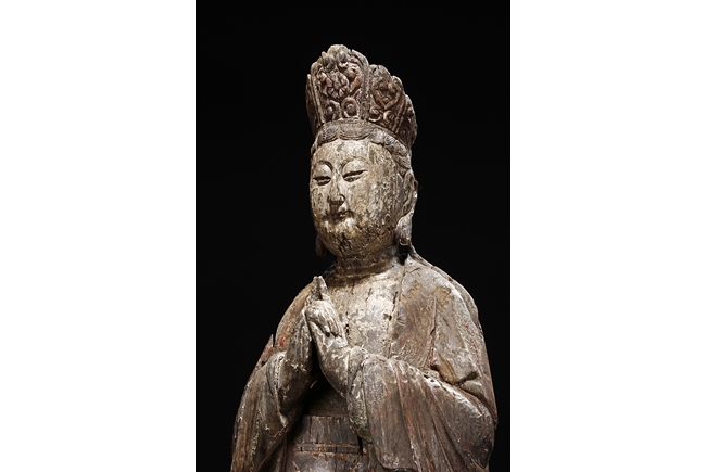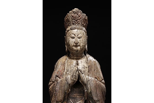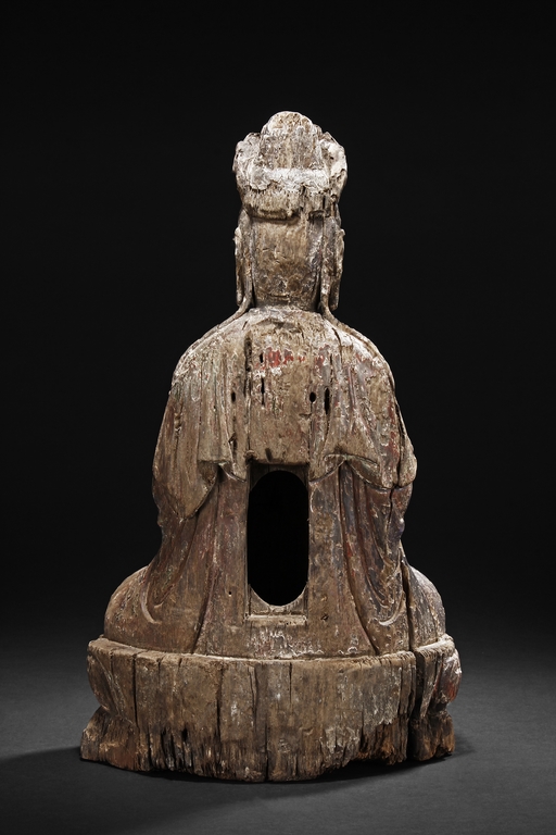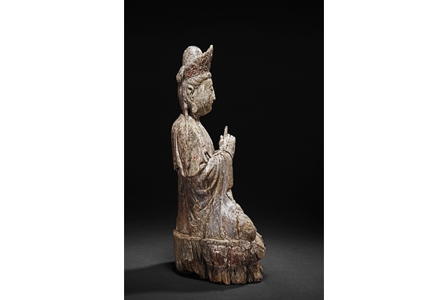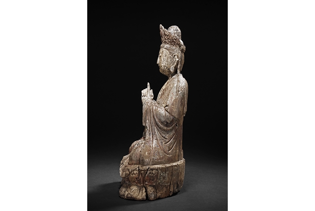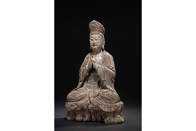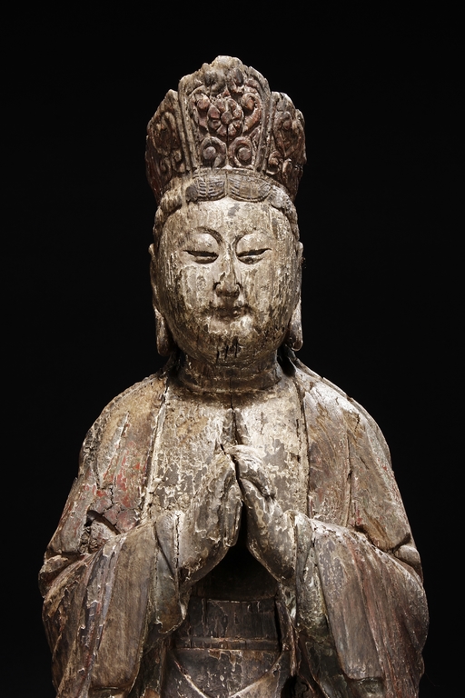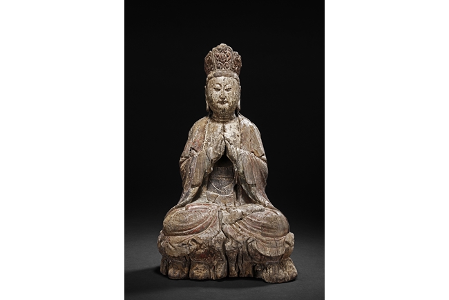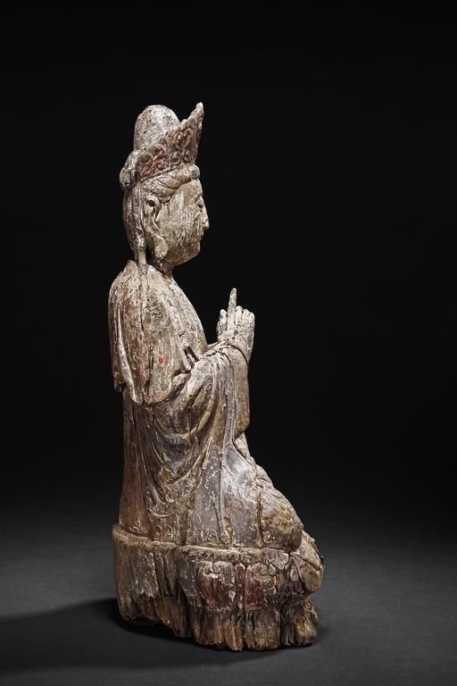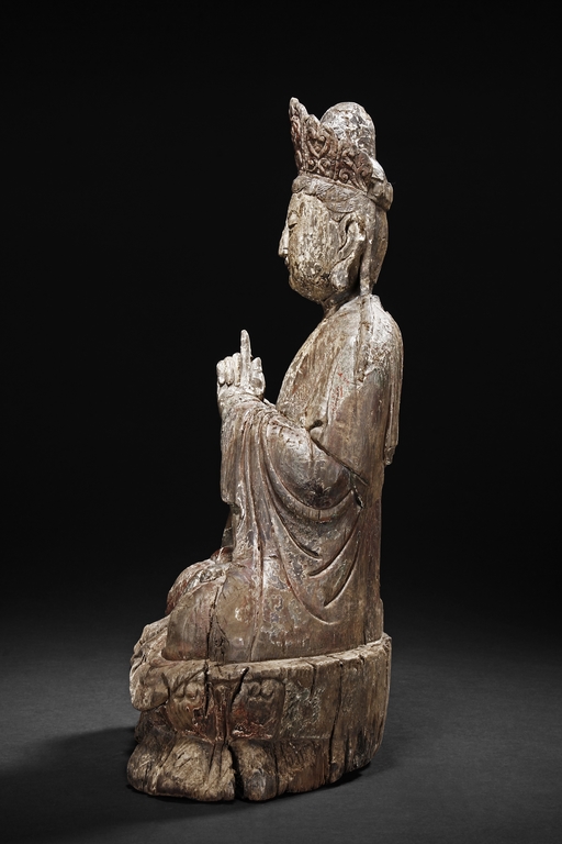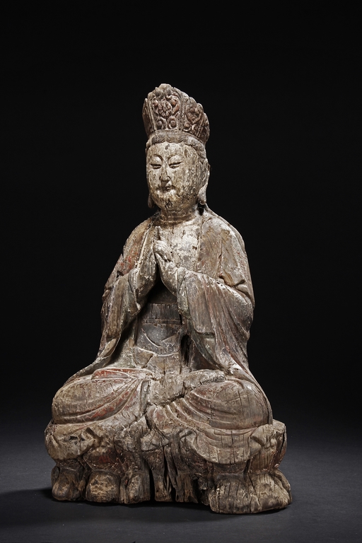 The Bodhisattva is shown seated in dhyanasana on a plinth, with hands clasped together in abhisekana mudra, wearing a long robe falling in folds and left open chest, the face delicately depicted in serene and benevolent expression, flanked by pendulous and long earlobes, with hair detailed with incised lines and pulled into chignon wearing a tall crown decorated with scrolling ruyi motif.