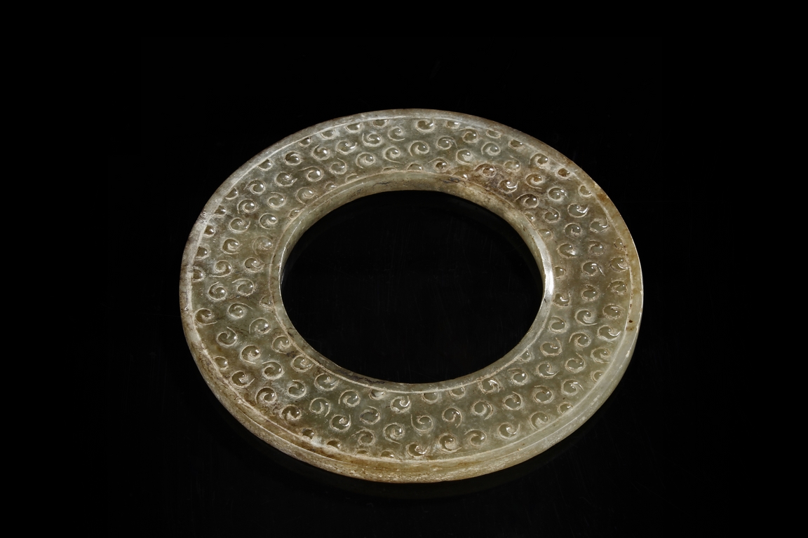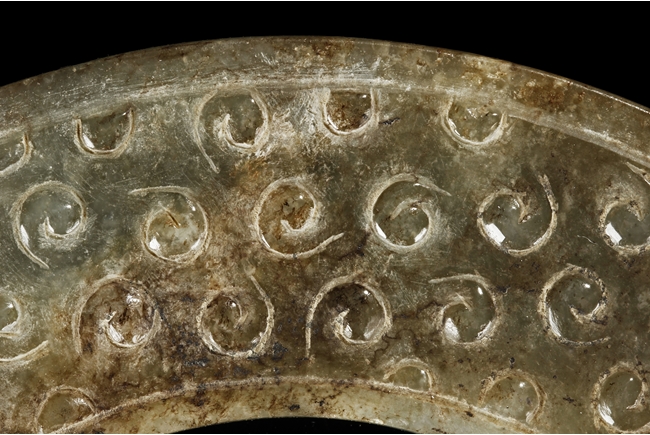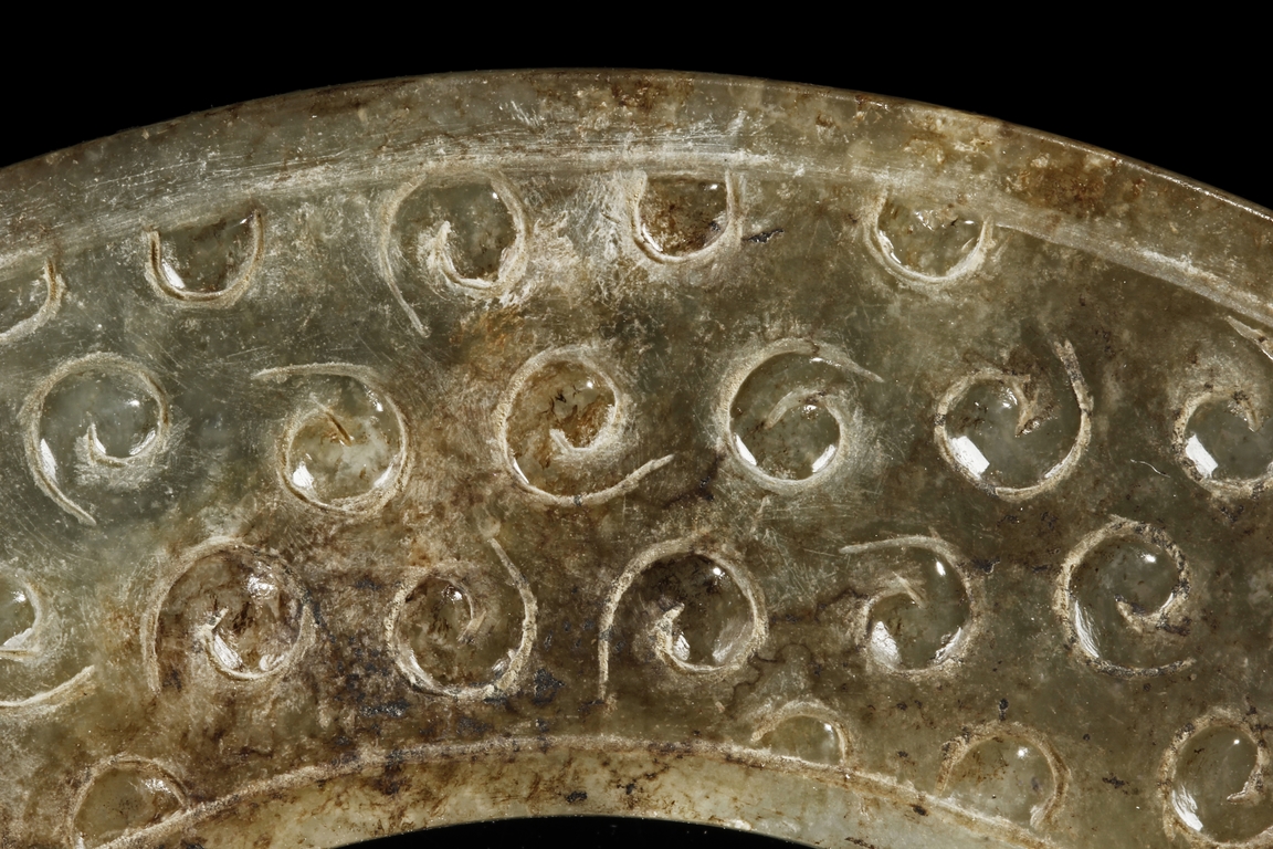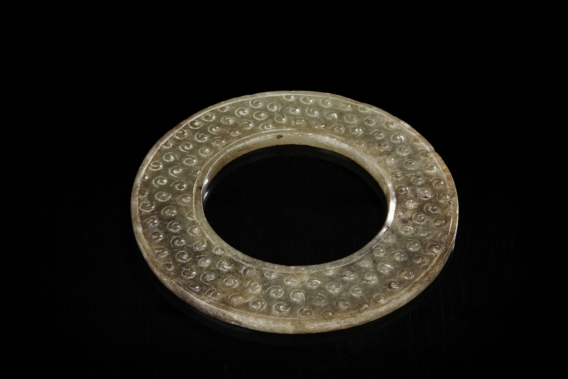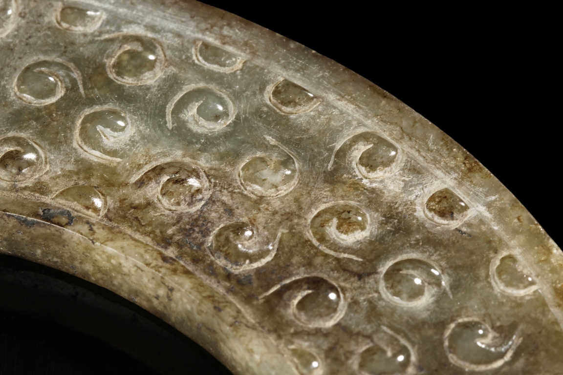 In the form of circular shape disc, the surface is carved with dense rows of spirals, the stone is of deep celadon tone with brown mottling.