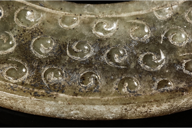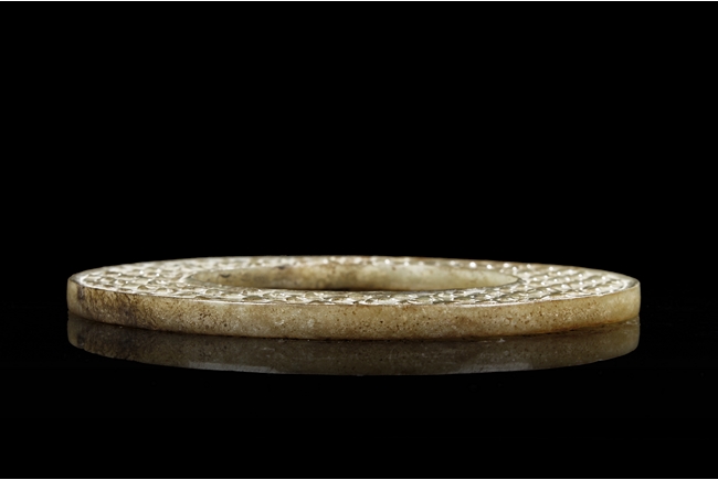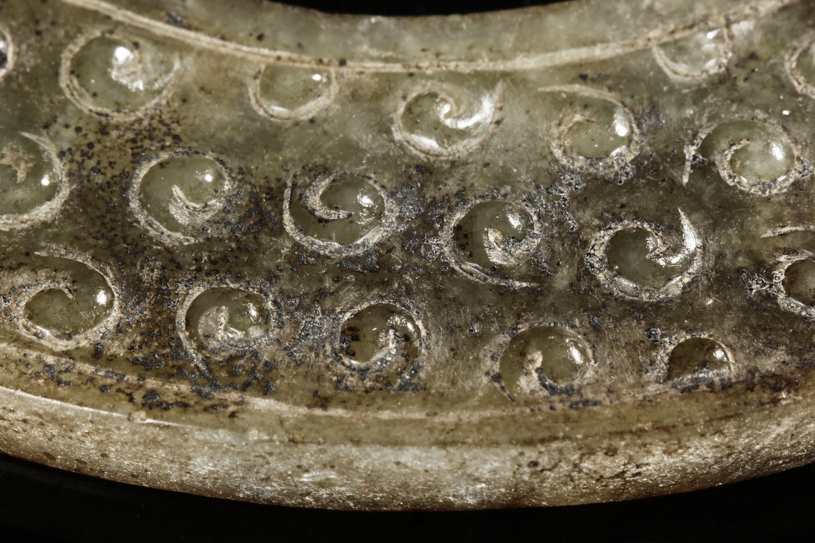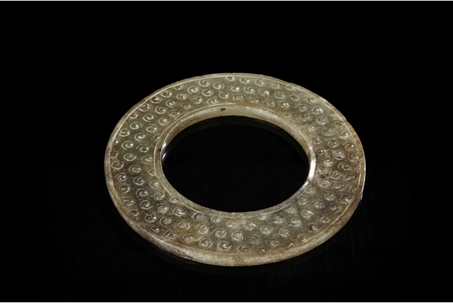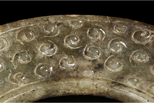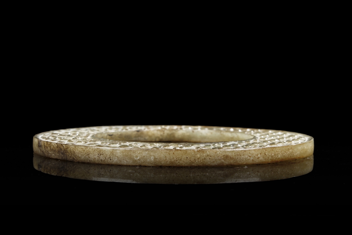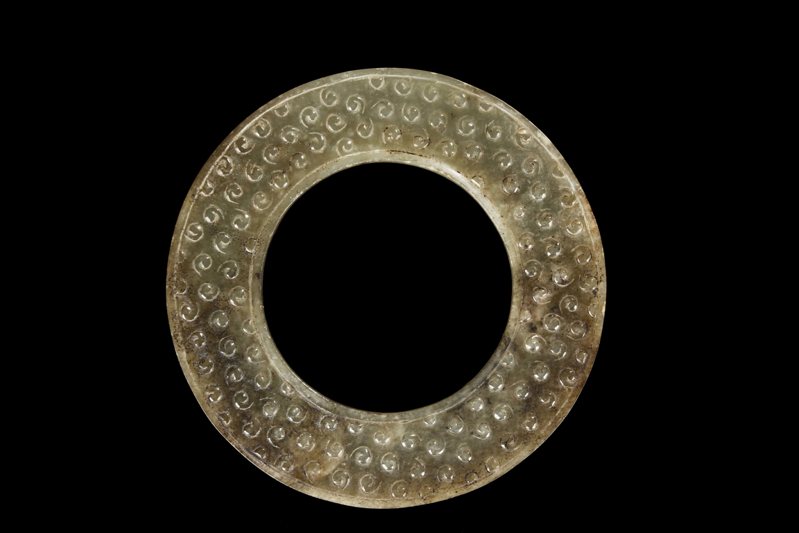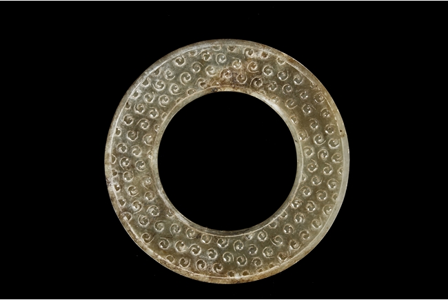 In the form of circular shape disc, the surface is carved with dense rows of spirals, the stone is of deep celadon tone with brown mottling.