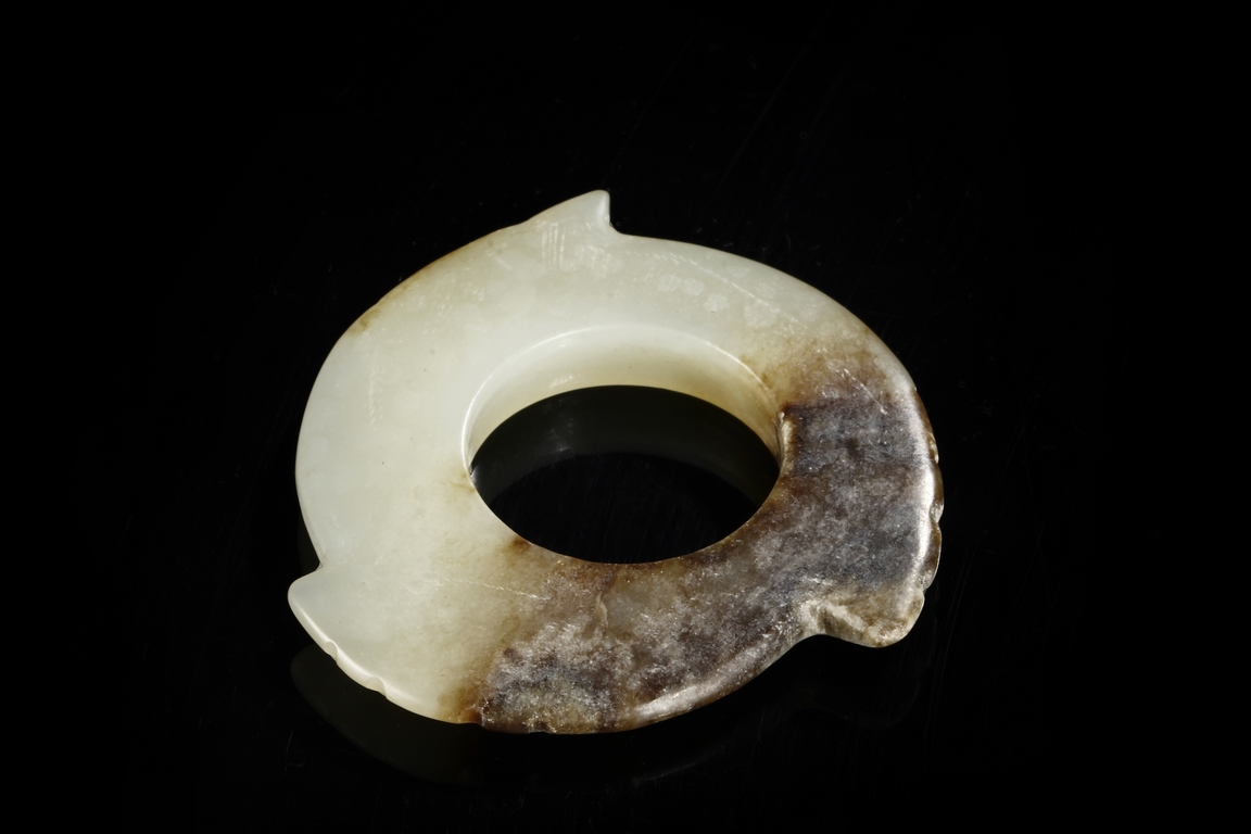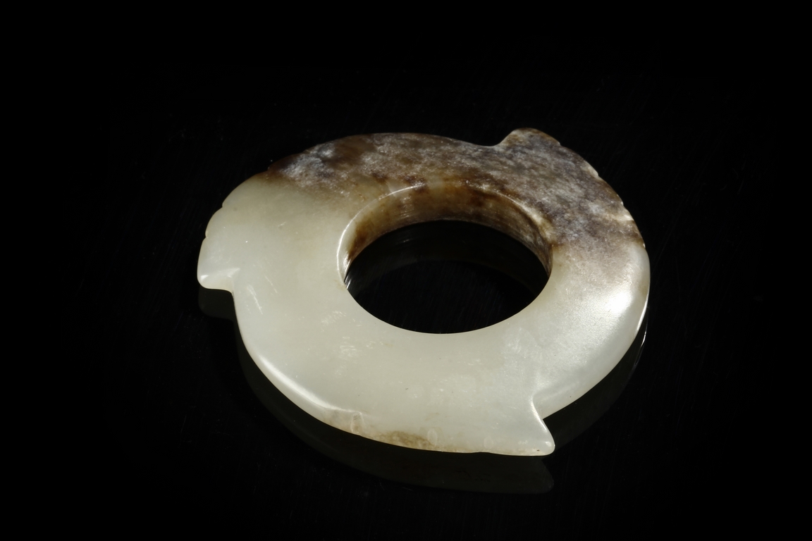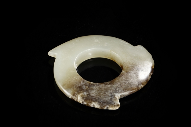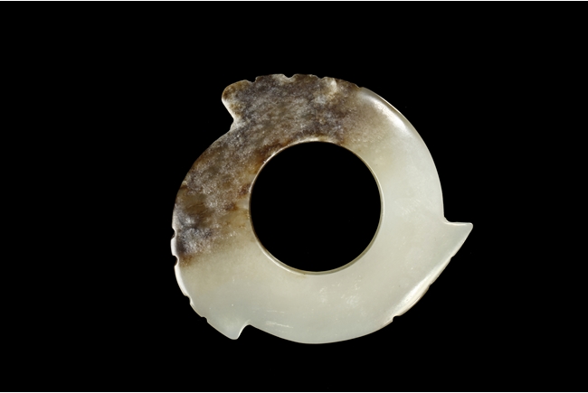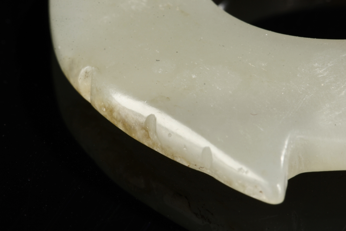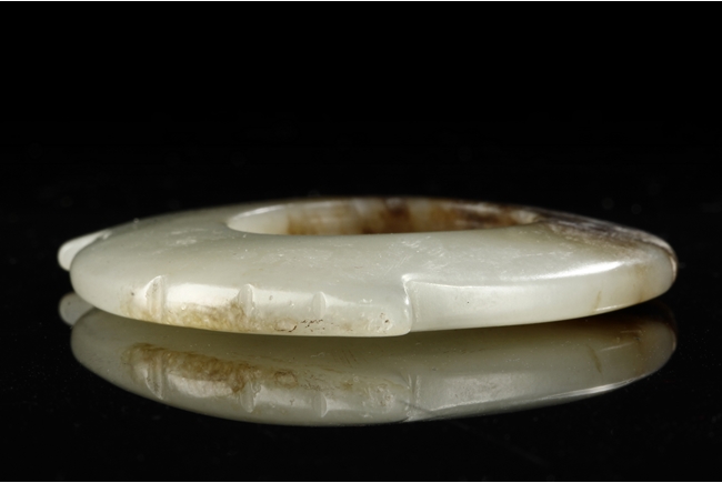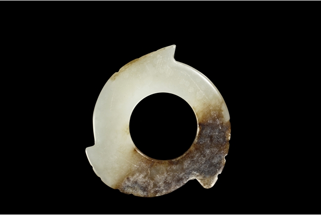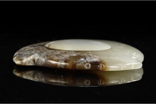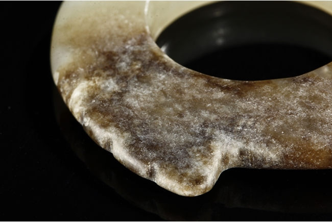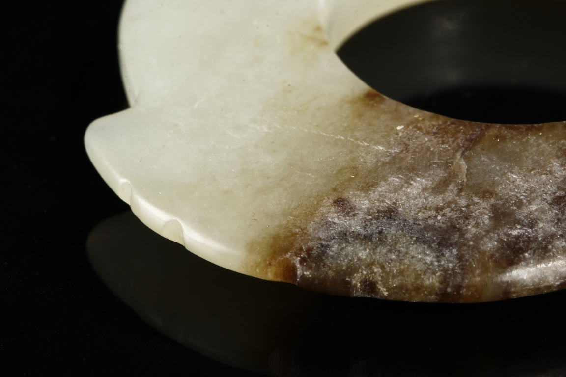 Of circular shape with hollow center, the exterior rim is carved with three arcs similar to 'flying teeth', each rising to a point. The stone is of white and dark russet tone.