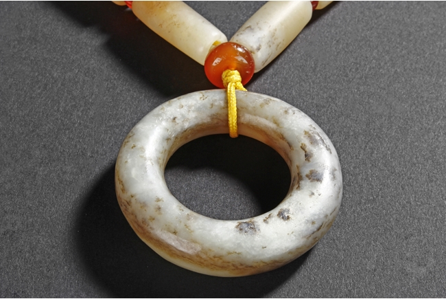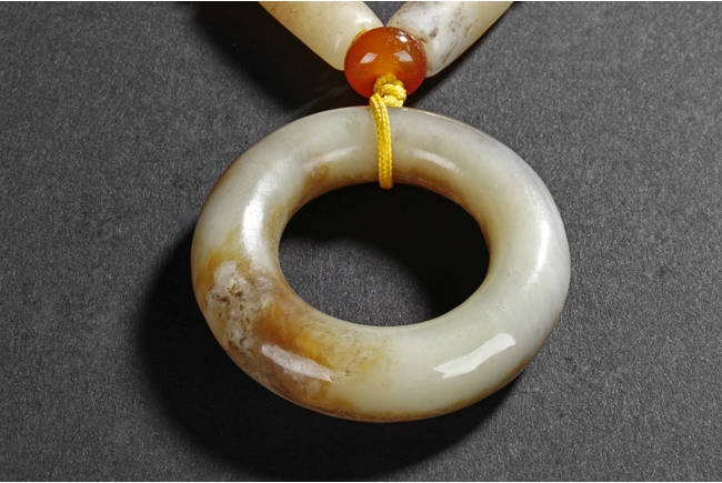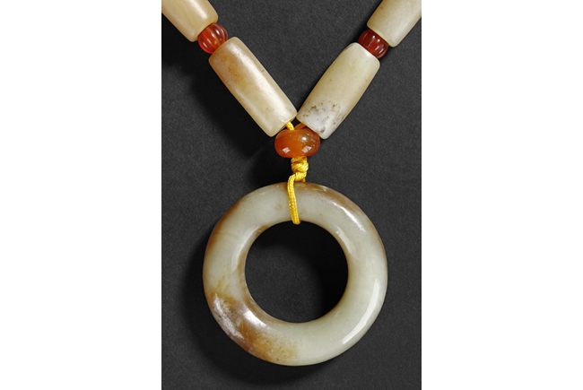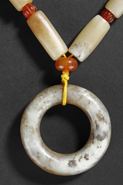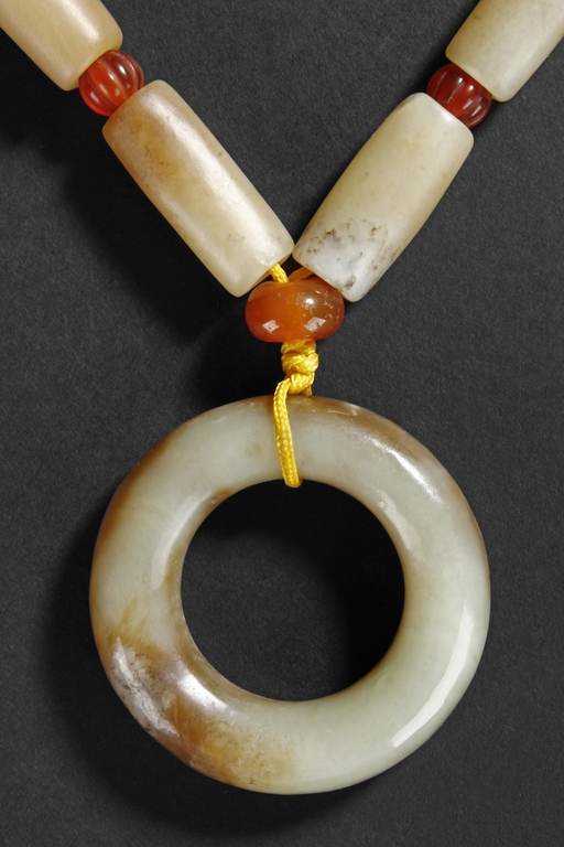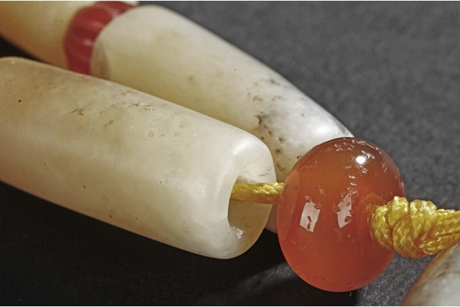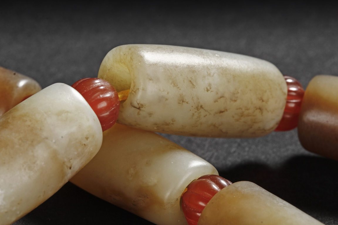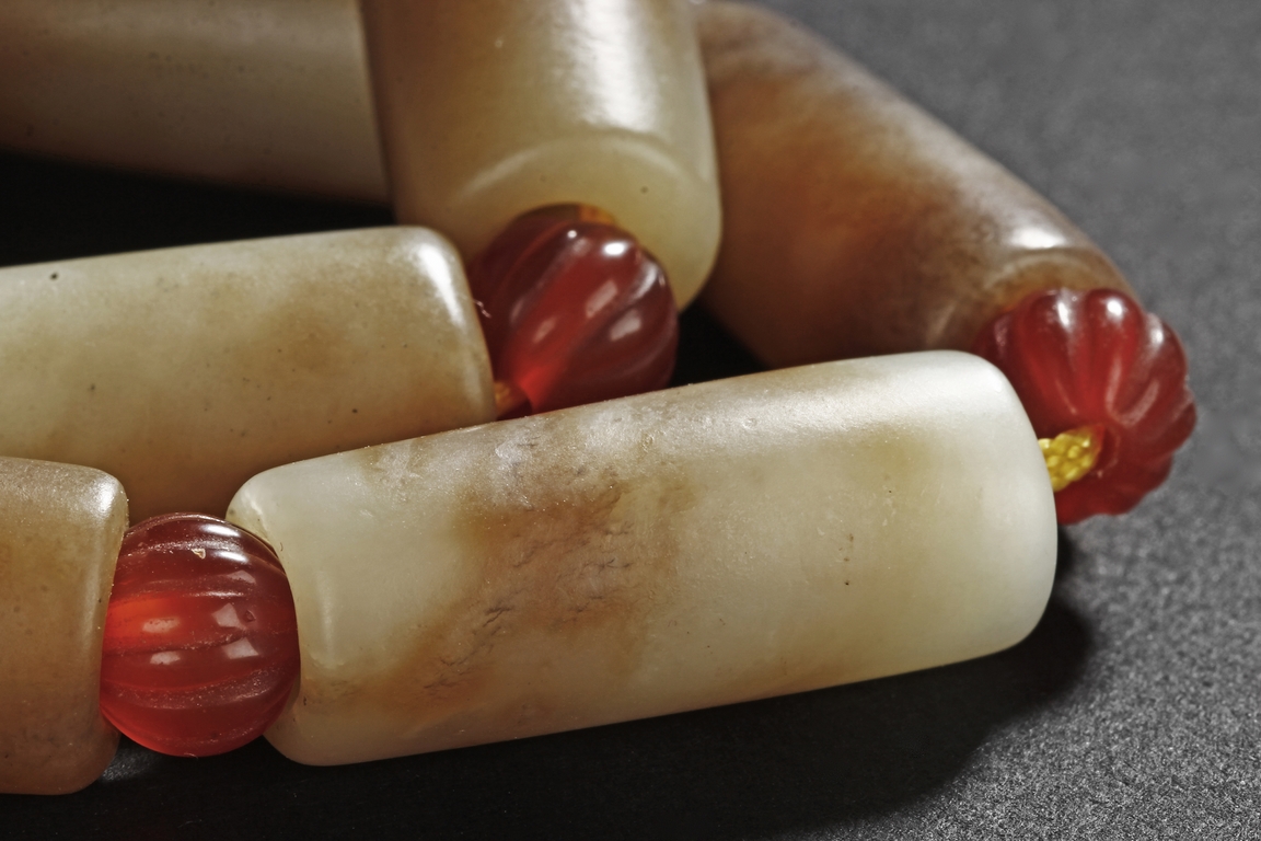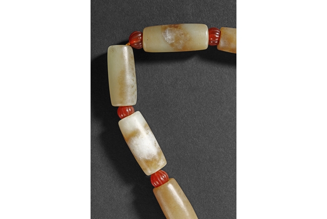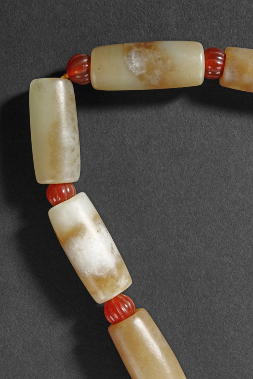 The necklace consists of twenty archaic cylindrical brownish jades from Qi culture, spaced out by translucent red bead, terminating with an archaic jade ring.