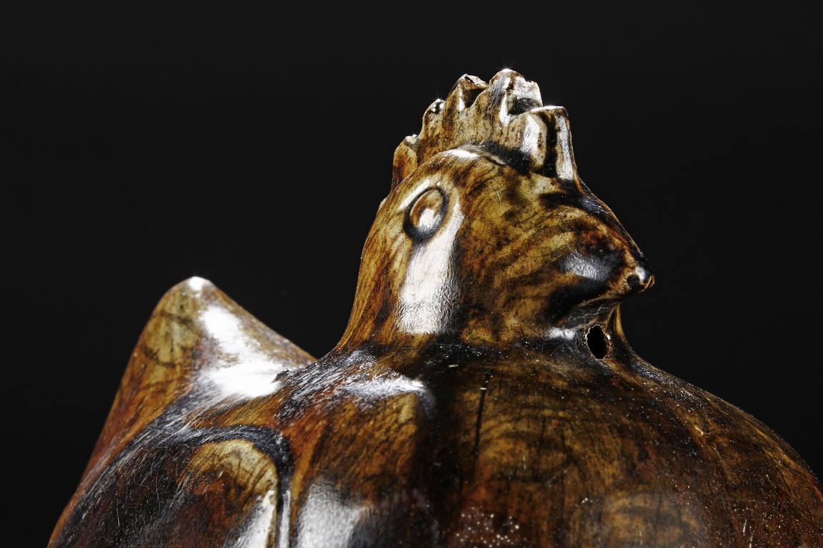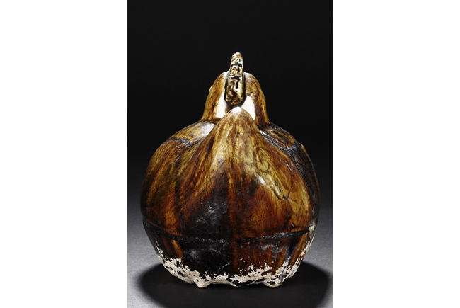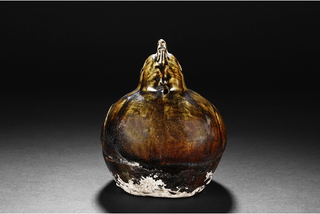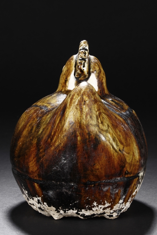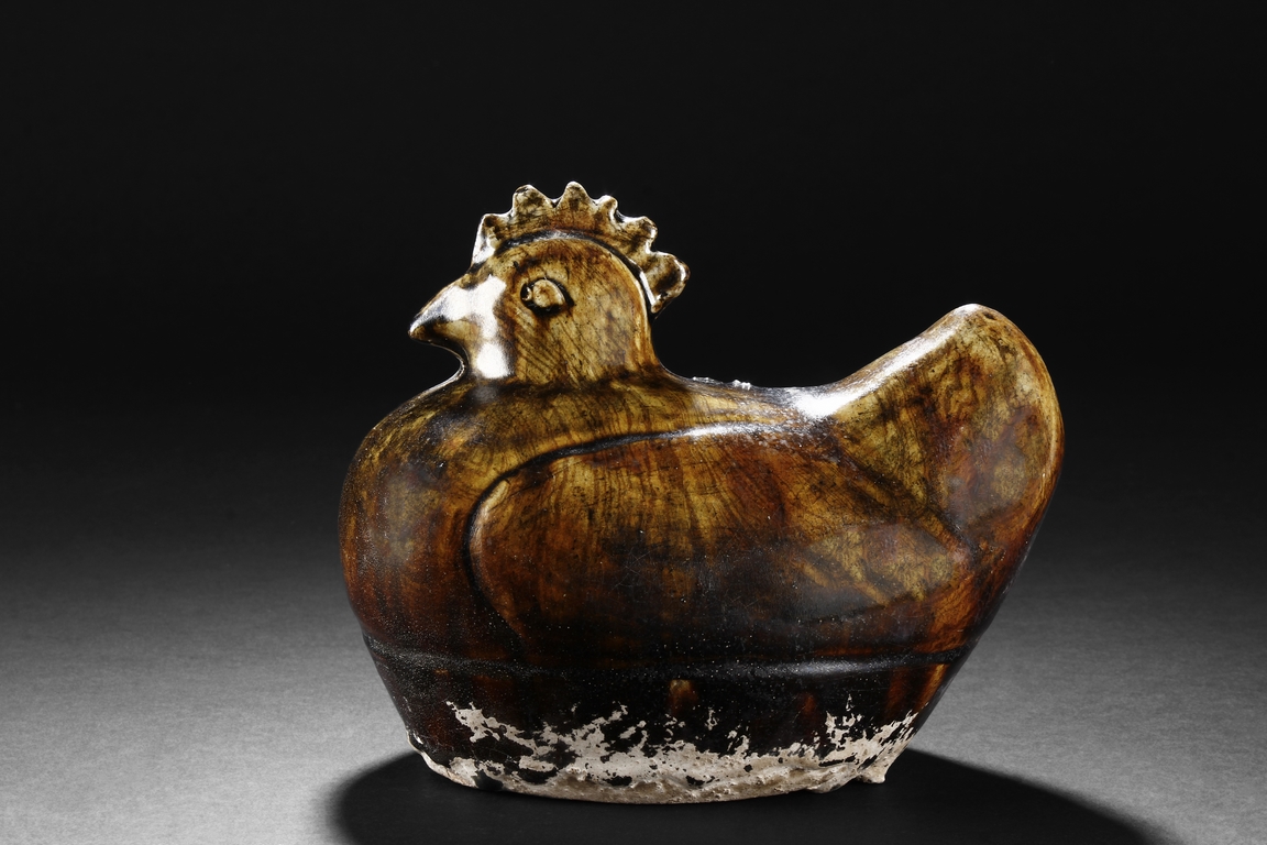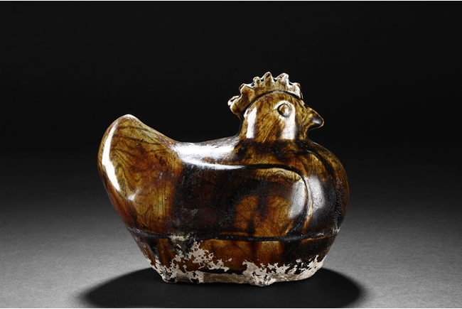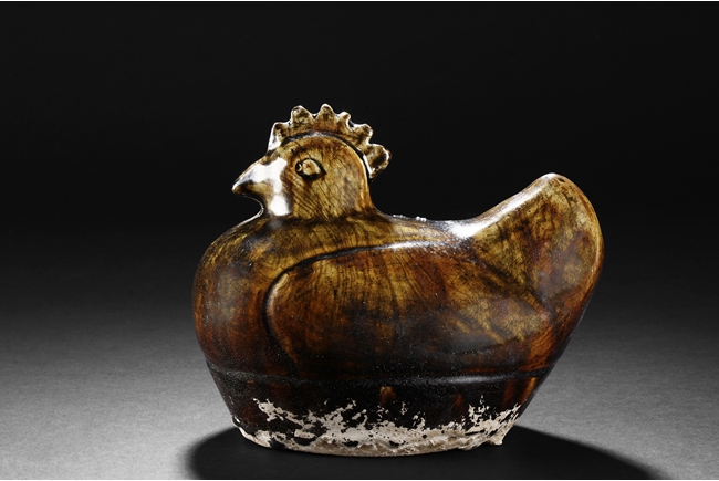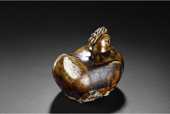 The figure depicts a chicken laying on the ground with its underside, wings by the side, and tail raised, glazed in brown and black color, and unglazed on the bottom with a hole. Song Dynasty period.
