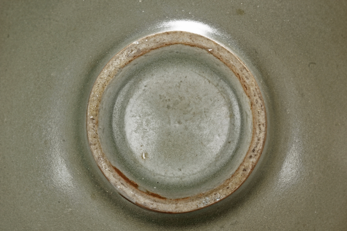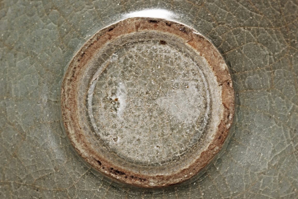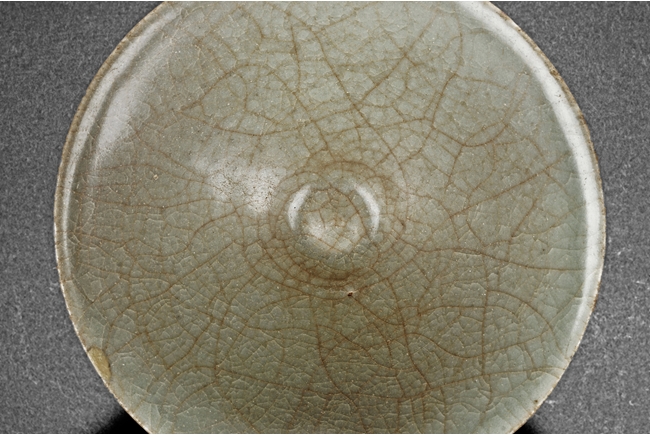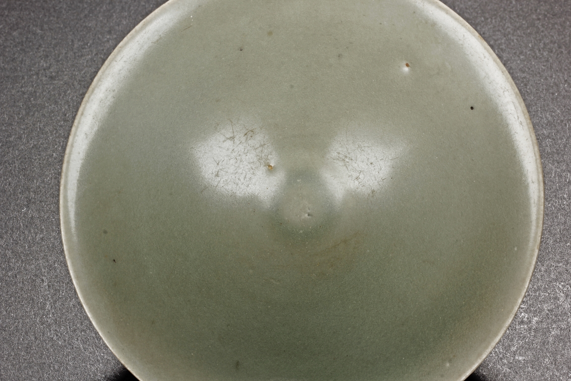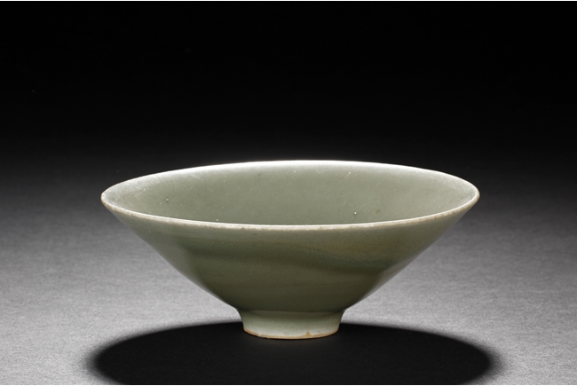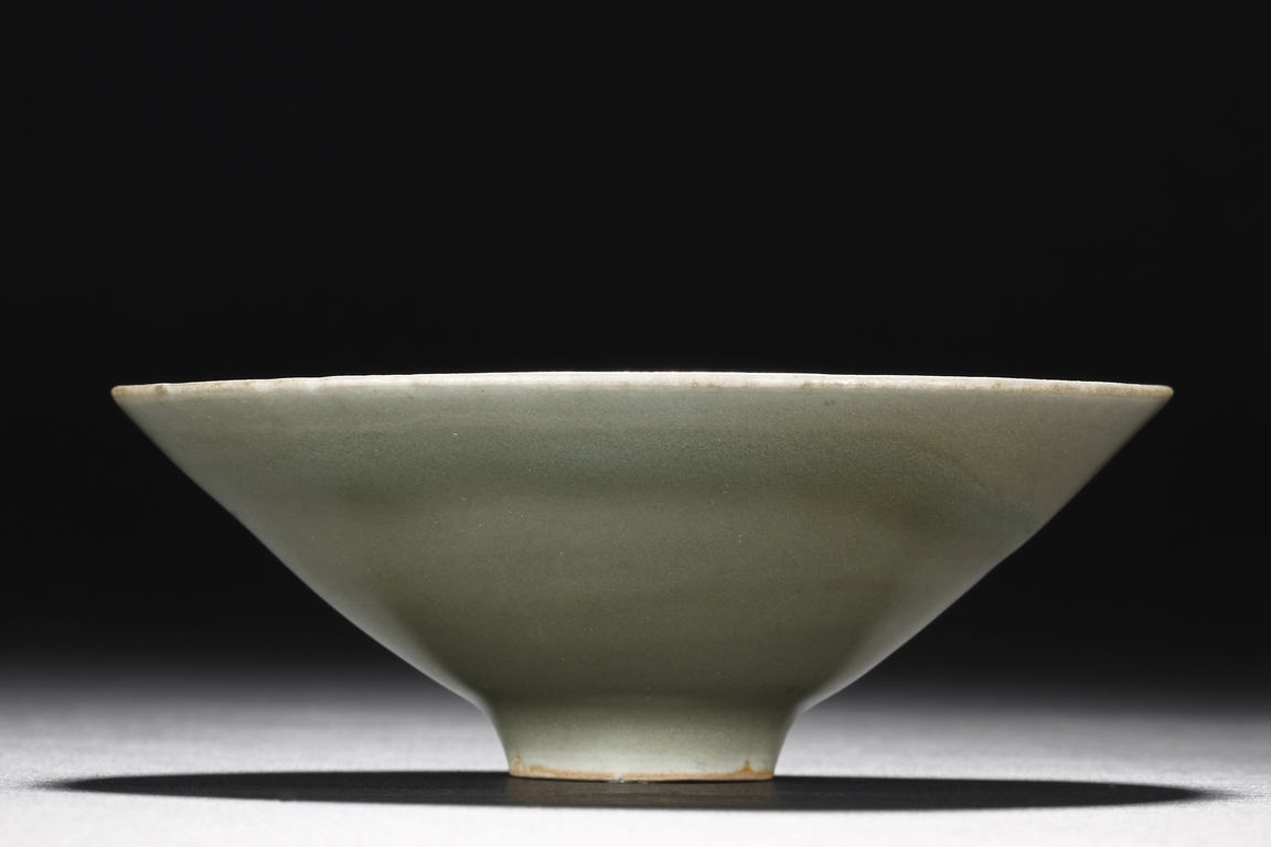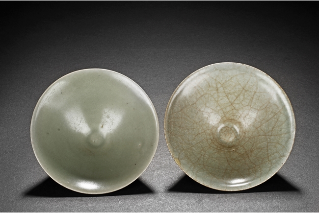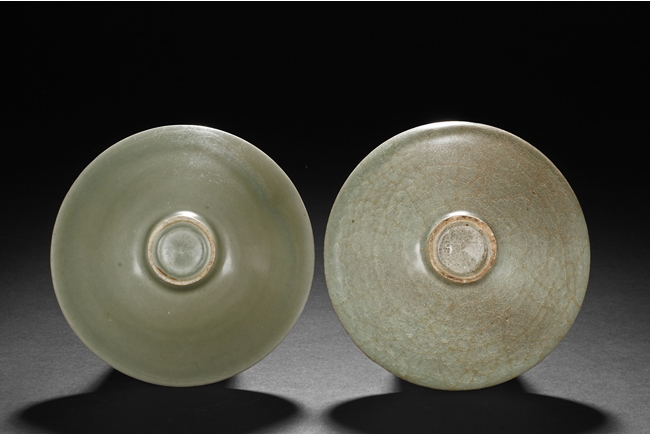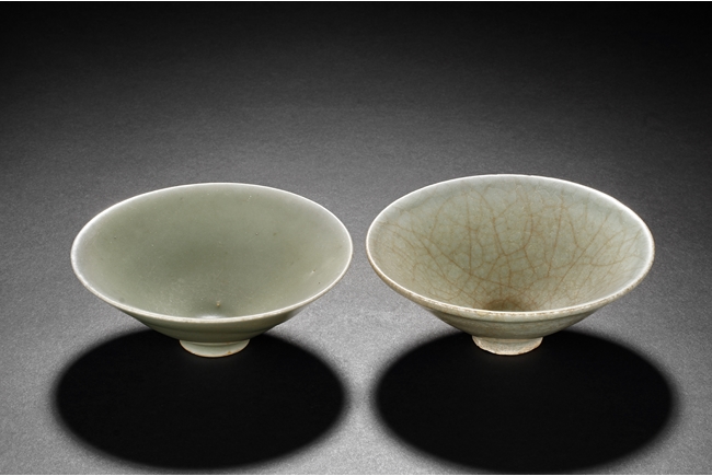 Of conical form, the pair of bowls tapers sharply from the rim to the ring foot, the exterior glazed in celadon color, one bowl has more visible crackle patterns, the foot ring unglazed. Southern Song Dynasty period.
