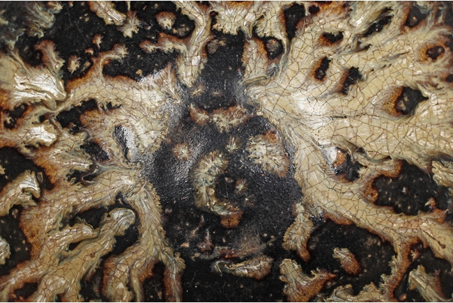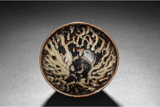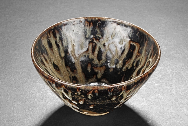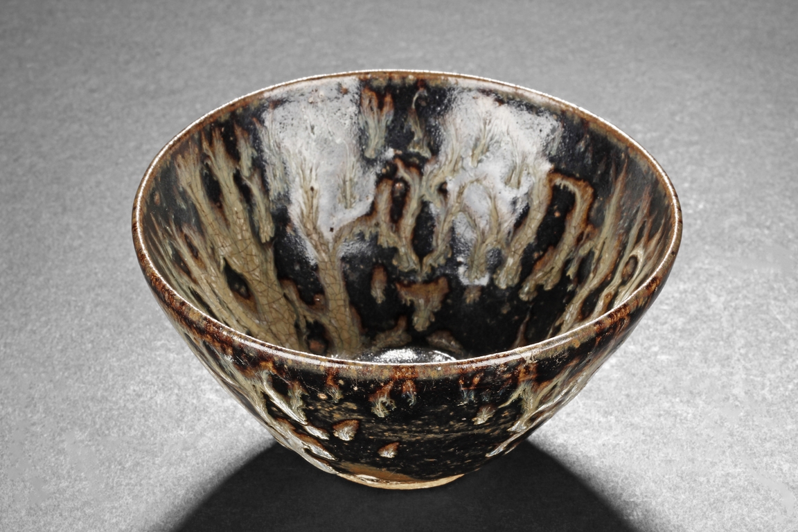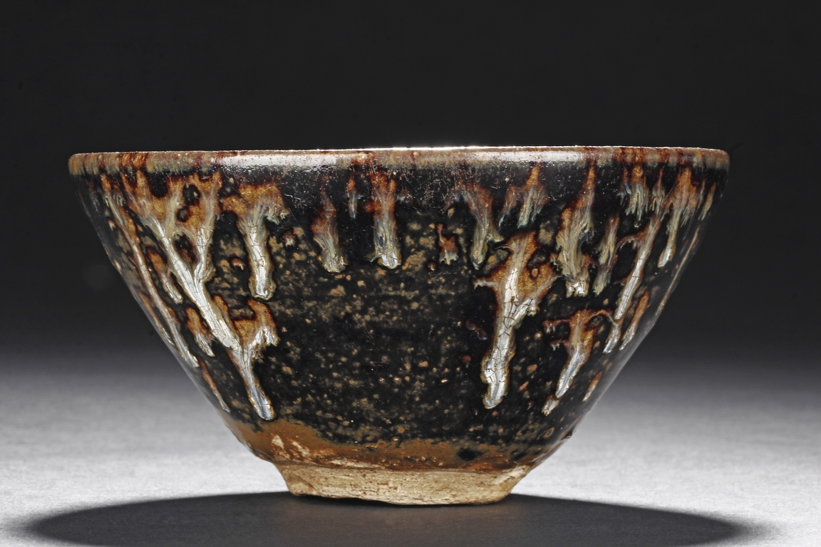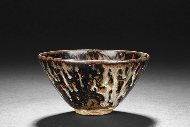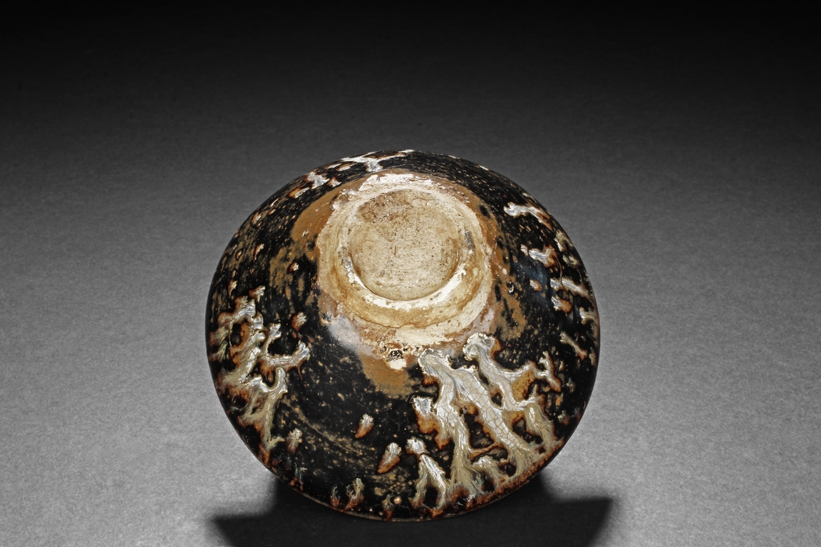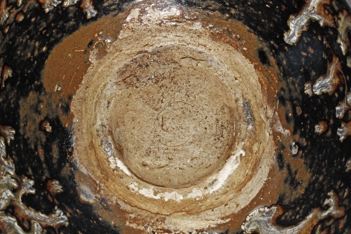 Glazed in black with white and orange oil drip patterns on the side, the bowl remain unglazed on the bottom, the interior with similar design. Northern Song Dynasty period.