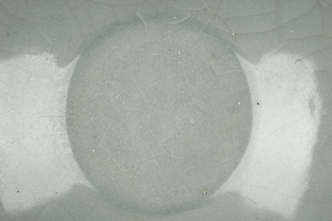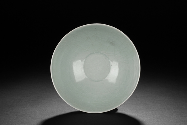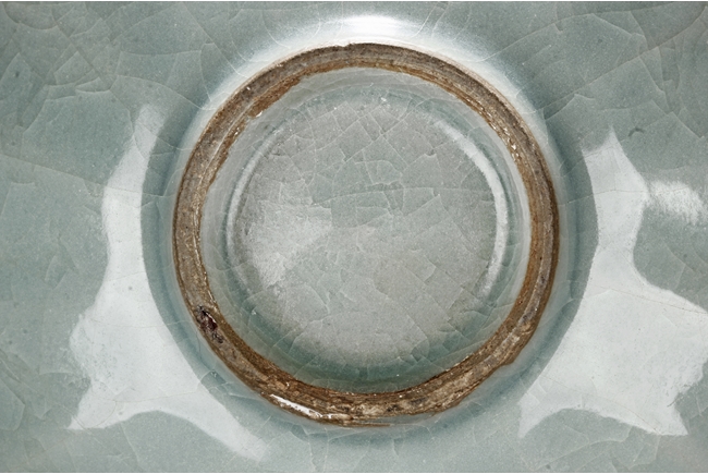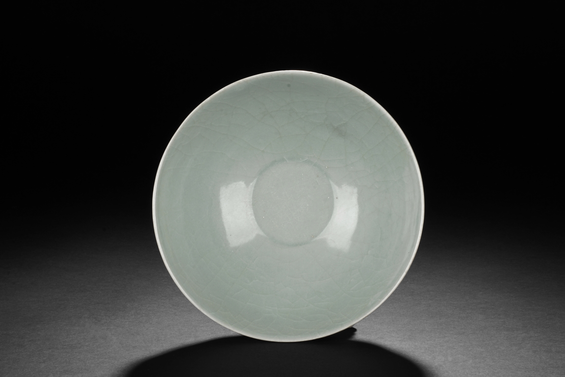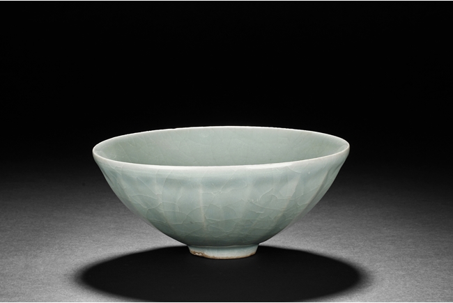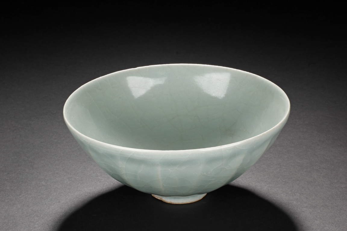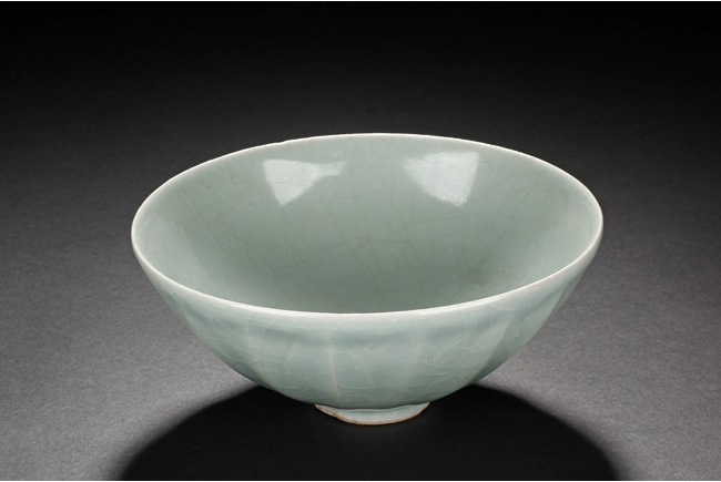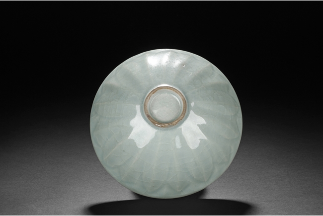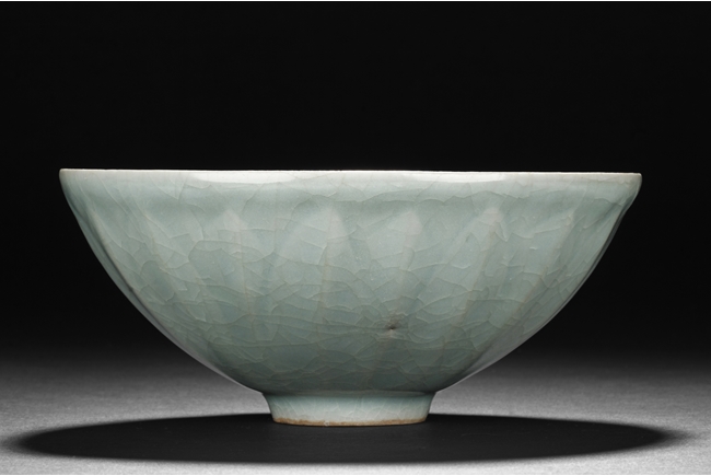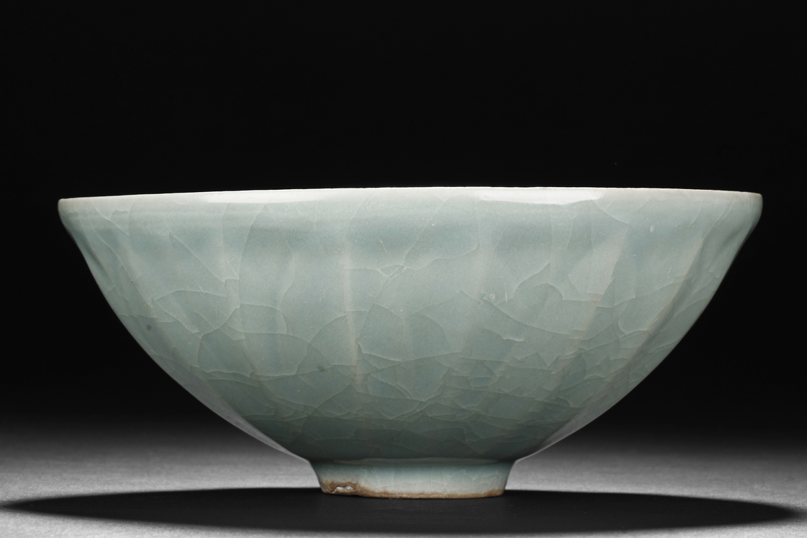 The bowl's exterior is of lotus flower petal form, glazed in celadon color with crackle patterns, the bottom ring unglazed. Southern Song Dynasty period.