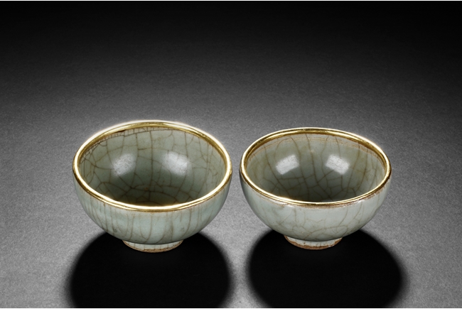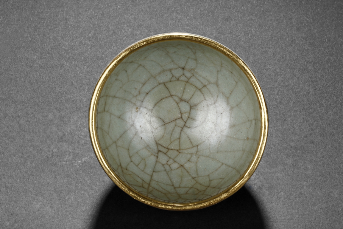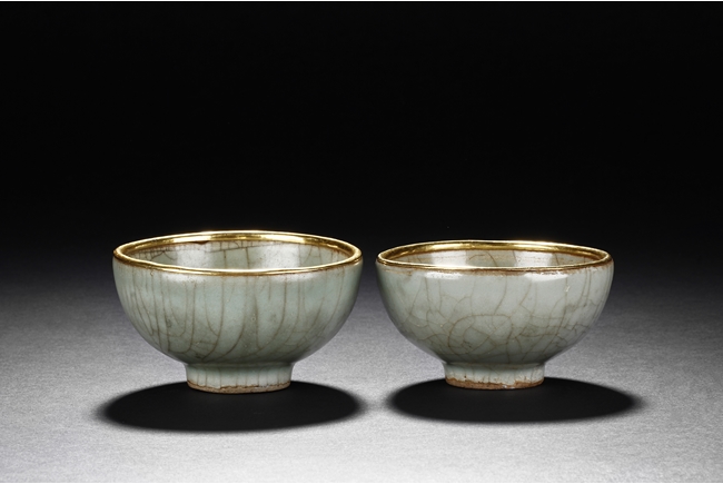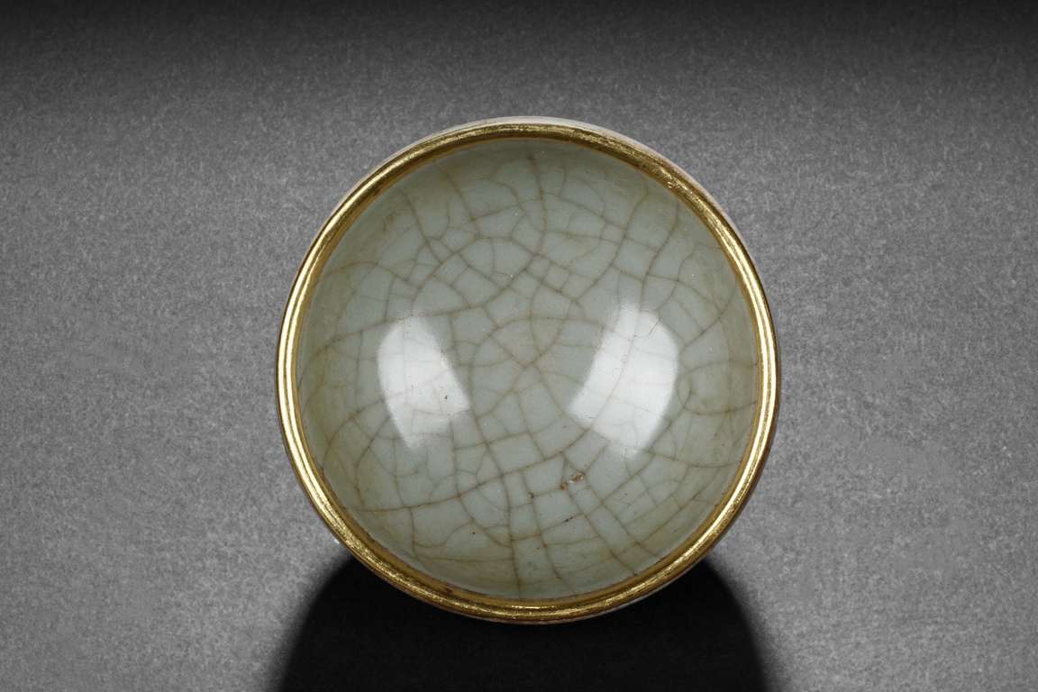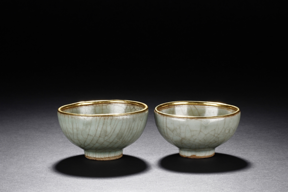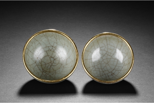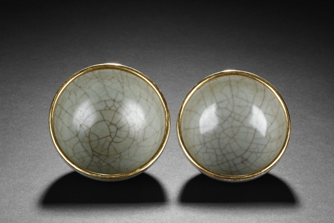 The pair of bowls tapers smoothly to the straight foot ring, the body glazed in celadon with crackle patterns, the rims covered in gilt bronze, the interior with similar design, and the bottom foot ring unglazed.
