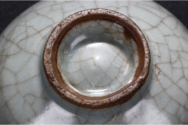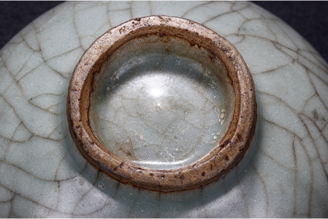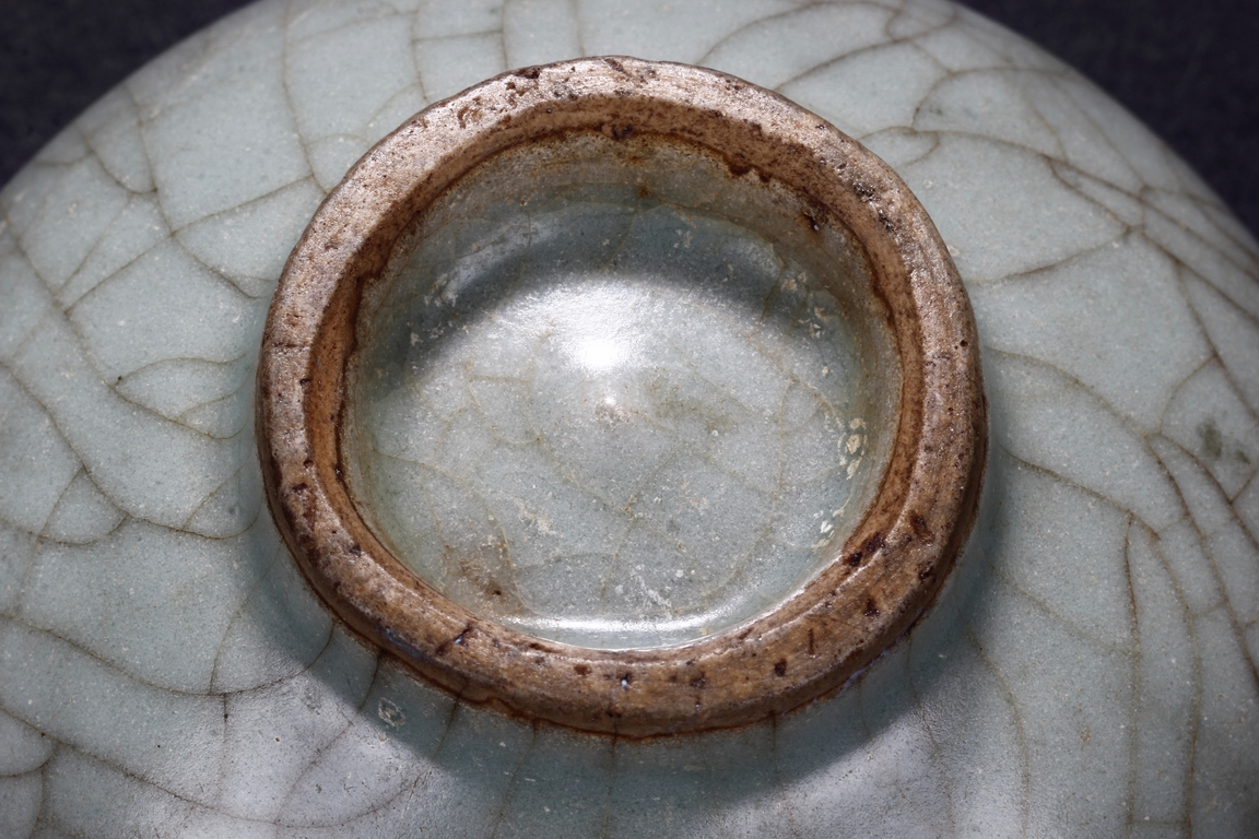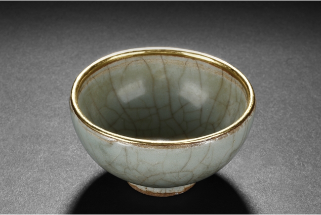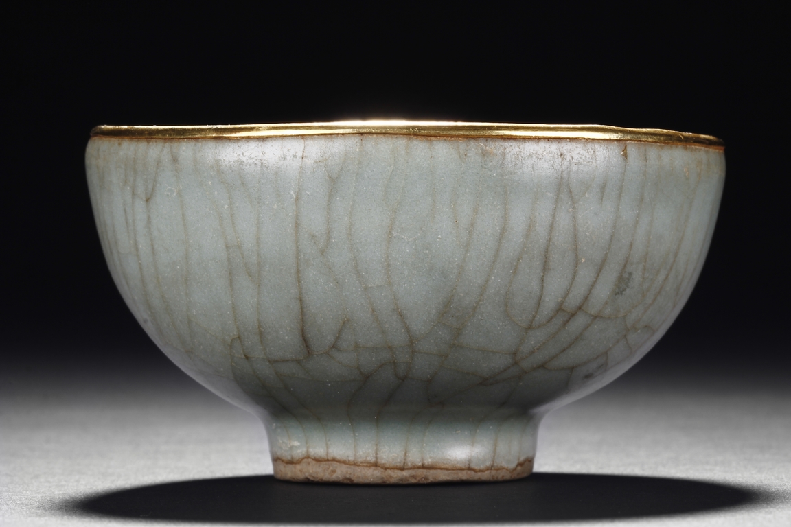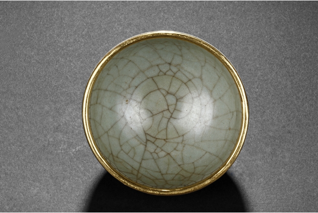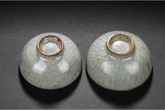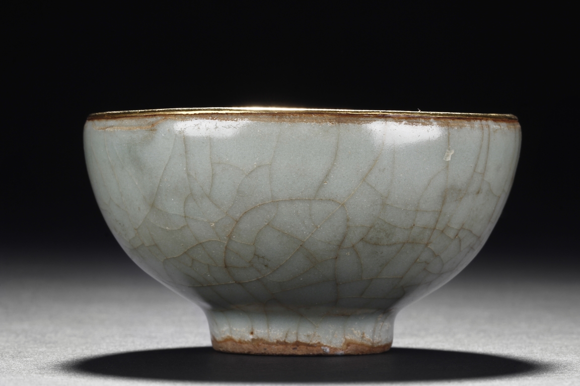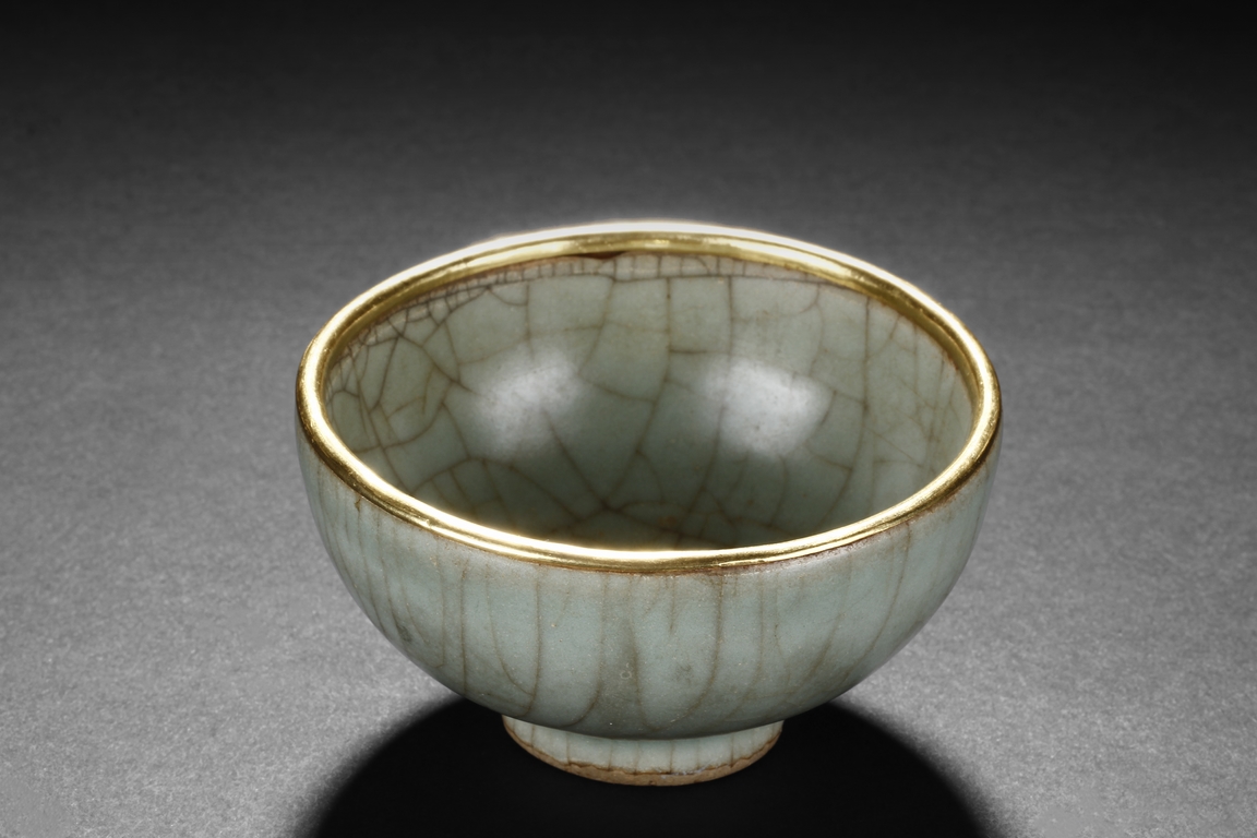 The pair of bowls tapers smoothly to the straight foot ring, the body glazed in celadon with crackle patterns, the rims covered in gilt bronze, the interior with similar design, and the bottom foot ring unglazed.