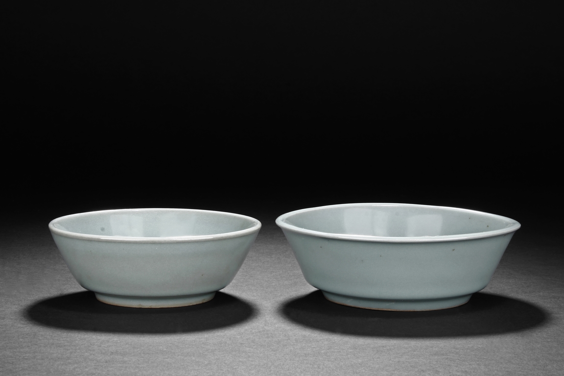 Each bowl is supported on a circular foot ring, with gentle sides rising to a flared rim, the exterior covered overall in a glaze of sky-blue tone. Song Dynasty period.