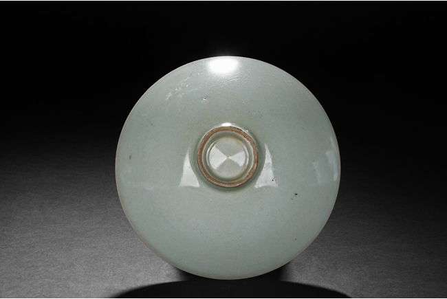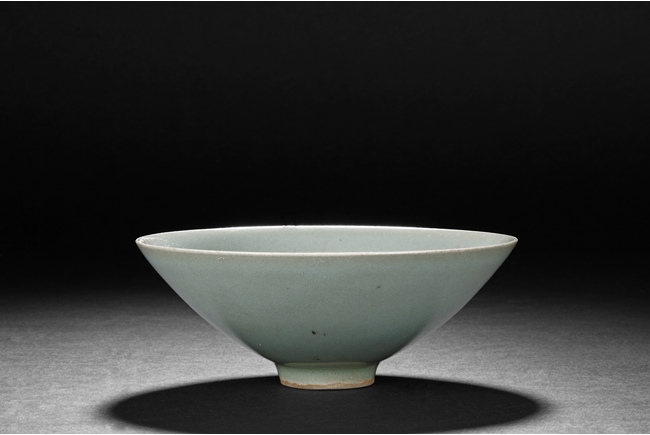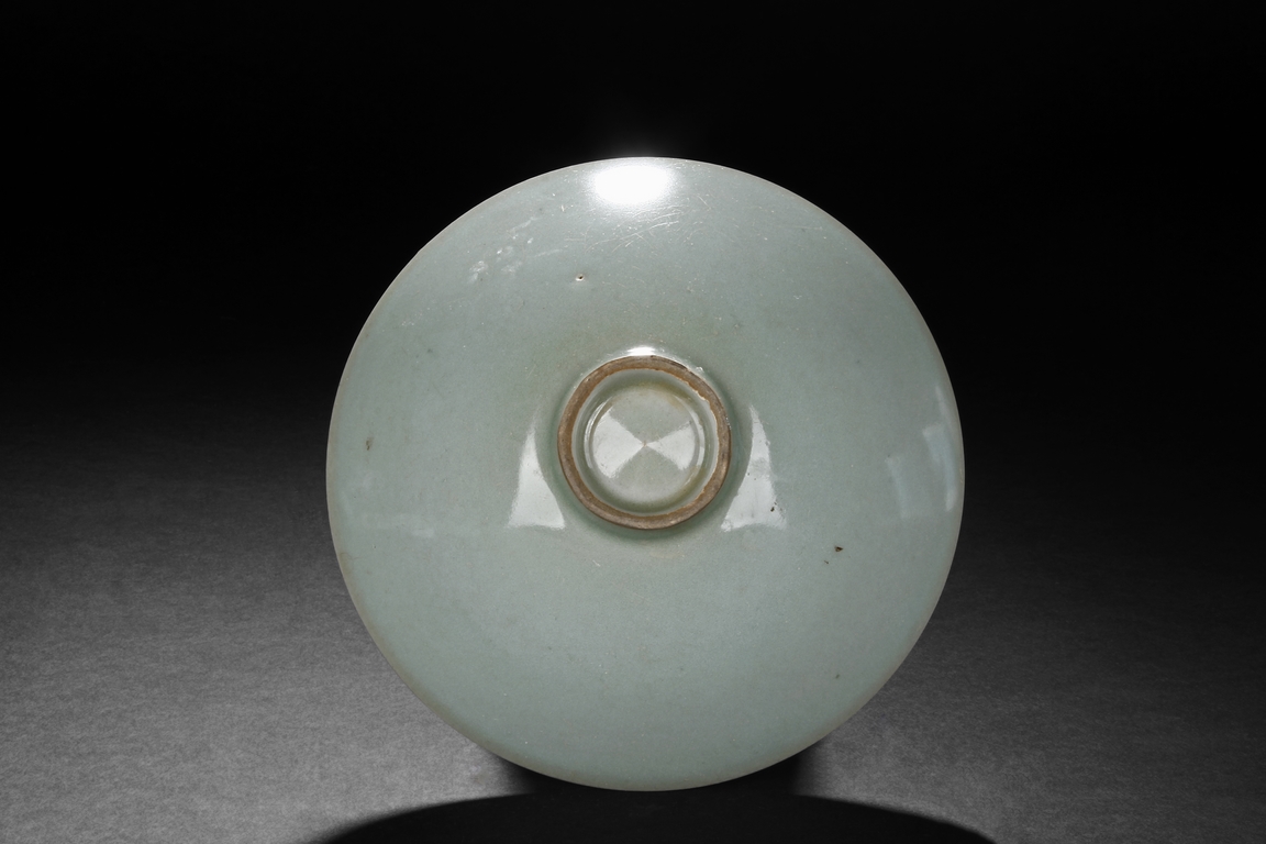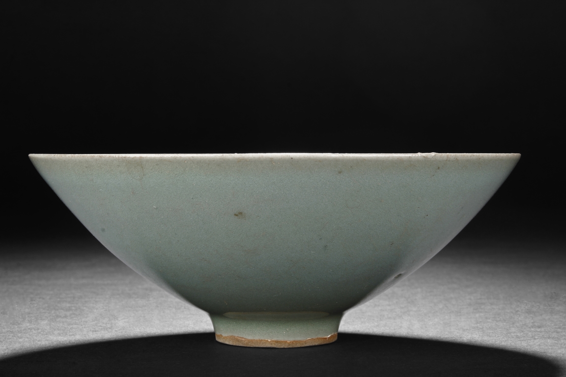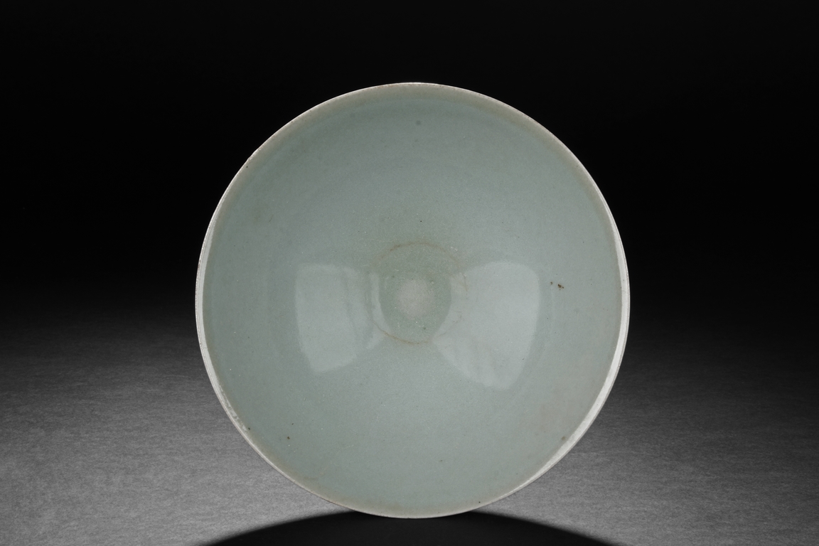 The bowl of reverse conical form, similar to conical hats, beautifully glazed in celadon, the bottom ring unglazed. Song Dynasty period.