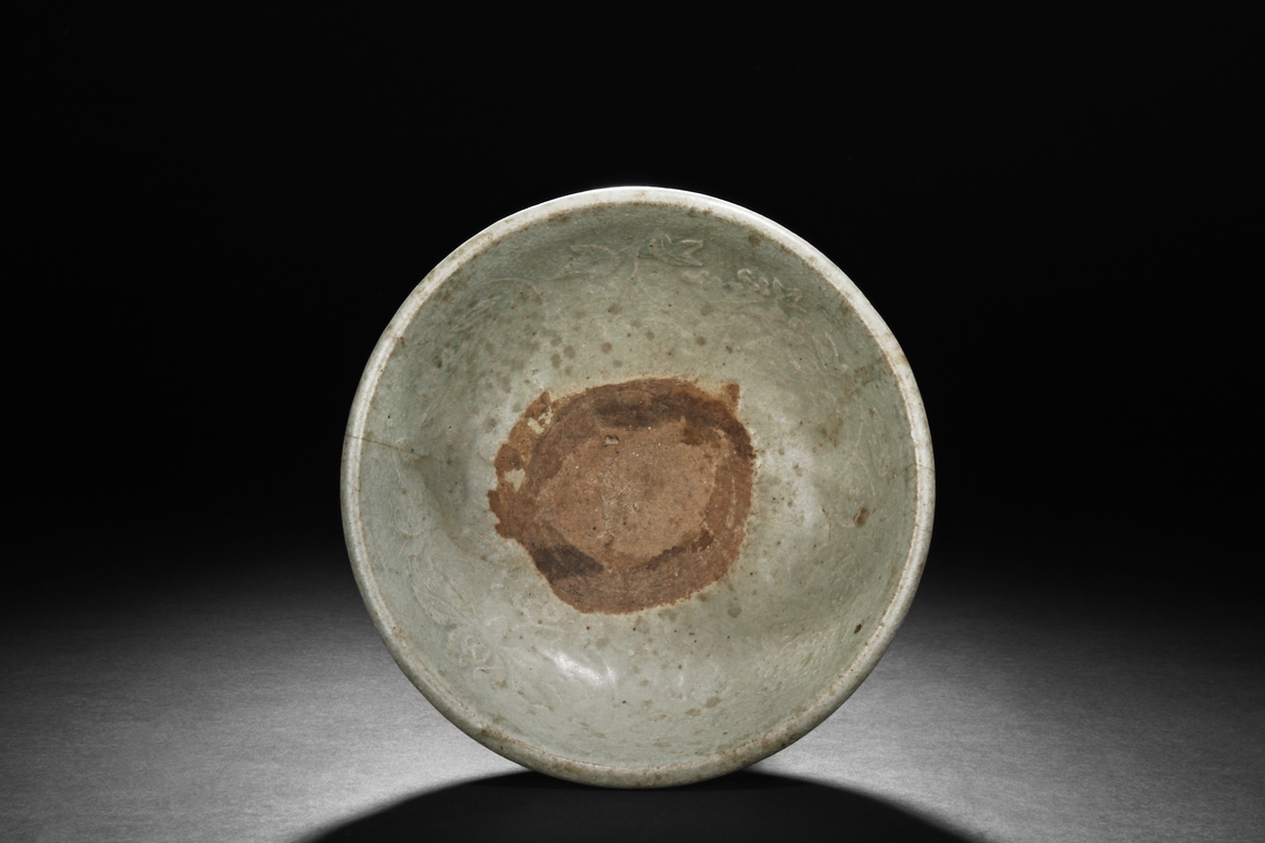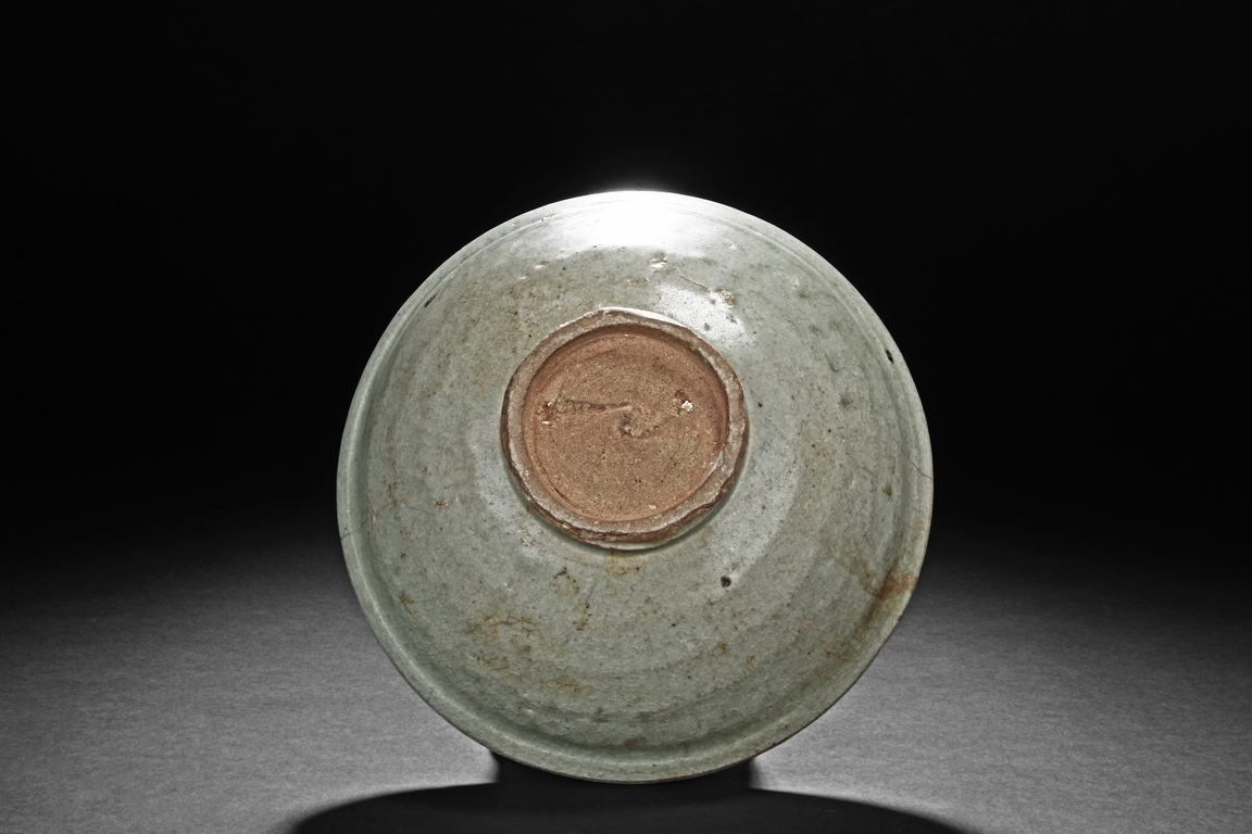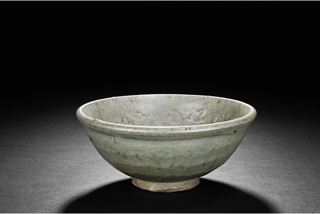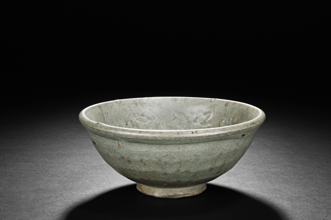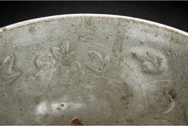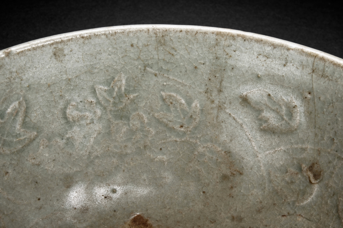 The bowl's exterior bears layer-like patterns, the interior impressed with flowers and leaves patterns, glazed in celadon with crackle, the bottom unglazed. Song Dynasty period.