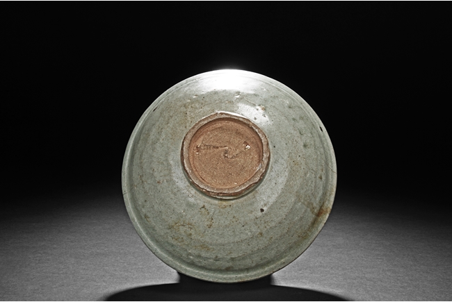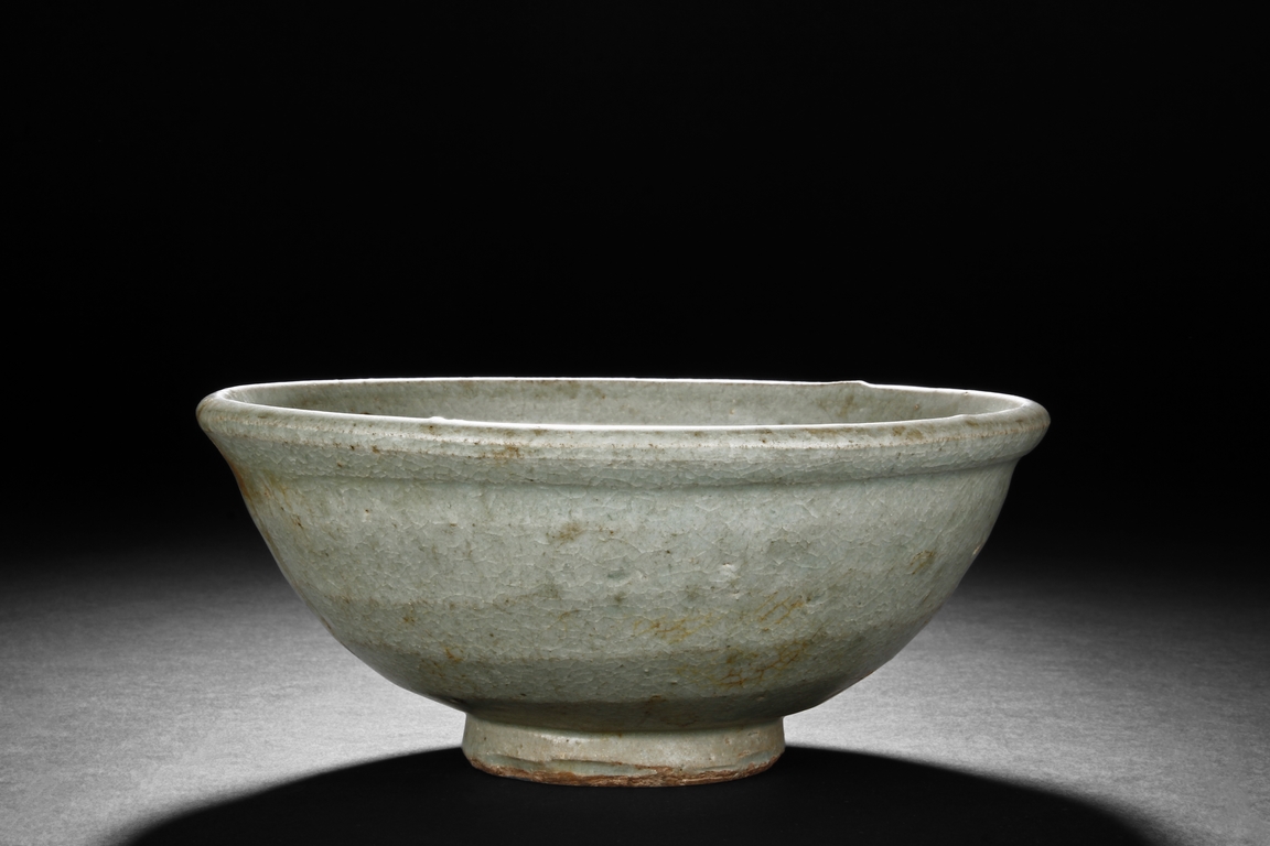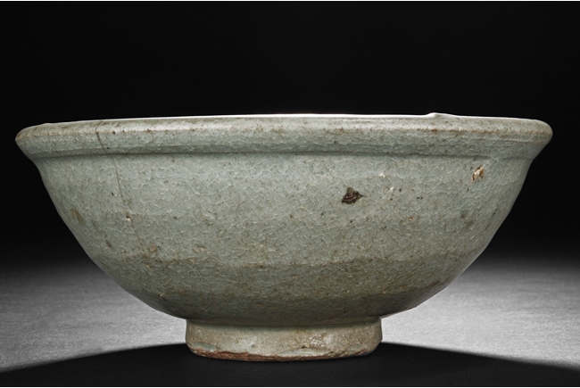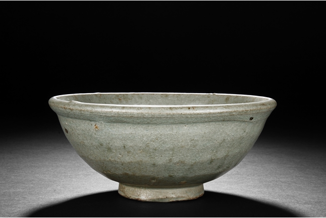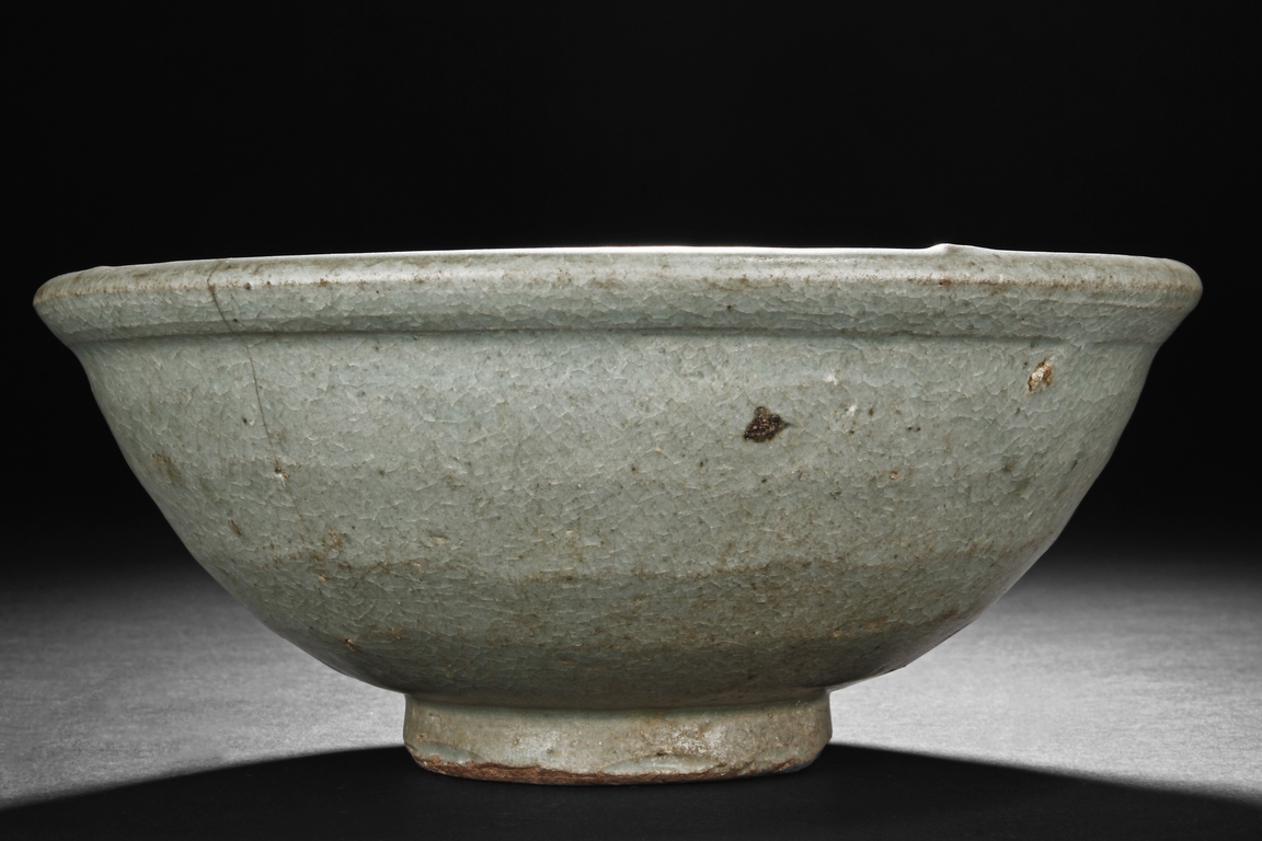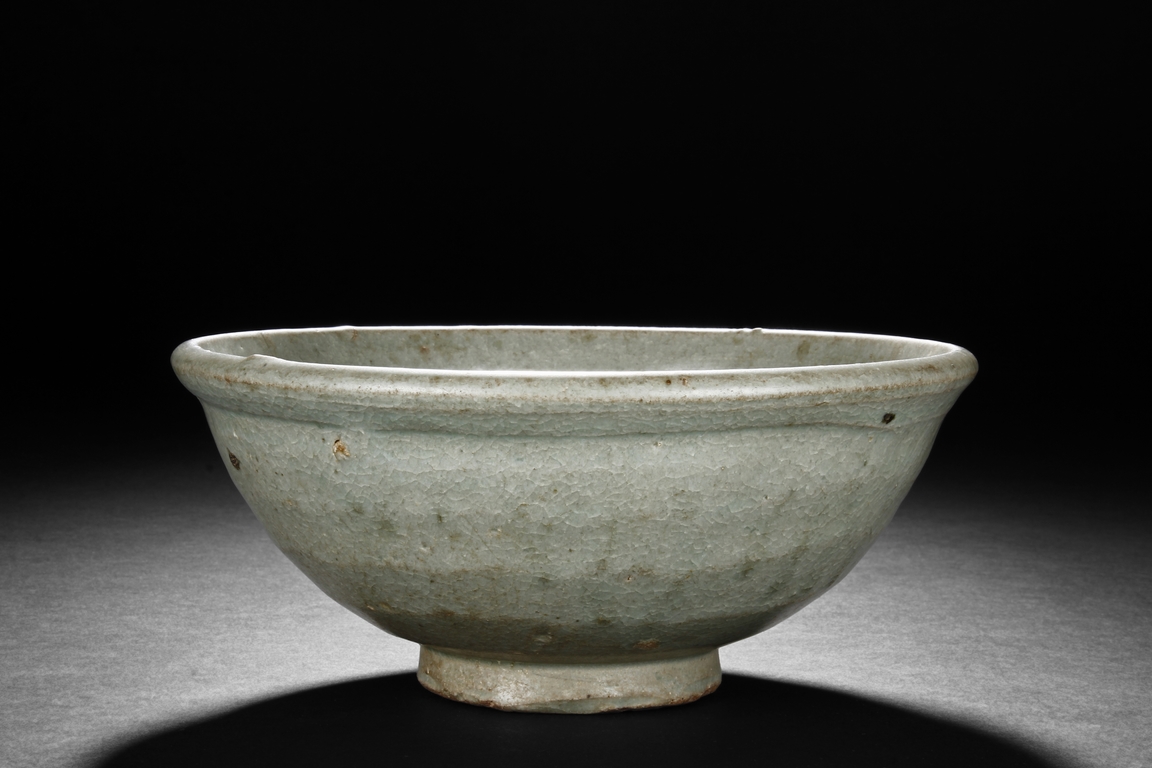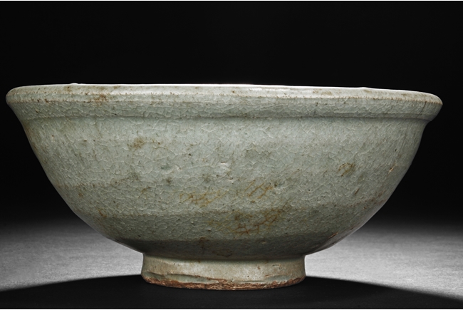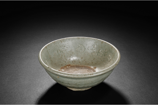 The bowl's exterior bears layer-like patterns, the interior impressed with flowers and leaves patterns, glazed in celadon with crackle, the bottom unglazed. Song Dynasty period.