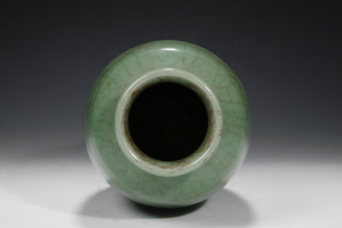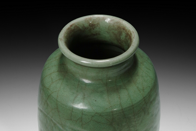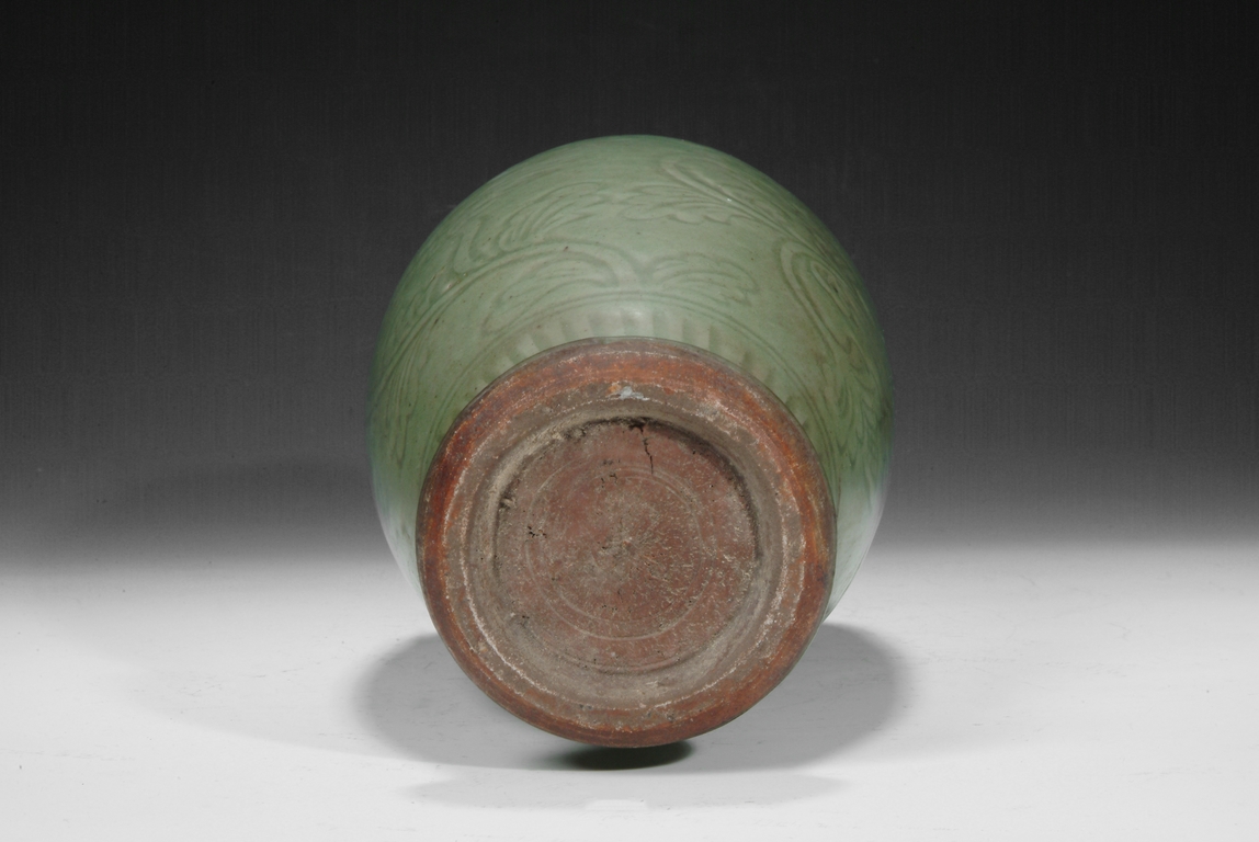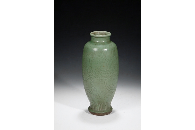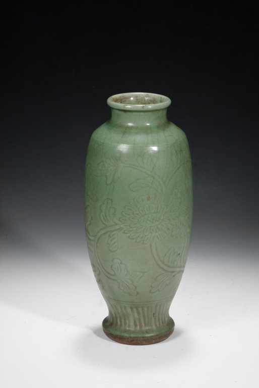 A Longquan celadon tall vase, the body carved with two branches of chrysanthemum blossoms. The unglazed base is burned in dark brown color. Ming Dynasty period.