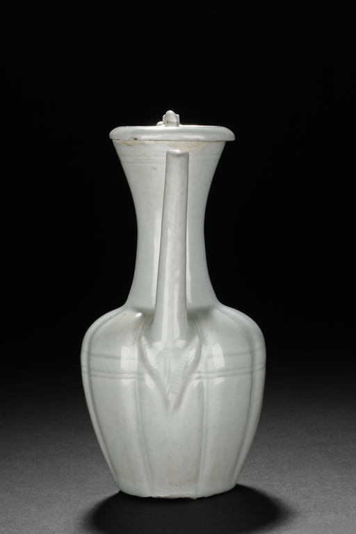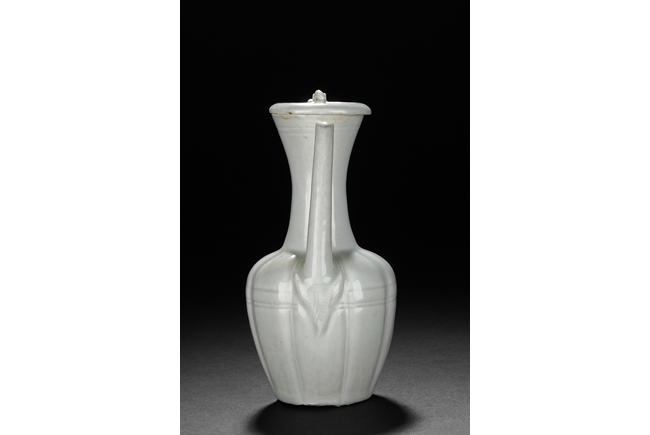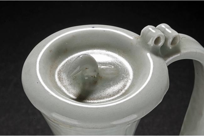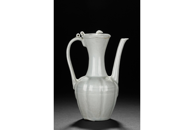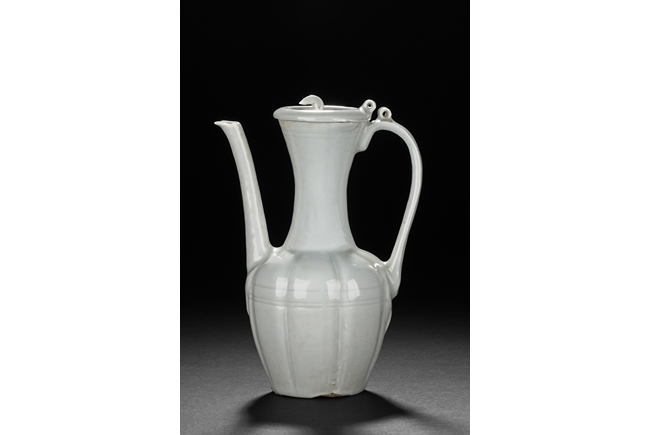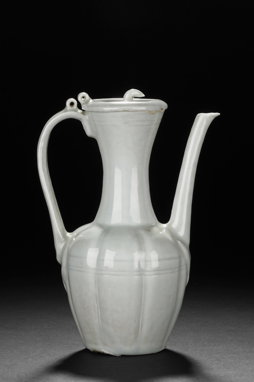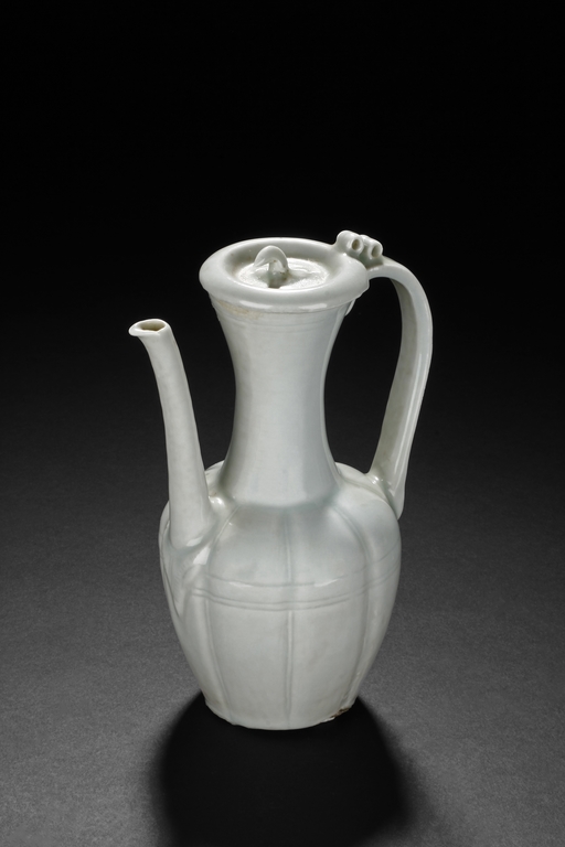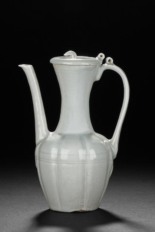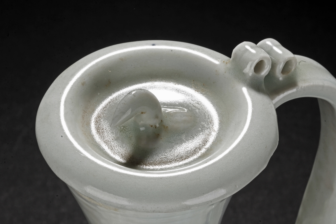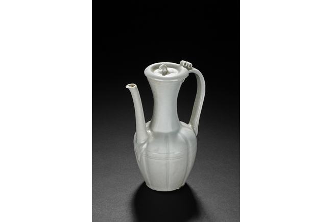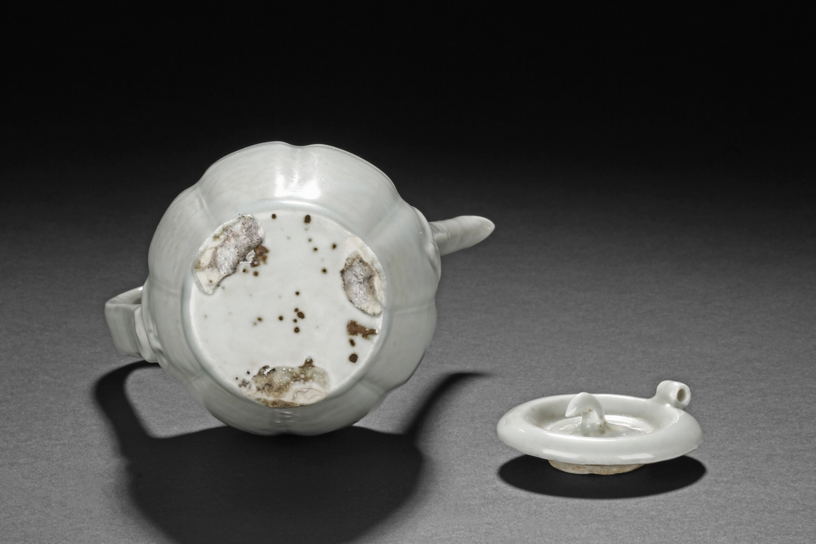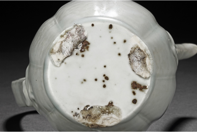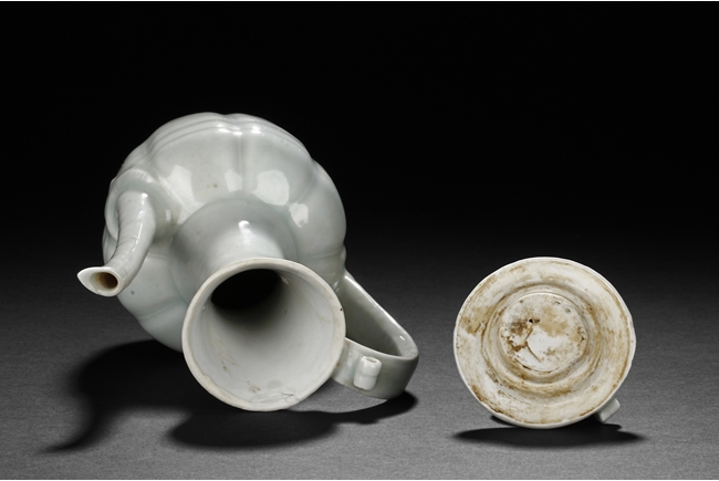 The water pot elegantly crafted with floriform body, waisted long neck, tall spout and handles, the body glazed in celadon, and bottom with burn marks. Song Dynasty period.