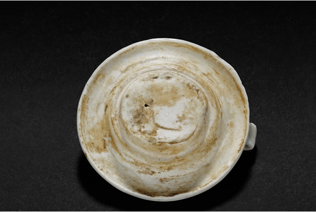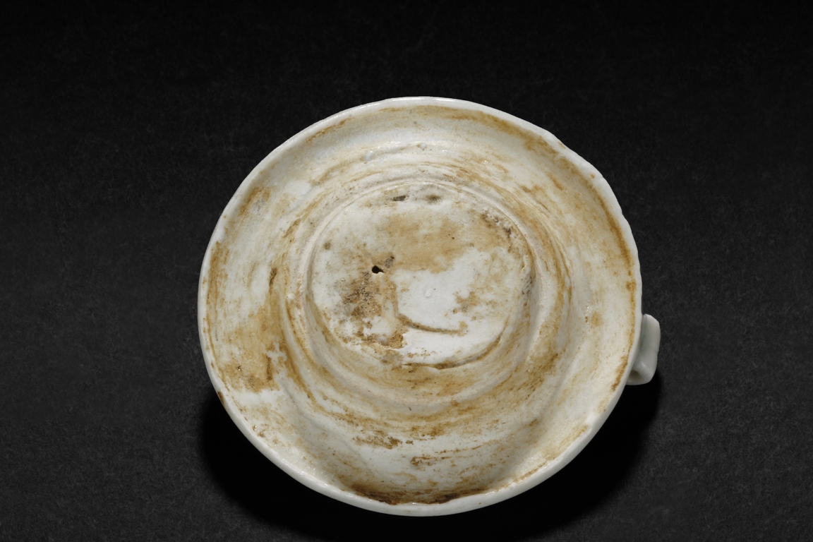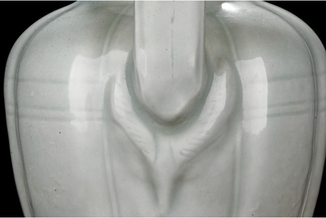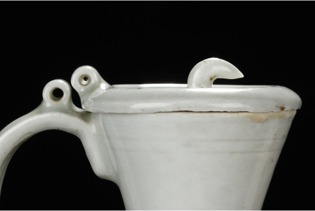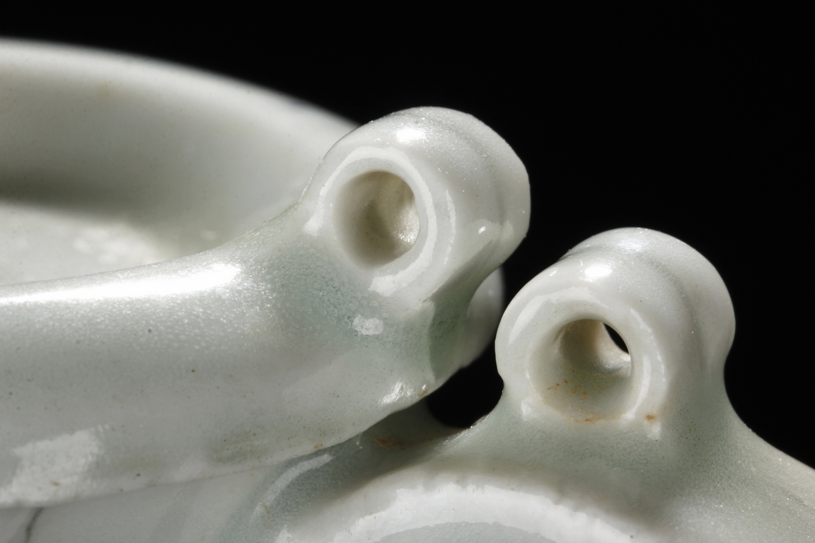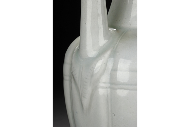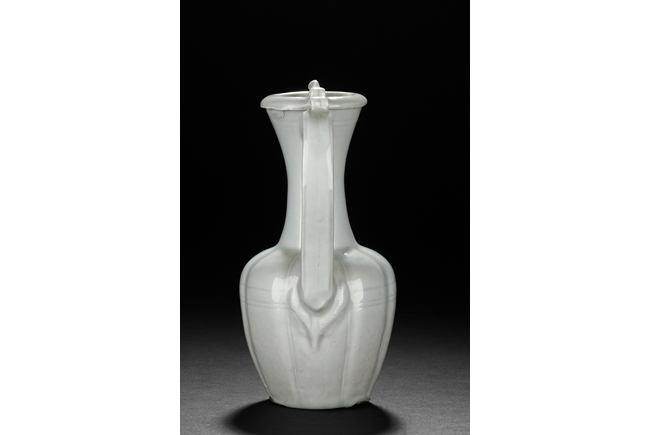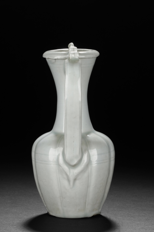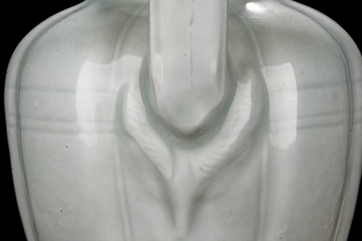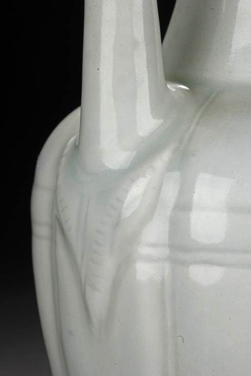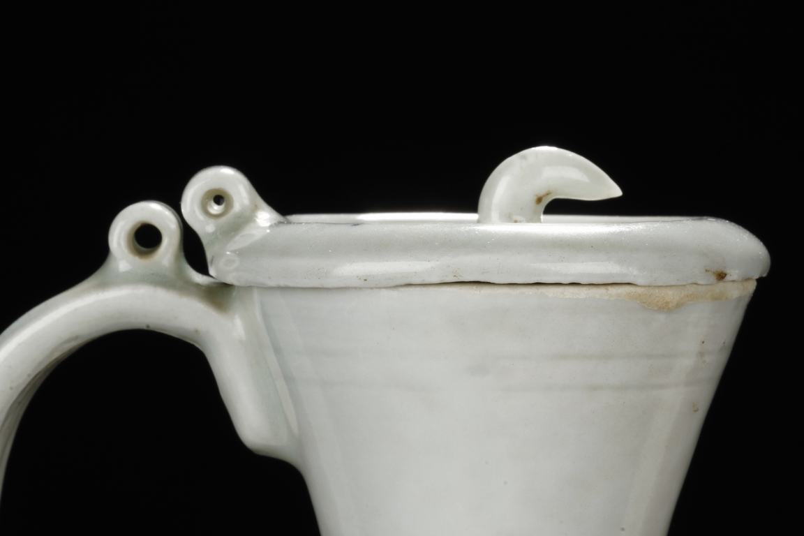 The water pot elegantly crafted with floriform body, waisted long neck, tall spout and handles, the body glazed in celadon, and bottom with burn marks. Song Dynasty period.