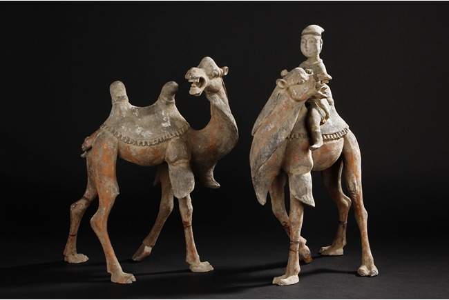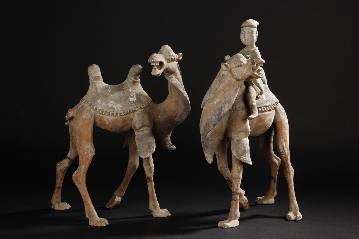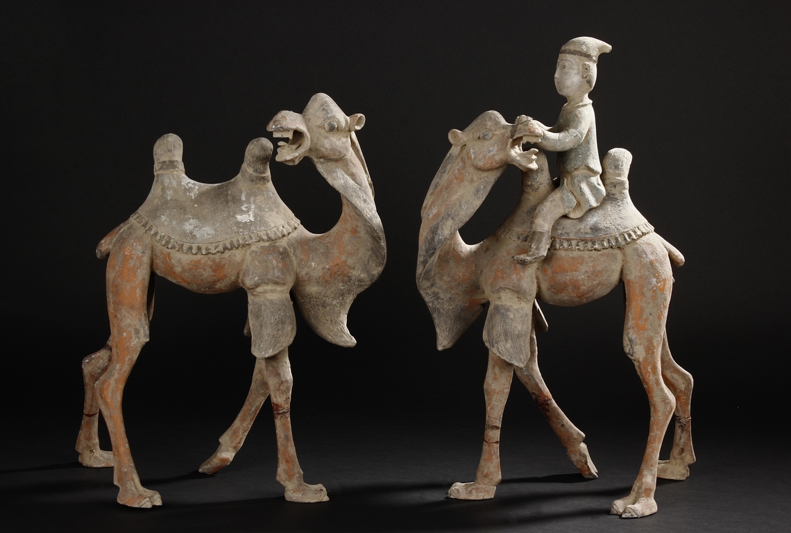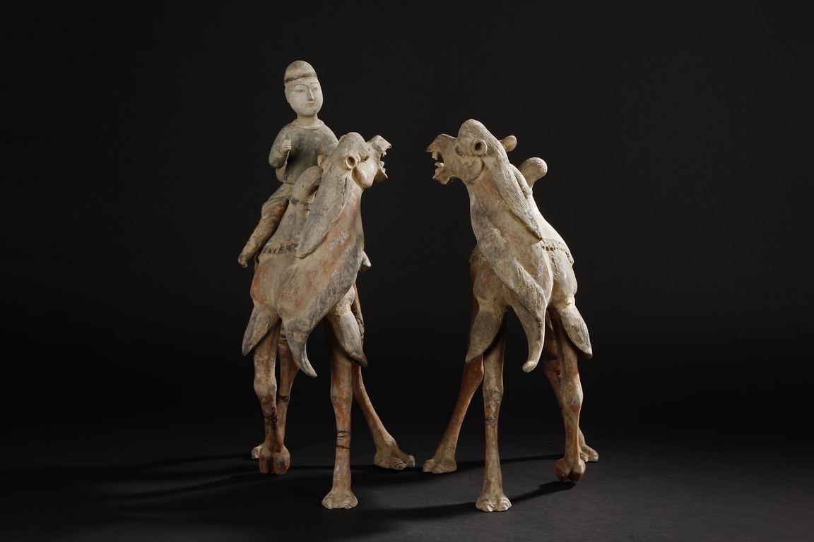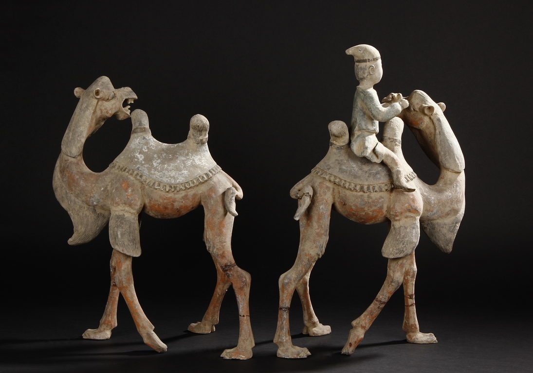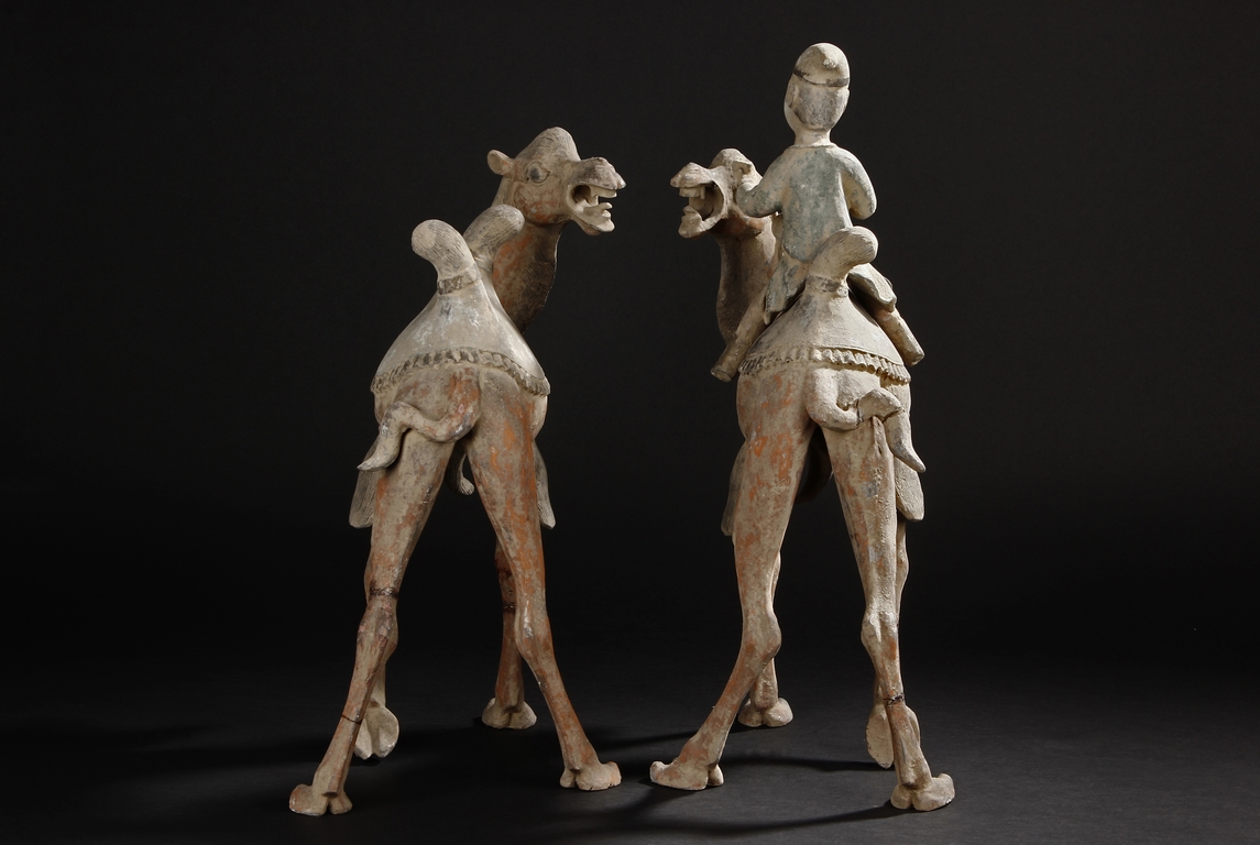 Each camel is shown in walking motion with head turned sideways, the back and humps covered with saddle and one rider on top, the body painted in various pigemetns. Signs of repair on the legs. Tang Dynasty period.