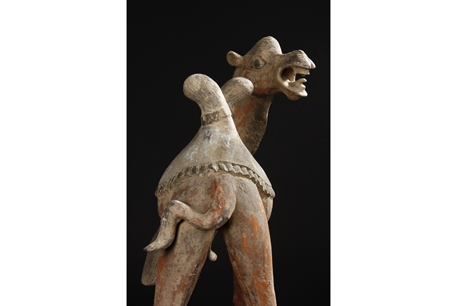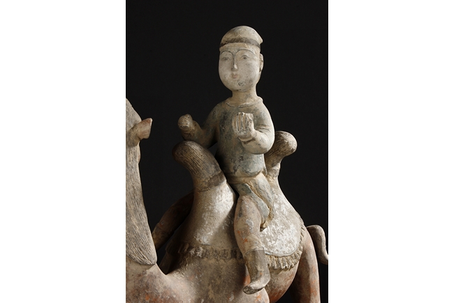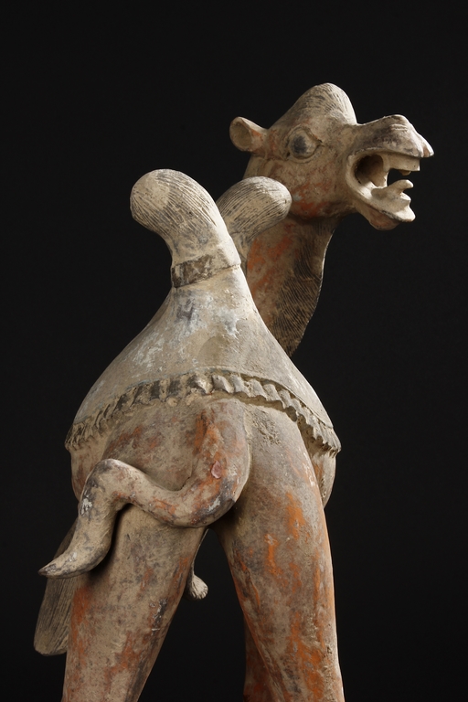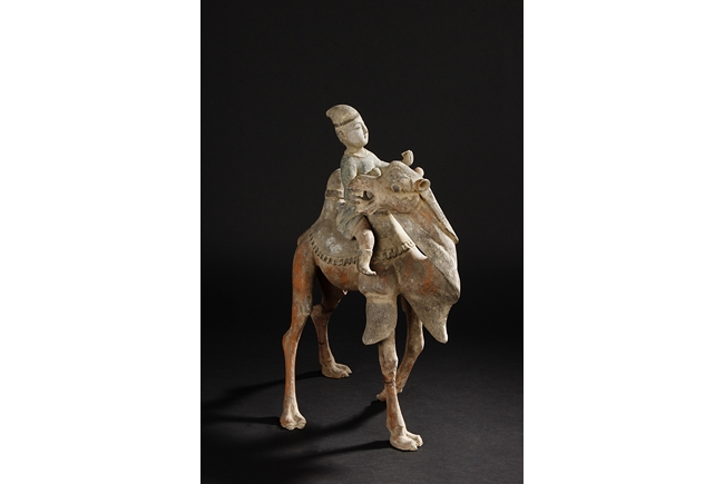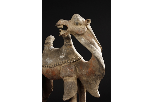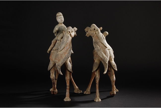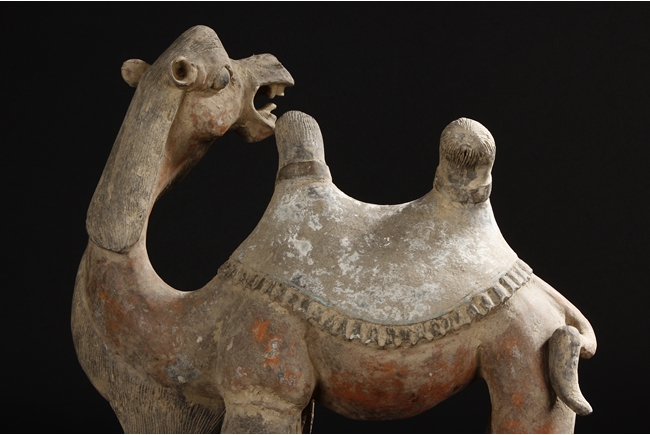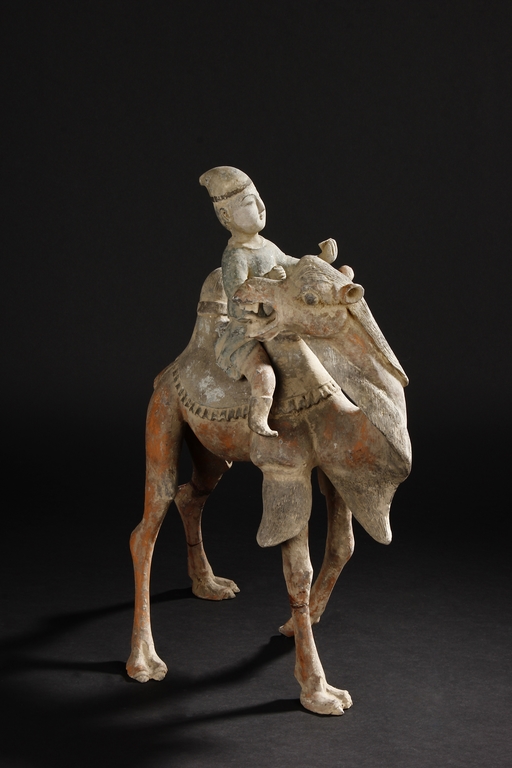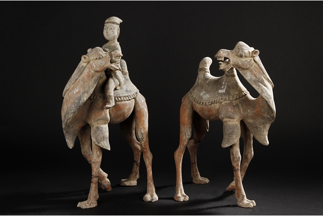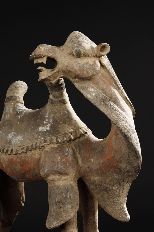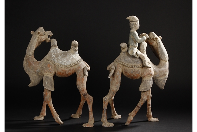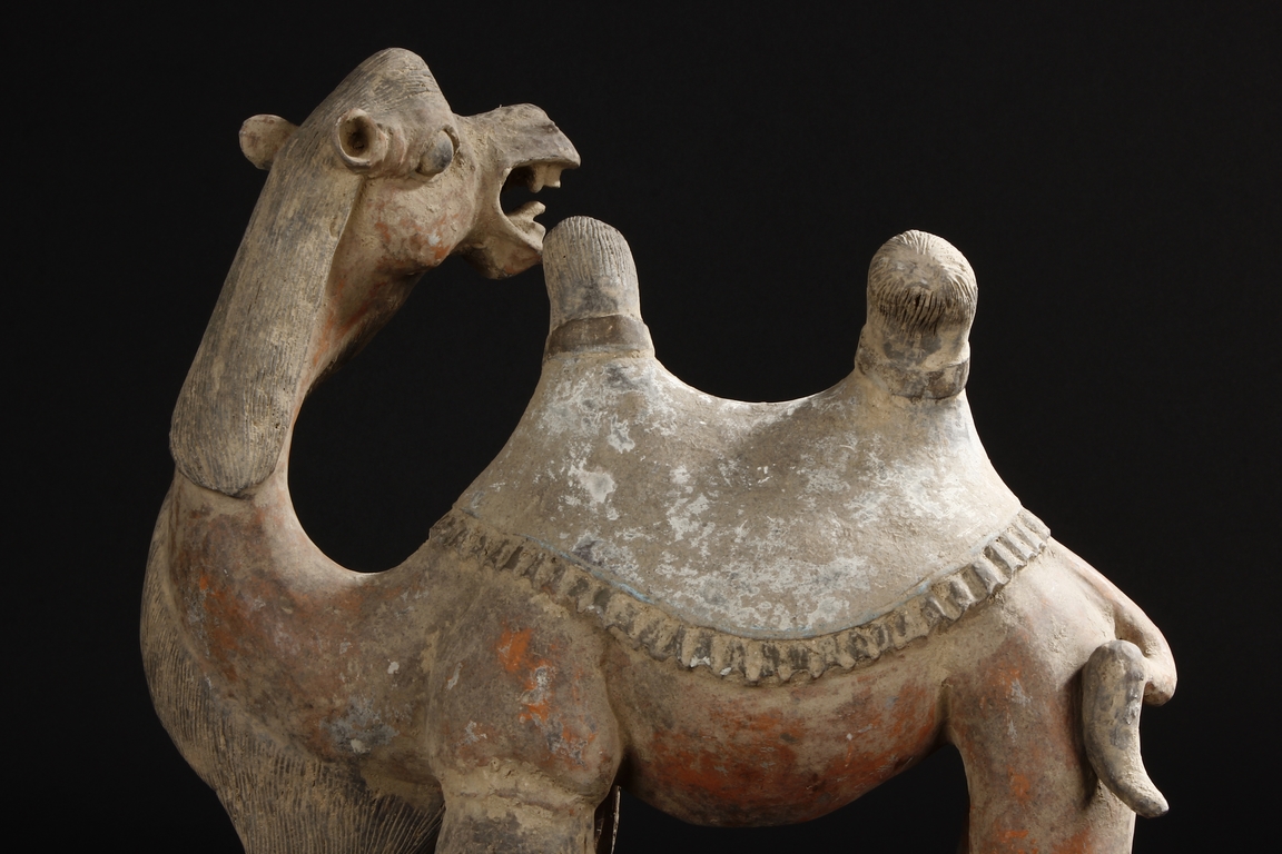 Each camel is shown in walking motion with head turned sideways, the back and humps covered with saddle and one rider on top, the body painted in various pigemetns. Signs of repair on the legs. Tang Dynasty period.