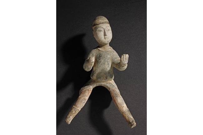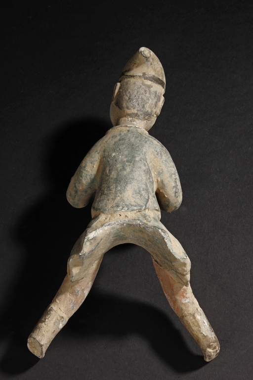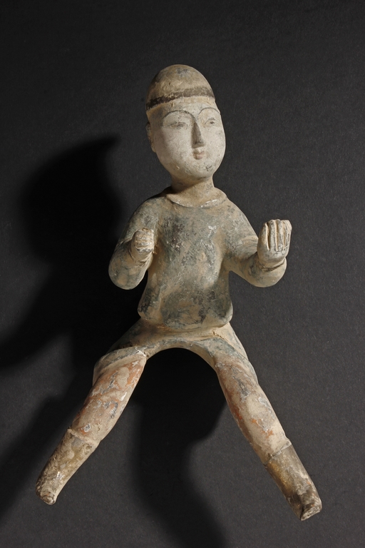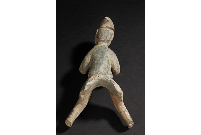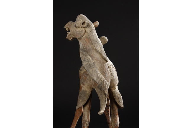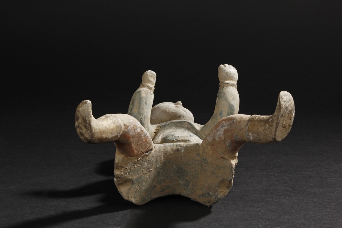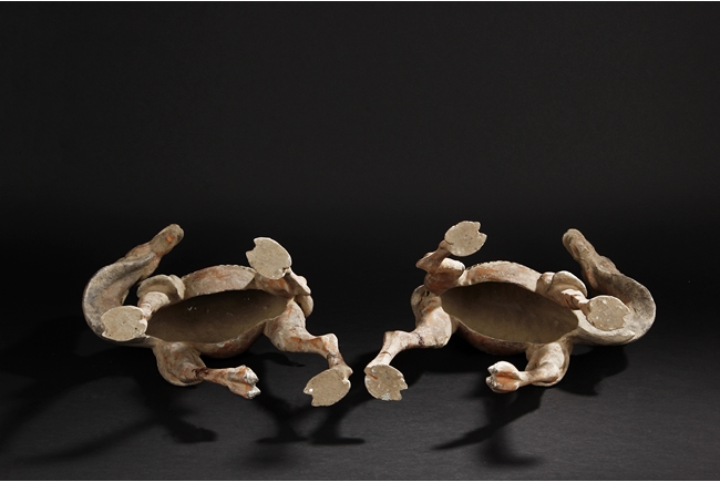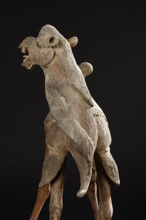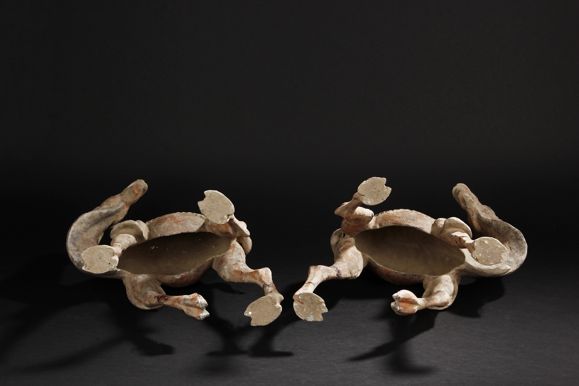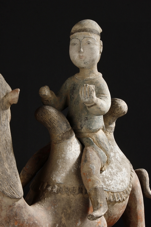 Each camel is shown in walking motion with head turned sideways, the back and humps covered with saddle and one rider on top, the body painted in various pigemetns. Signs of repair on the legs. Tang Dynasty period.