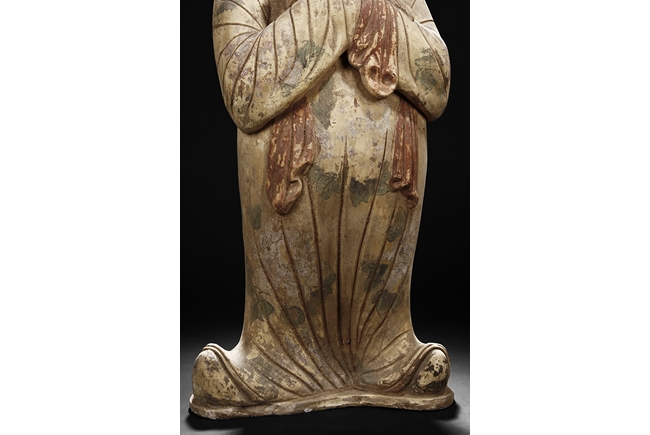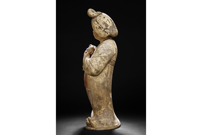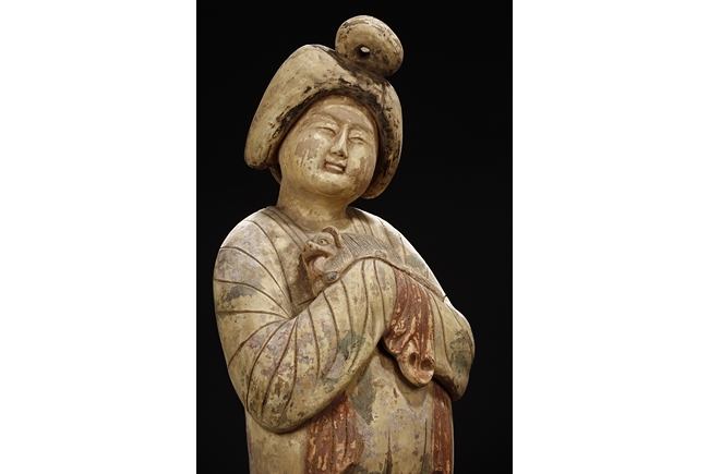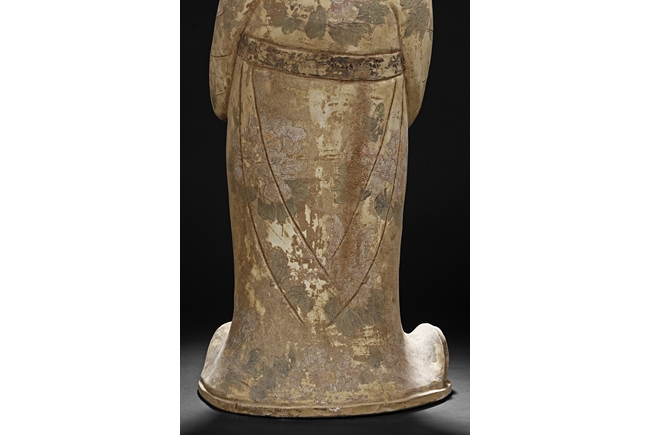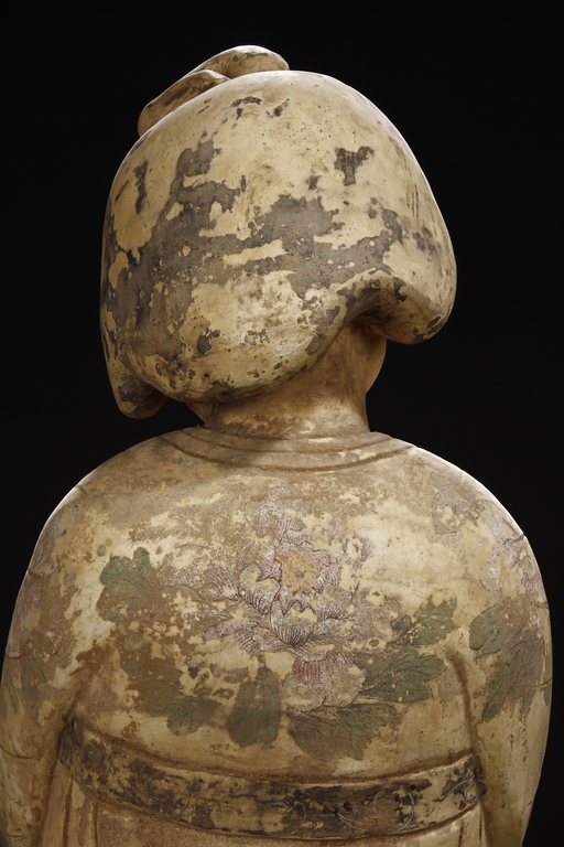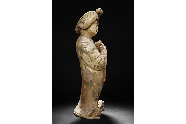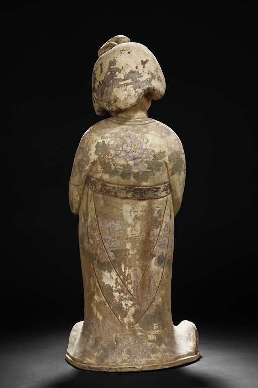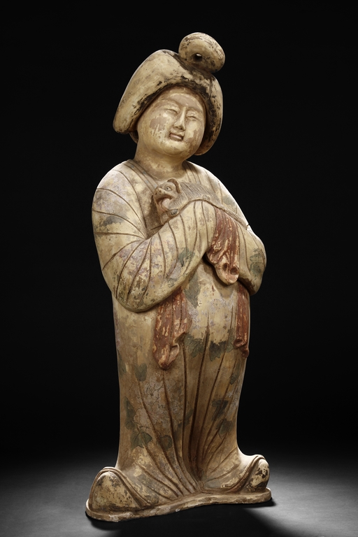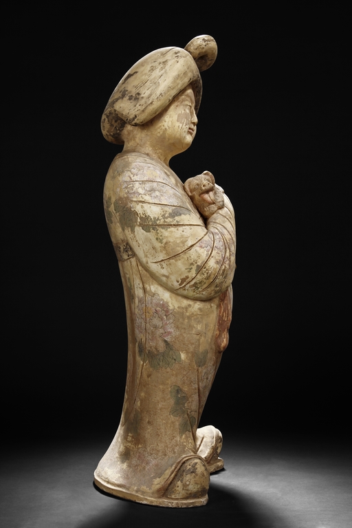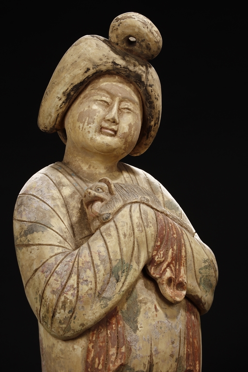 Shown with hands clasped and hidden in the long sleeve while holding a pet, the female figure wears a loose robe incised with lines to show the folds and decorated with flowers and leaves, the round face shown with delicate features. Extensive pigment loss throughout. Tang Dynasty period.
