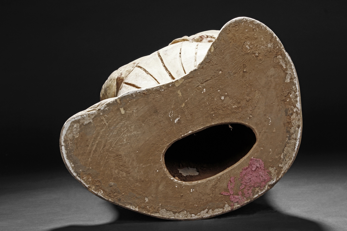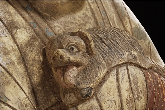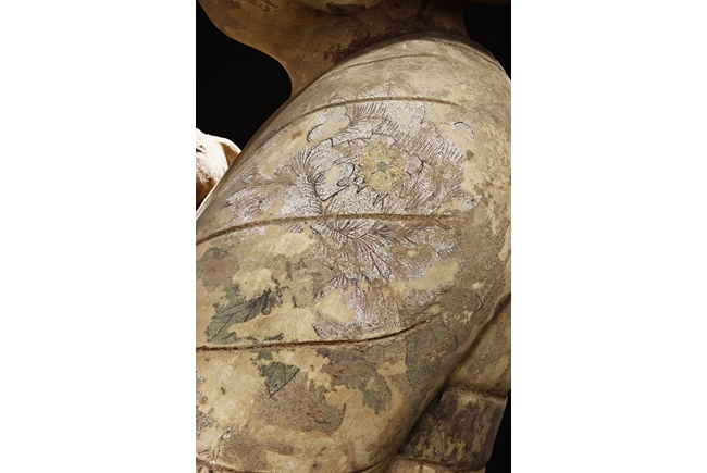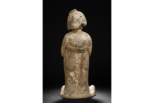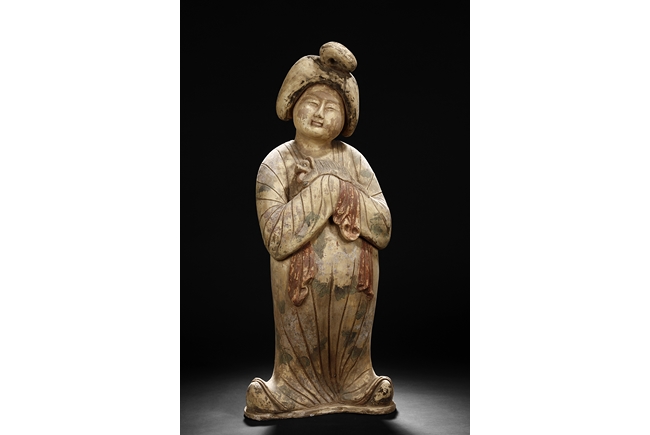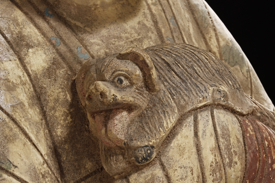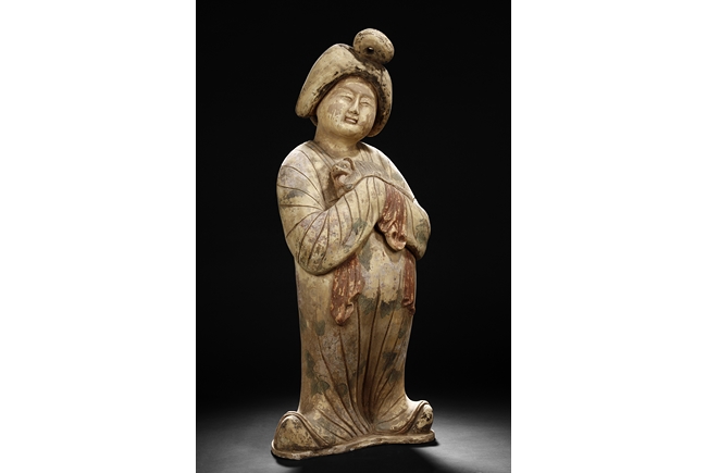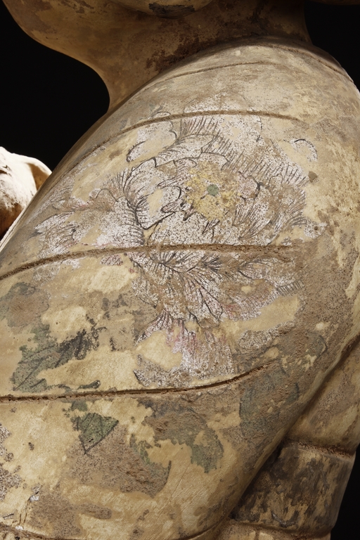 Shown with hands clasped and hidden in the long sleeve while holding a pet, the female figure wears a loose robe incised with lines to show the folds and decorated with flowers and leaves, the round face shown with delicate features. Extensive pigment loss throughout. Tang Dynasty period.