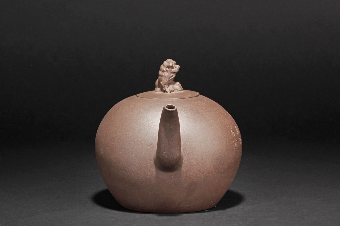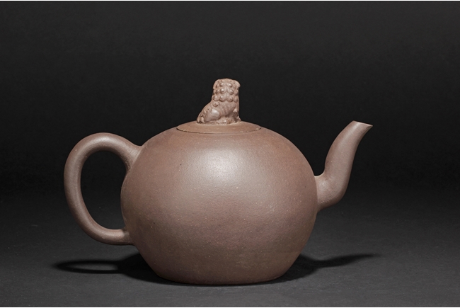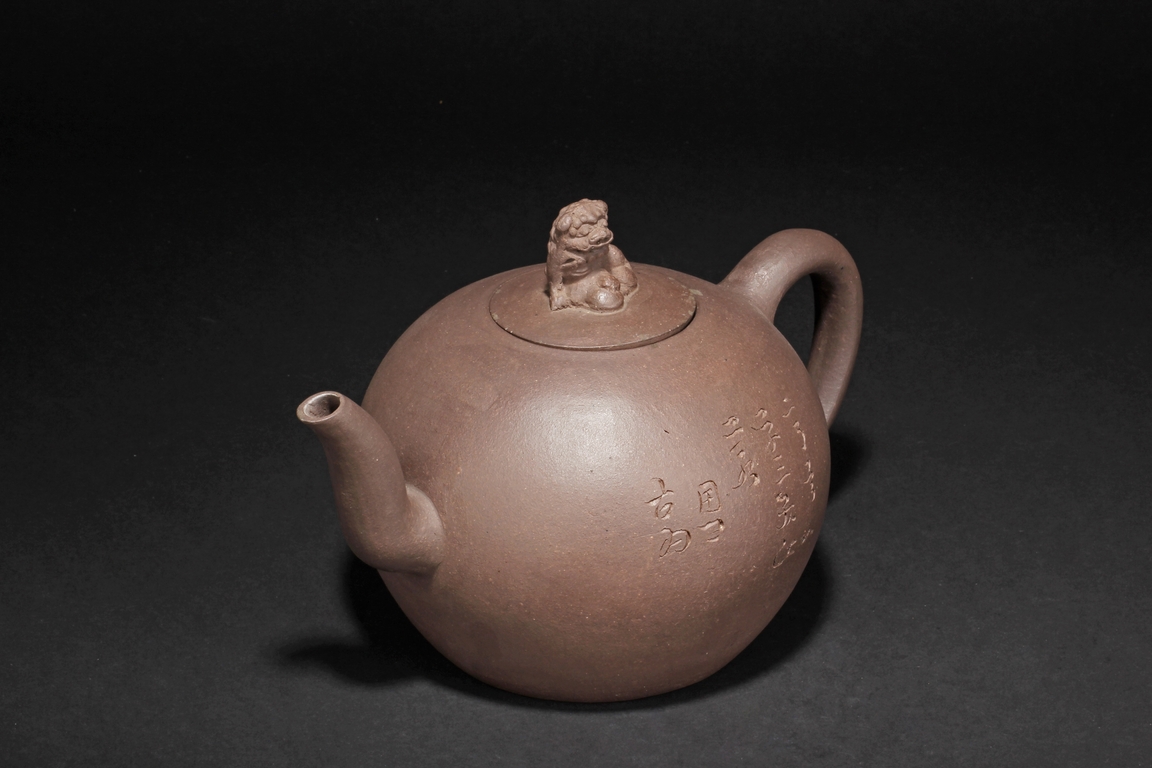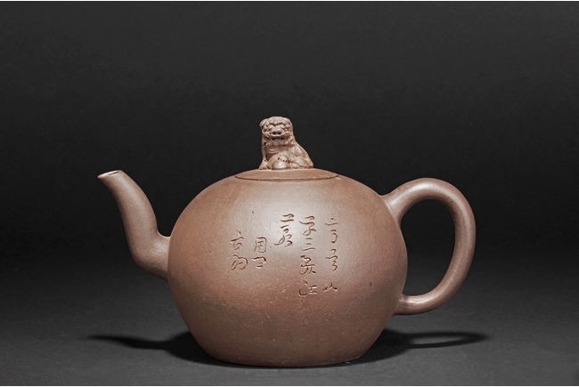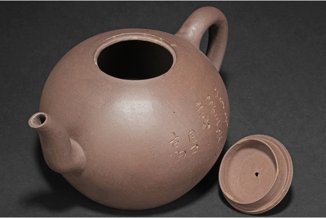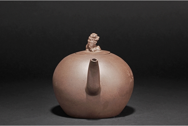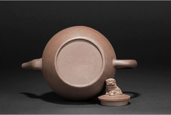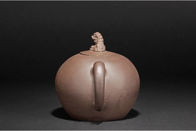 用卿製壺以渾成醇飾稱道。此壺泥色紫褐,砂質隱現,包漿內斂沉穩,通體為圓球形,三彎流,無頸,嵌入式口蓋,臥獅捧繡球蓋鈕,型製碩大,氣勢磅礴,題書與落款皆為草書,並斜向一邊,刀法淋漓,十分快意,風格獨特,為其鮮明特色。 陳用卿,明代天啟、崇禎年間宜興製壺高手,生卒不詳,俗名三呆子。