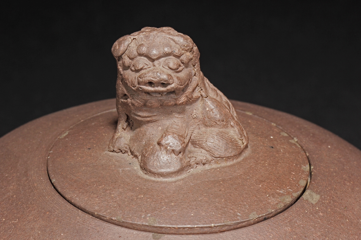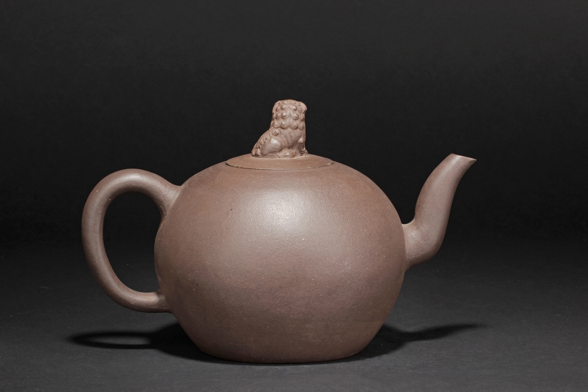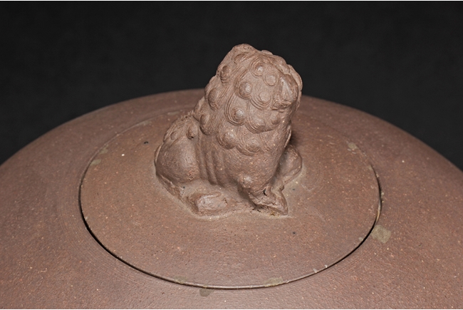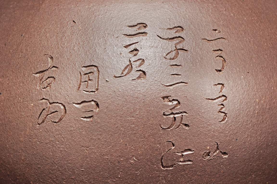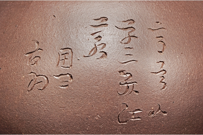 用卿製壺以渾成醇飾稱道。此壺泥色紫褐,砂質隱現,包漿內斂沉穩,通體為圓球形,三彎流,無頸,嵌入式口蓋,臥獅捧繡球蓋鈕,型製碩大,氣勢磅礴,題書與落款皆為草書,並斜向一邊,刀法淋漓,十分快意,風格獨特,為其鮮明特色。 陳用卿,明代天啟、崇禎年間宜興製壺高手,生卒不詳,俗名三呆子。
